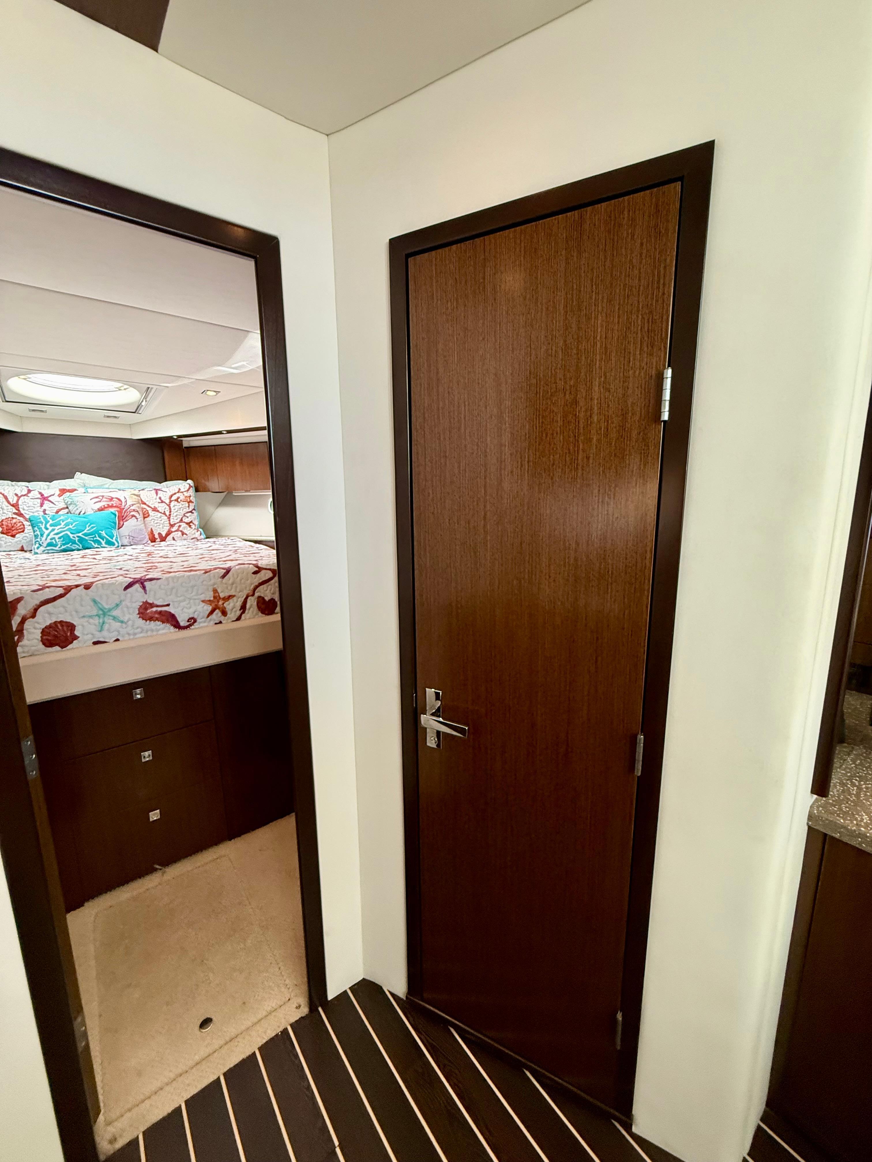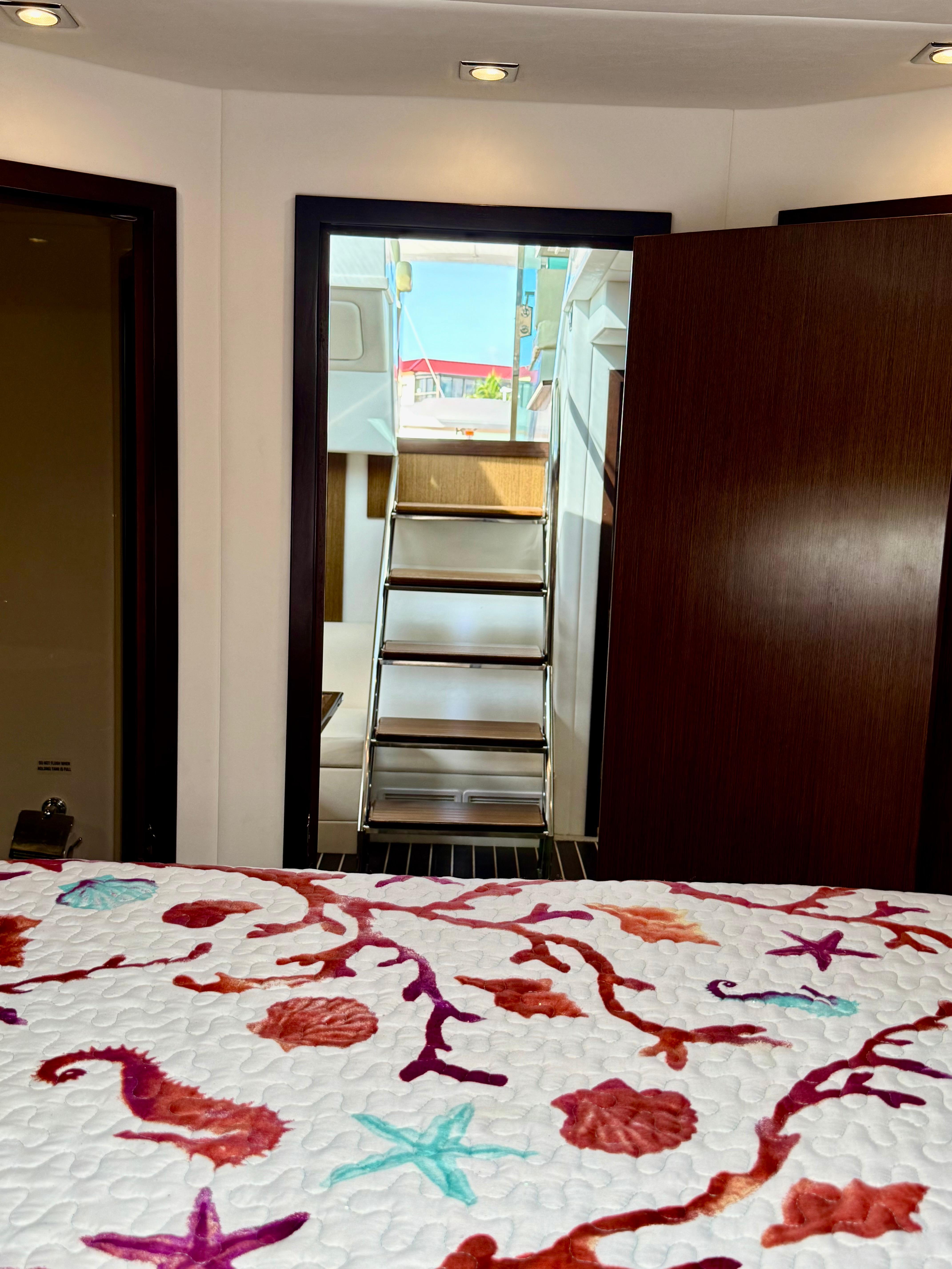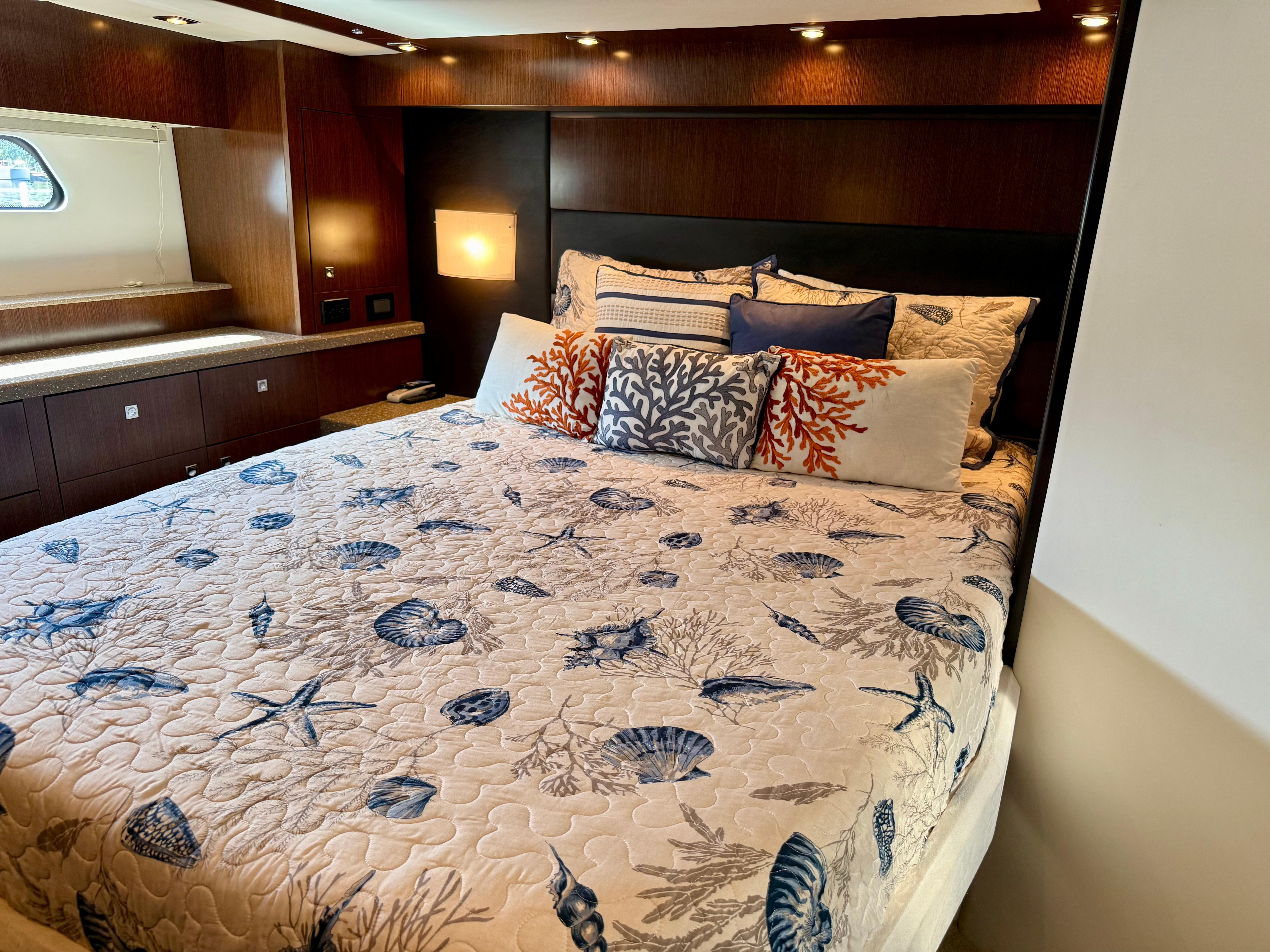 Excellent access to the Master Ensuite Stateroom and Guest Ensuite Stateroom. Forward of the main salon is the guest stateroom with queen berth, custom décor, flat screen TV, carpet, and access to the guest head and separate shower. Aft is the master stateroom with private head, sink and shower, queen berth, custom interior, carpet, hanging lockers, Washer /Dryer and flat screen TV.