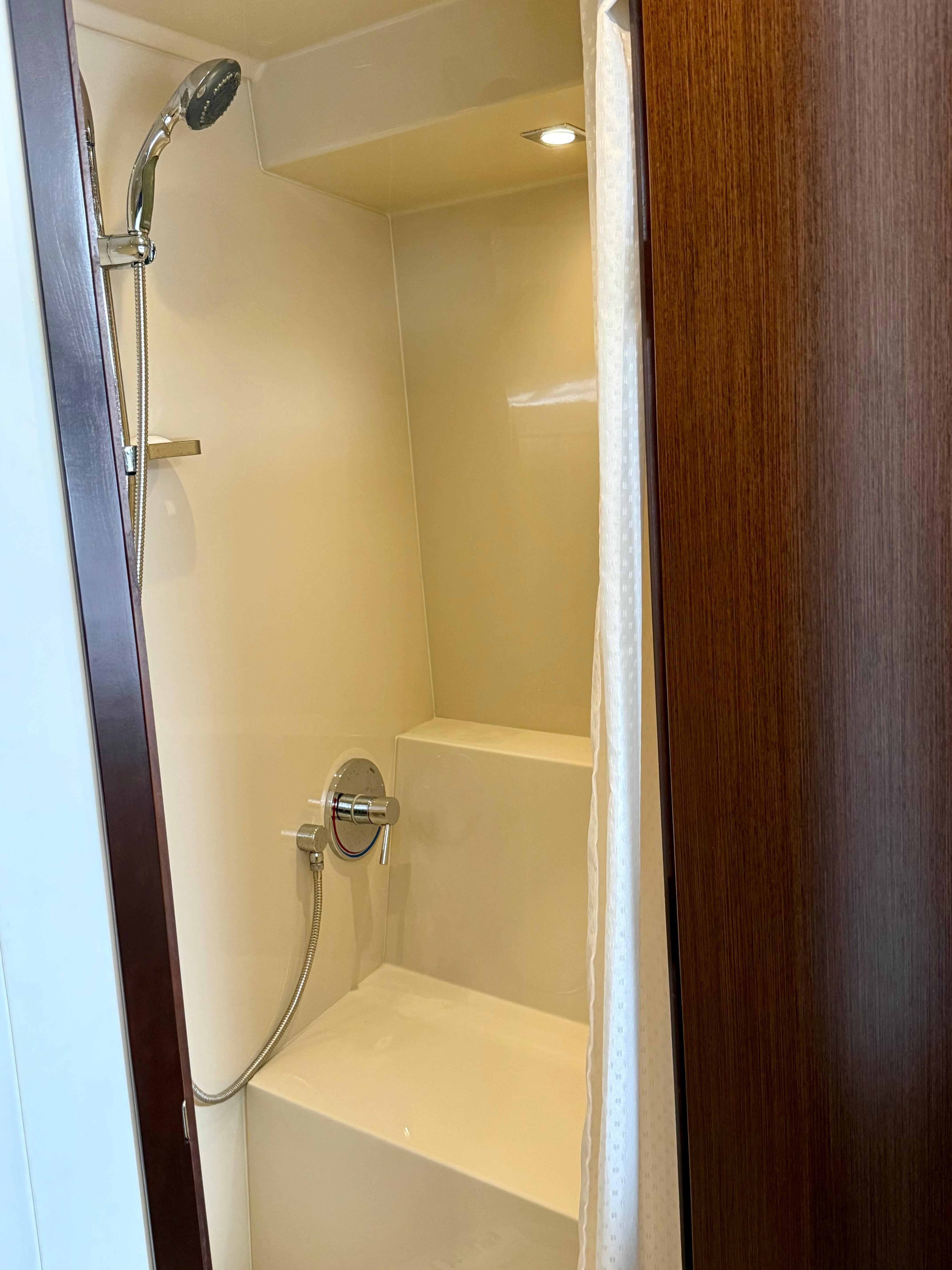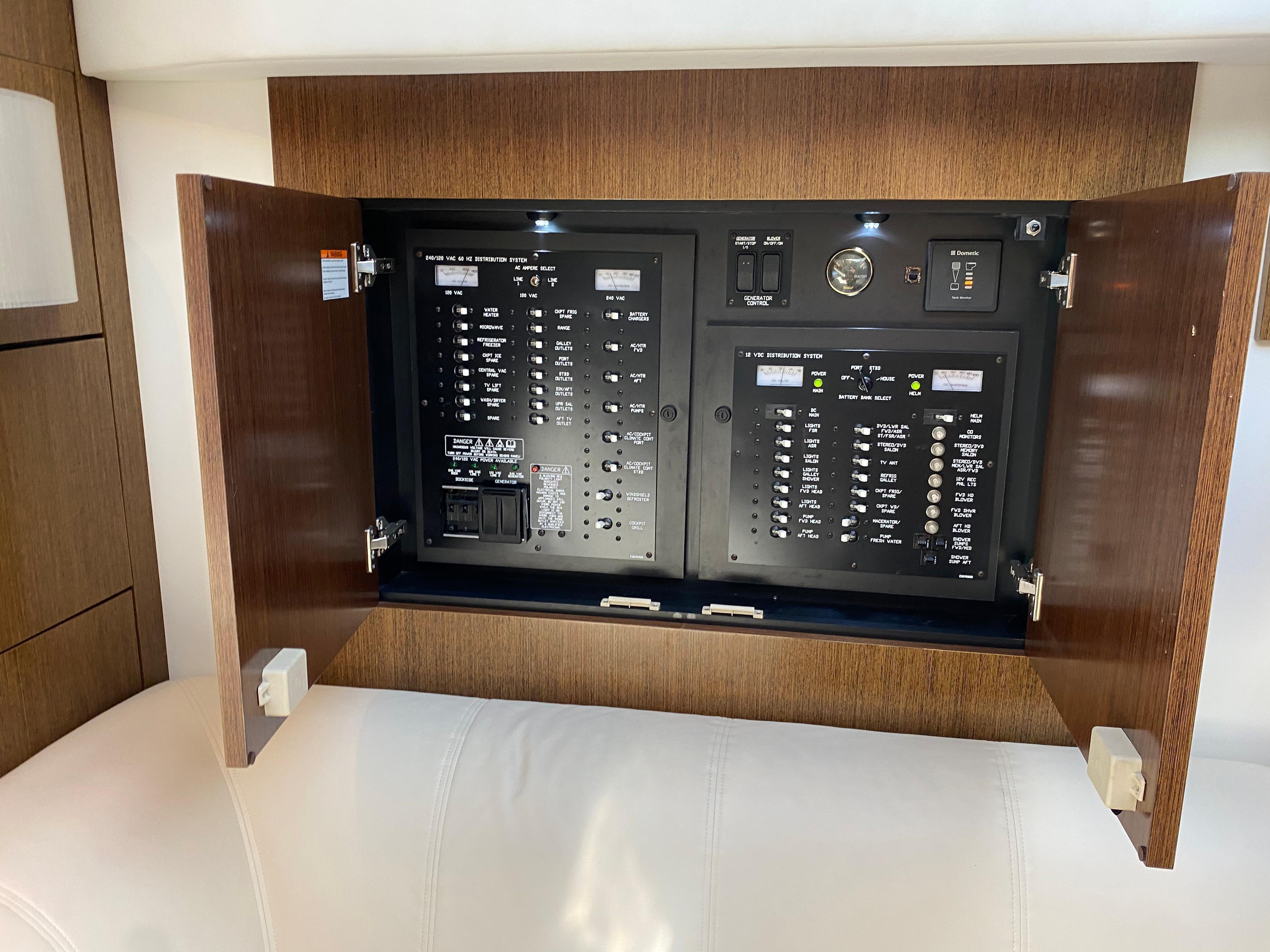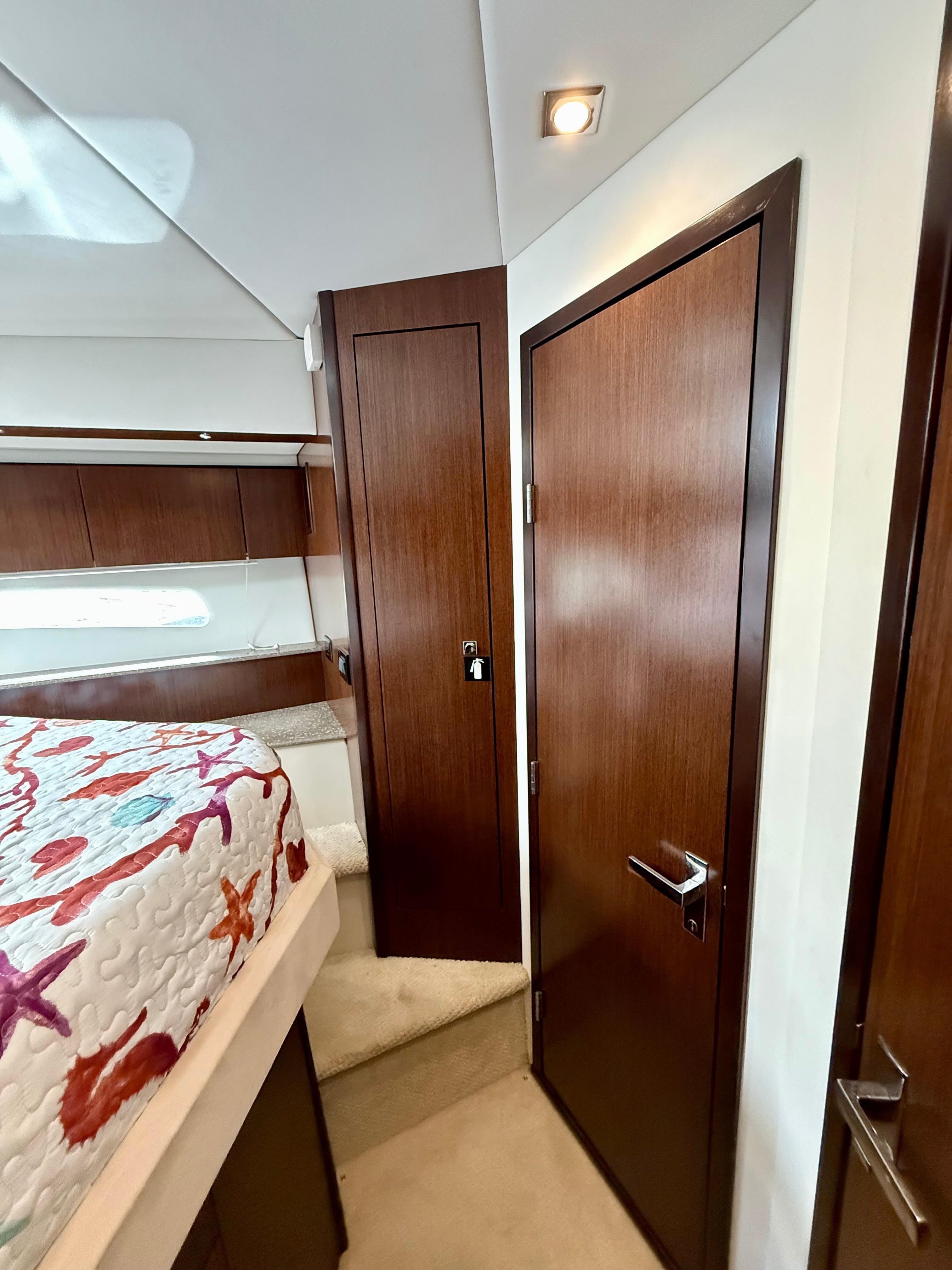 Excellent access to the Master Ensuite Stateroom and Guest Ensuite Stateroom. Forward of the main salon is the guest stateroom with queen berth, custom décor, flat screen TV, carpet, and access to the guest head and separate shower. Aft is the master stateroom with private head, sink and shower, queen berth, custom interior, carpet, hanging lockers, Washer /Dryer and flat screen TV.