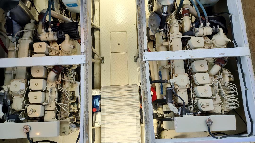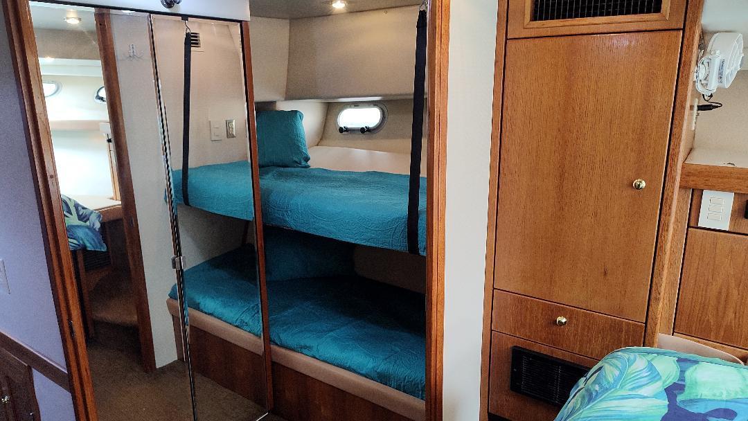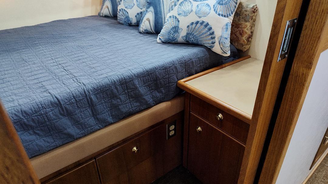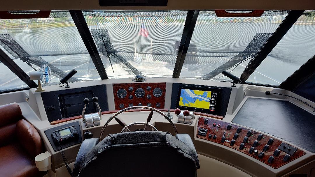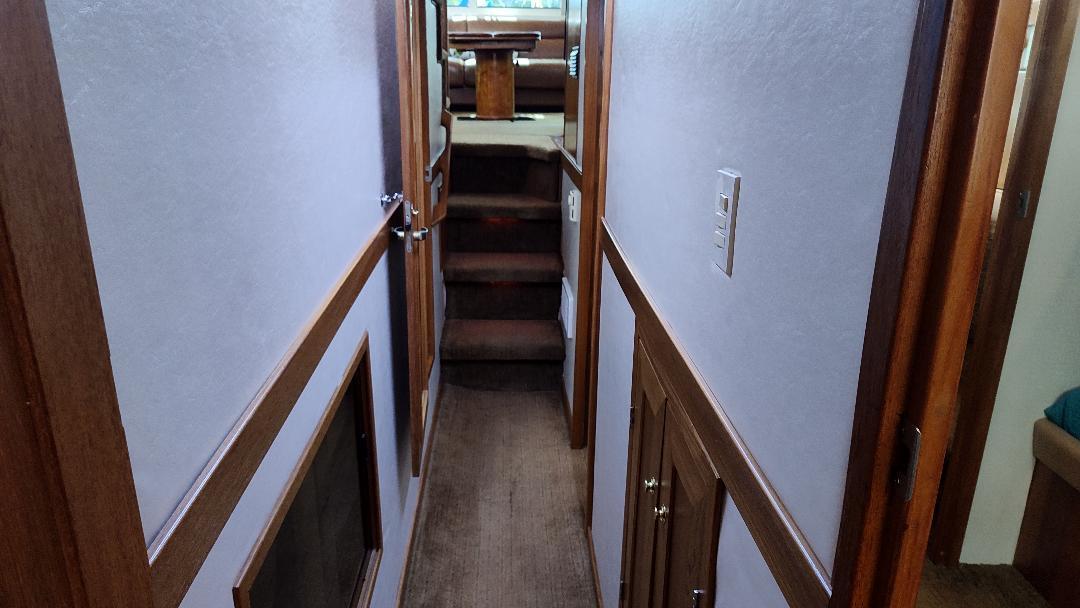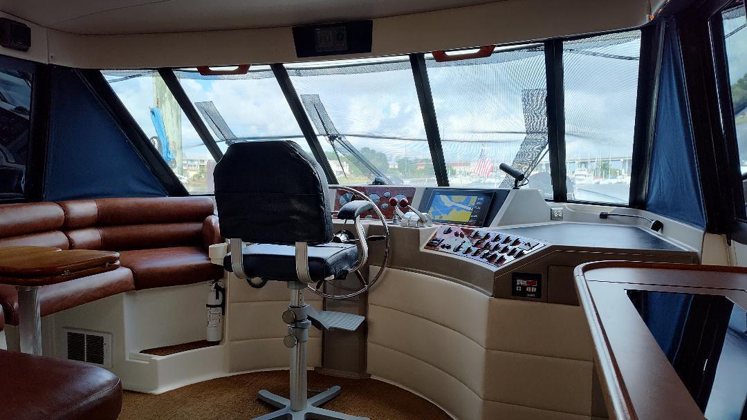 Cockpit entry into the main salon through sliding glass door with large wrap around settee, dinette table w/folding leafs. The salon is very spacious with large windows all the way around providing excellent visibility. Galley up model to the port side keeping everyone on the same level with corian counter tops, double sinks, stove/oven, refrigerator/freezer, microwave oven, coffee maker, trash compactor and storage above & below. To starboard we have wet bar area with corian counter top, ice maker, sink & storage above & below. 4 steps up into the pilot house has wrap around helm station dash with everything in reach, pilot widows with great visibility, port & starboard pilot doors & "L" shaped settee with small table. Pilot house is not just a driving station for the skipper but a great area to entertain while underway. 3 steps down from the salon into the companionway leading forward has private guest head to starboard with electric vacu-flush head, sink vanity w/storage below, mirror/medicine cabinet & separate shower stall with bi-fold glass door. Private Guest Stateroom to port side has double bed w/drawers under, hanging clothes locker, night stand w/drawers, 110 volt outlet and side opening port windows. Moving forward has storage locker & wall mounted Central Vac system.The private forward stateroom has queen centerline bed, storage drawers under, hanging clothes lockers on both sides, 2 single bunk beds (top bunk can drop down creating a settee) with mirrored hanging clothes locker. Ensuite private head w/vanity, sink, electric vacu-flush head,tub enclosure w/glass door.(3) Marine AC/Heat units blowing in all salon, pilot house and cabin spaces. King Air Heat system can be used in winter in place of running marine heat units if so desired. Salon windows slide open (just tinted April 2025). Salon & Pilot House Courtesy Rope Lighting (2024). 11 Side opening port windows & 2 topside opening hatch's for those days you don't need AC or heat.