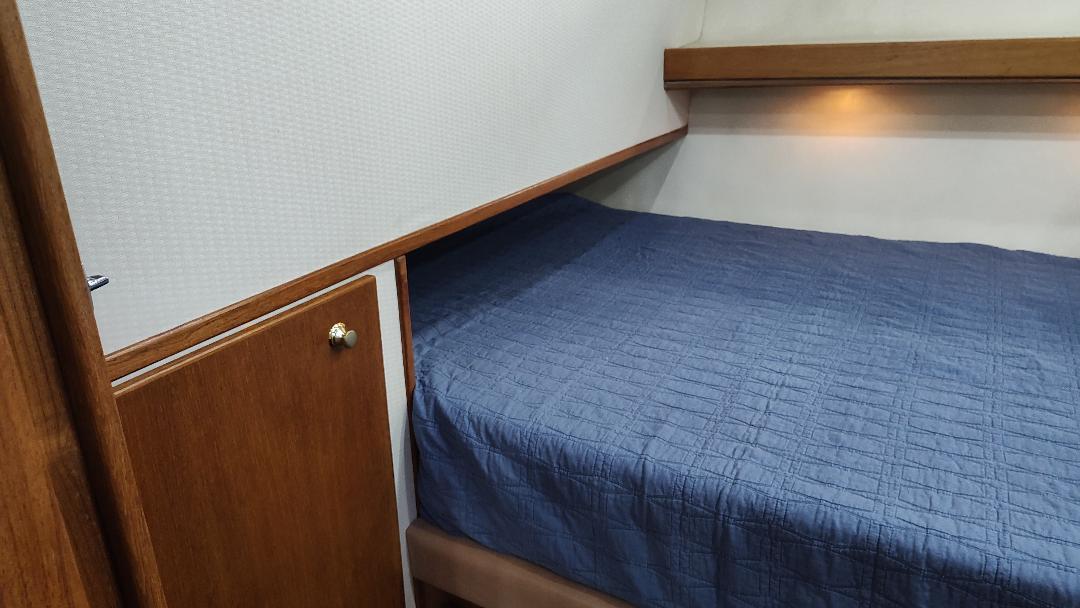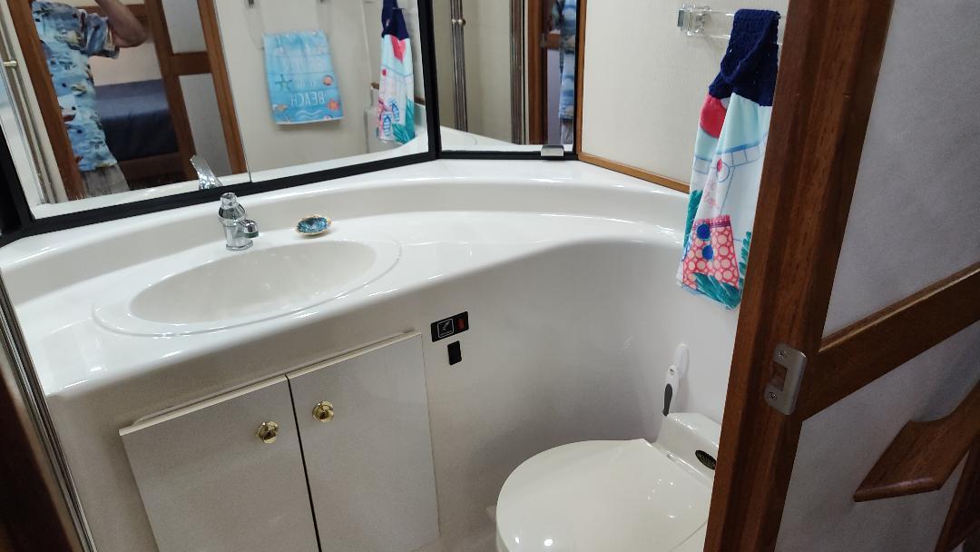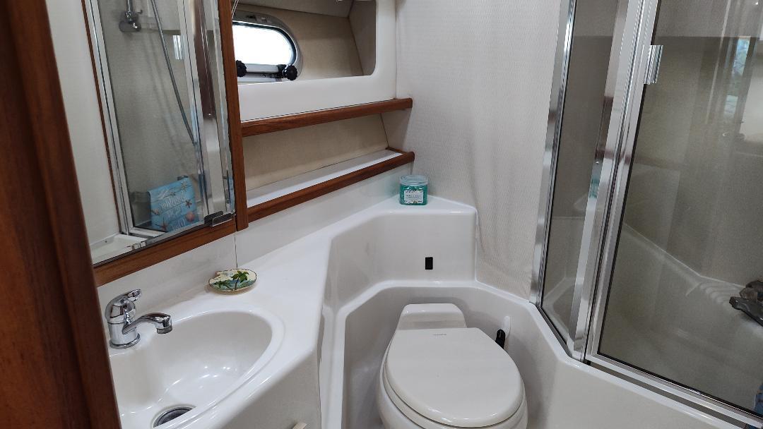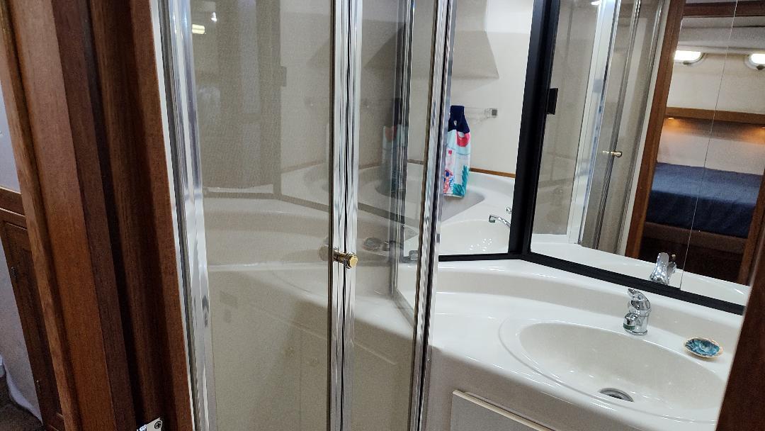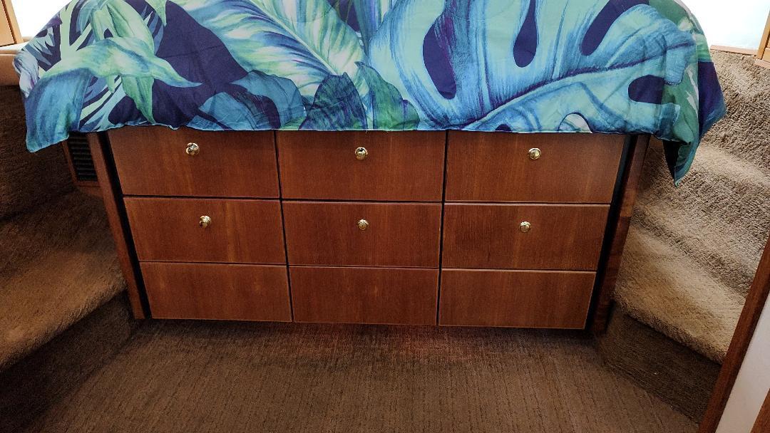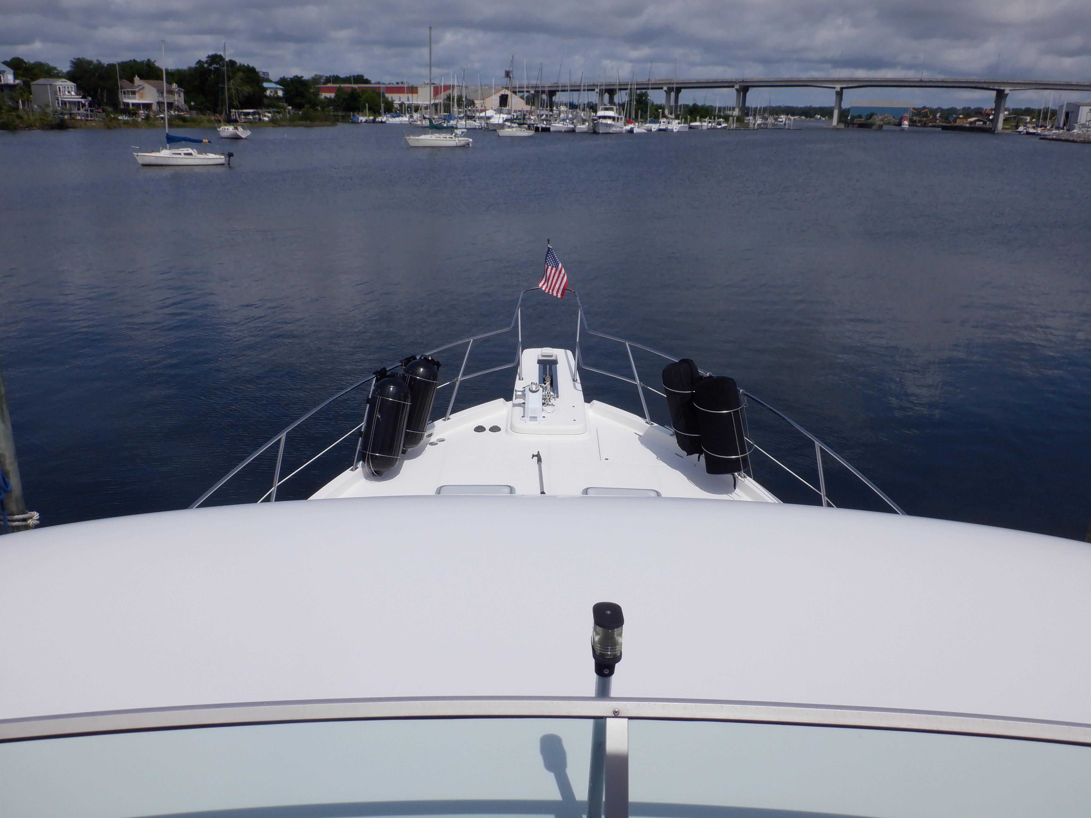 Cockpit entry into the main salon through sliding glass door with large wrap around settee, dinette table w/folding leafs. The salon is very spacious with large windows all the way around providing excellent visibility. Galley up model to the port side keeping everyone on the same level with corian counter tops, double sinks, stove/oven, refrigerator/freezer, microwave oven, coffee maker, trash compactor and storage above & below. To starboard we have wet bar area with corian counter top, ice maker, sink & storage above & below. 4 steps up into the pilot house has wrap around helm station dash with everything in reach, pilot widows with great visibility, port & starboard pilot doors & "L" shaped settee with small table. Pilot house is not just a driving station for the skipper but a great area to entertain while underway. 3 steps down from the salon into the companionway leading forward has private guest head to starboard with electric vacu-flush head, sink vanity w/storage below, mirror/medicine cabinet & separate shower stall with bi-fold glass door. Private Guest Stateroom to port side has double bed w/drawers under, hanging clothes locker, night stand w/drawers, 110 volt outlet and side opening port windows. Moving forward has storage locker & wall mounted Central Vac system.The private forward stateroom has queen centerline bed, storage drawers under, hanging clothes lockers on both sides, 2 single bunk beds (top bunk can drop down creating a settee) with mirrored hanging clothes locker. Ensuite private head w/vanity, sink, electric vacu-flush head,tub enclosure w/glass door.(3) Marine AC/Heat units blowing in all salon, pilot house and cabin spaces. King Air Heat system can be used in winter in place of running marine heat units if so desired. Salon windows slide open (just tinted April 2025). Salon & Pilot House Courtesy Rope Lighting (2024). 11 Side opening port windows & 2 topside opening hatch's for those days you don't need AC or heat.