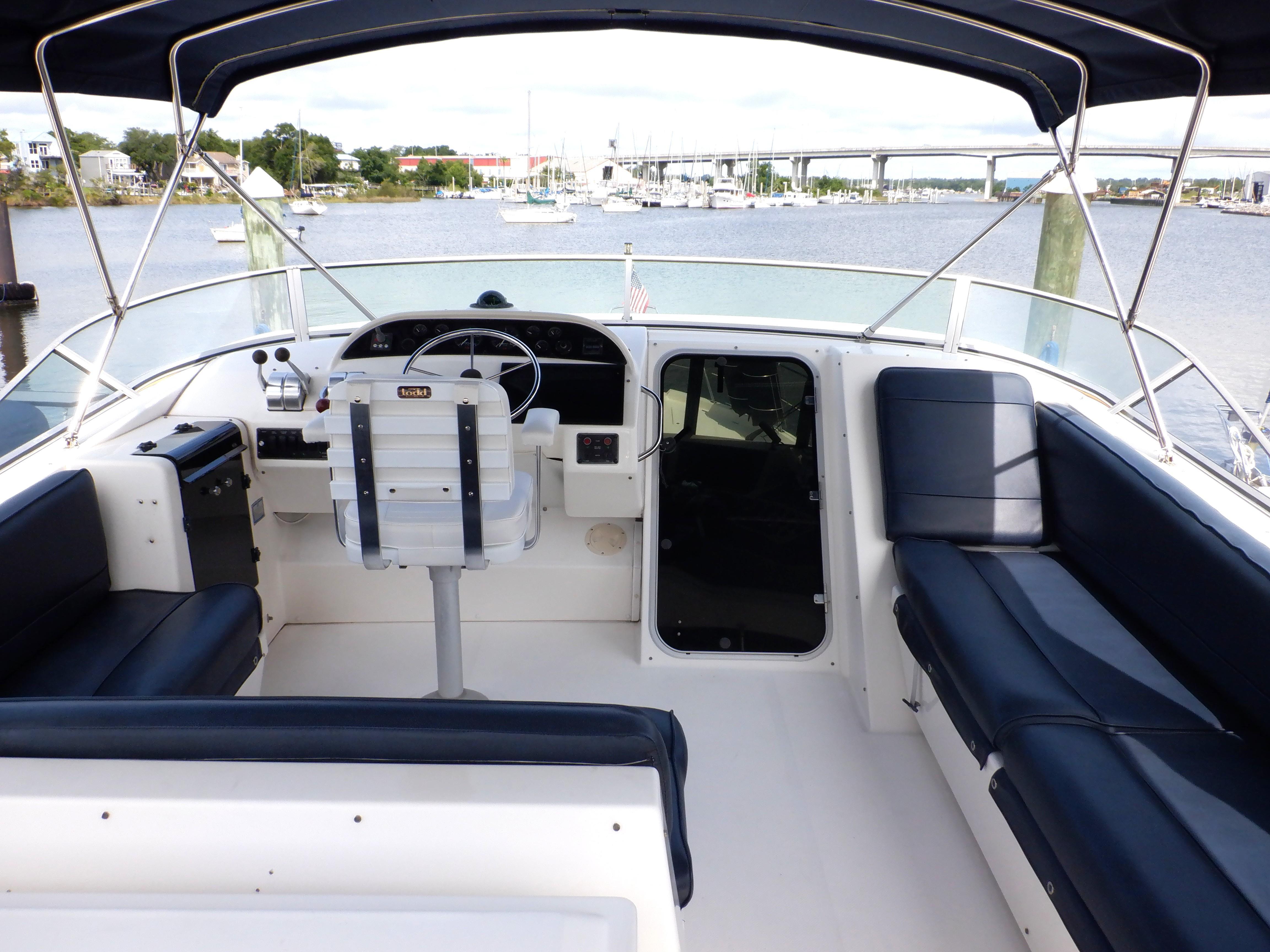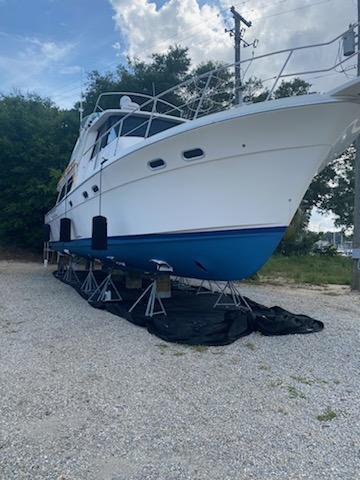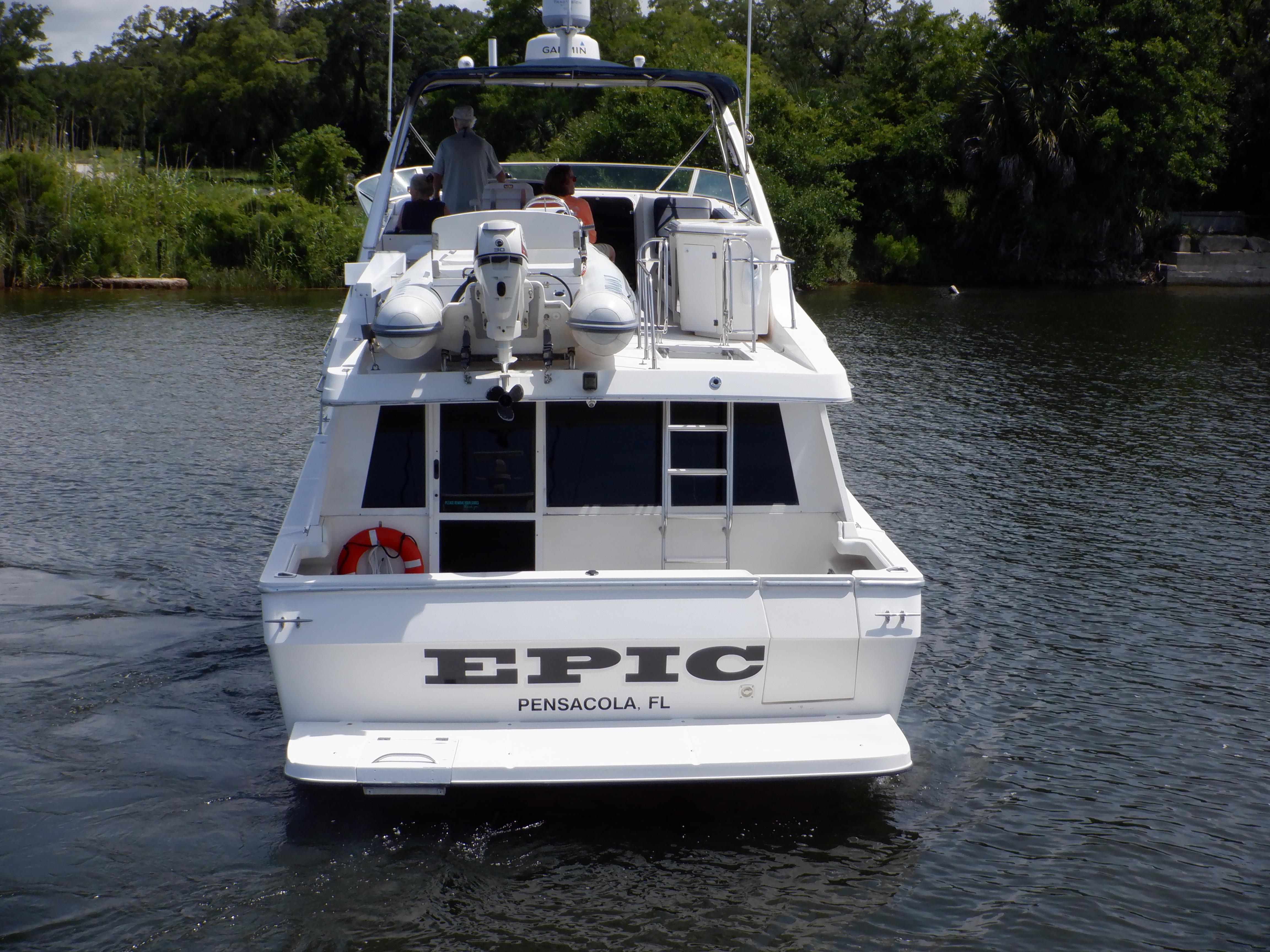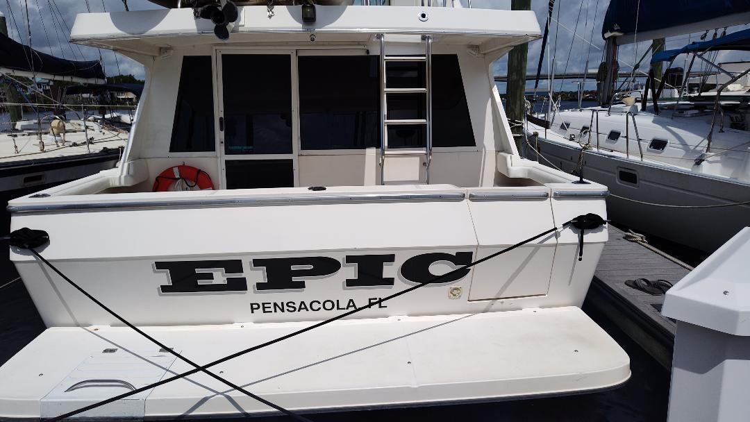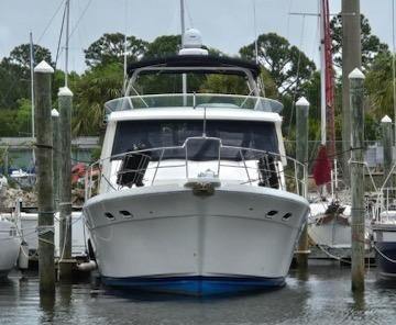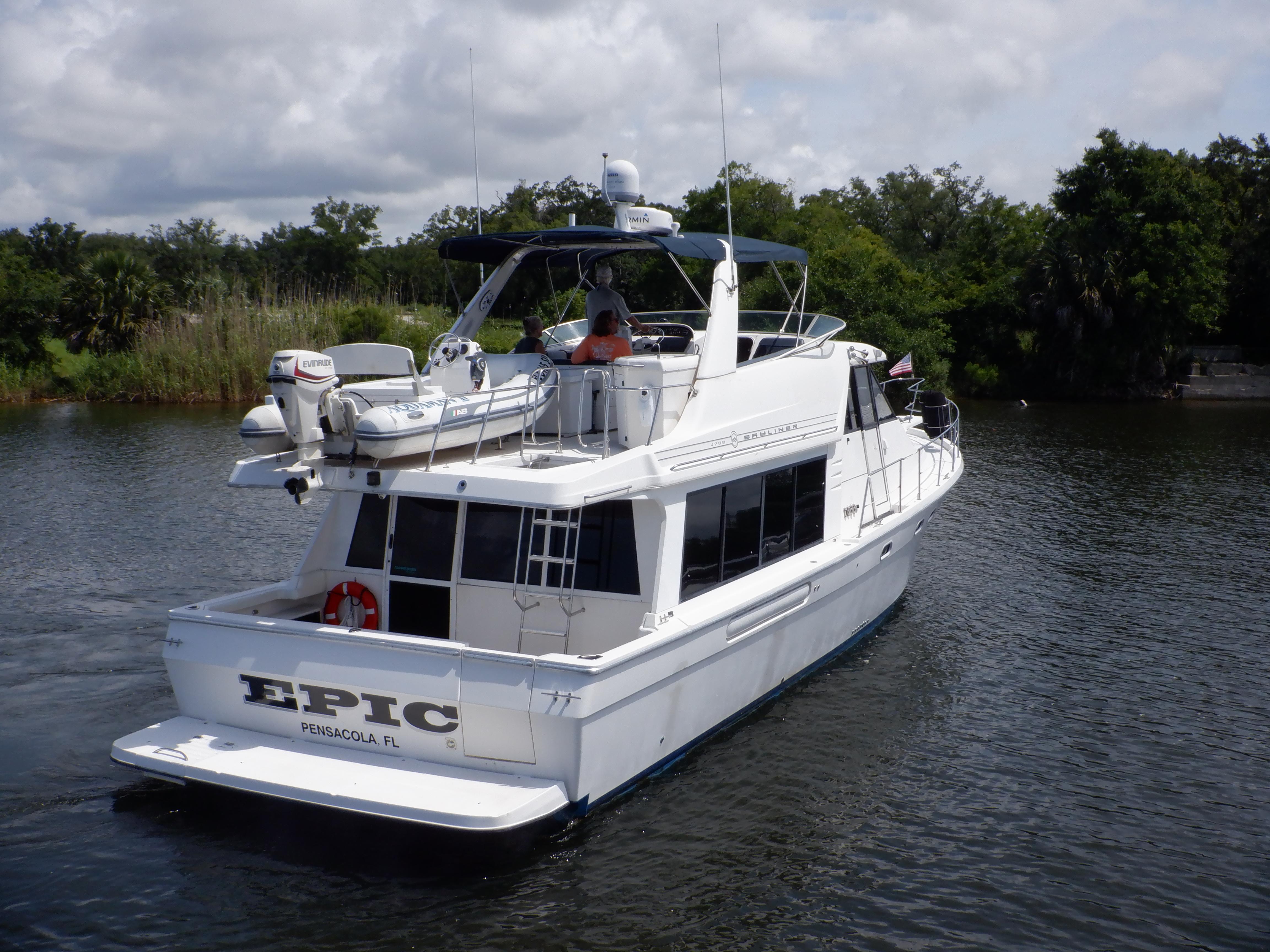 The Bayliner 4788 Pilothouse Motor Yacht remains one of the most in demand models her size on the market. In production from 1994-2002. Meridian Yachts purchased the rights, rebranded the same layout calling her the 490 Pilothouse from 2003-2008.The "home run" design of the 4788/490 is her short distance from the Pilothouse station to the Flybridge station through bi-level hatch, measured as less than10 steps. Port & starboard pilot doors leading to the bow and access stairs de-boarding the aft bridge deck to the transom cockpit. Maneuvering your way around this 54' vessel is very easy. Lower Pilothouse station looks more like an aircraft cockpit with everything in reach. "L" shaped settee w/table behind the helm means everyone can enjoy the wide view along with the skipper while underway. Storage is also available under the seating. The flybridge helm is equally as comfortable with lounger seat, "L" shaped settee, access to the wet bar & refrigerator. Radar Arch, Bimini Top and storage is available under seating as well.Dinghy Tender Rack w/Crane means you can drop your auxiliary craft in the water soon as you anchor. Securing straps and dinghy full weather cover for storage. Dock box storage in front of dinghy. Flybridge upholstery also has full sun covers for helm, captains chair, lounger seats, settee seating & wet bar while bridge is secured and not in use. Extended hardtop shelters cockpit and has padded coaming bolster pads, storage lockers, transom door, full length platform w/boarding ladder. Port side sliding glass cabin door entry. "EPIC" is powered with the preferred 370HP Cummins 6BTA 5.9 Lit Diamond Series Diesels. Also equipped with the 12.5KW Westerbeke Generator, over some models having the 8KW. She has plenty of horsepower and plenty of generator power!