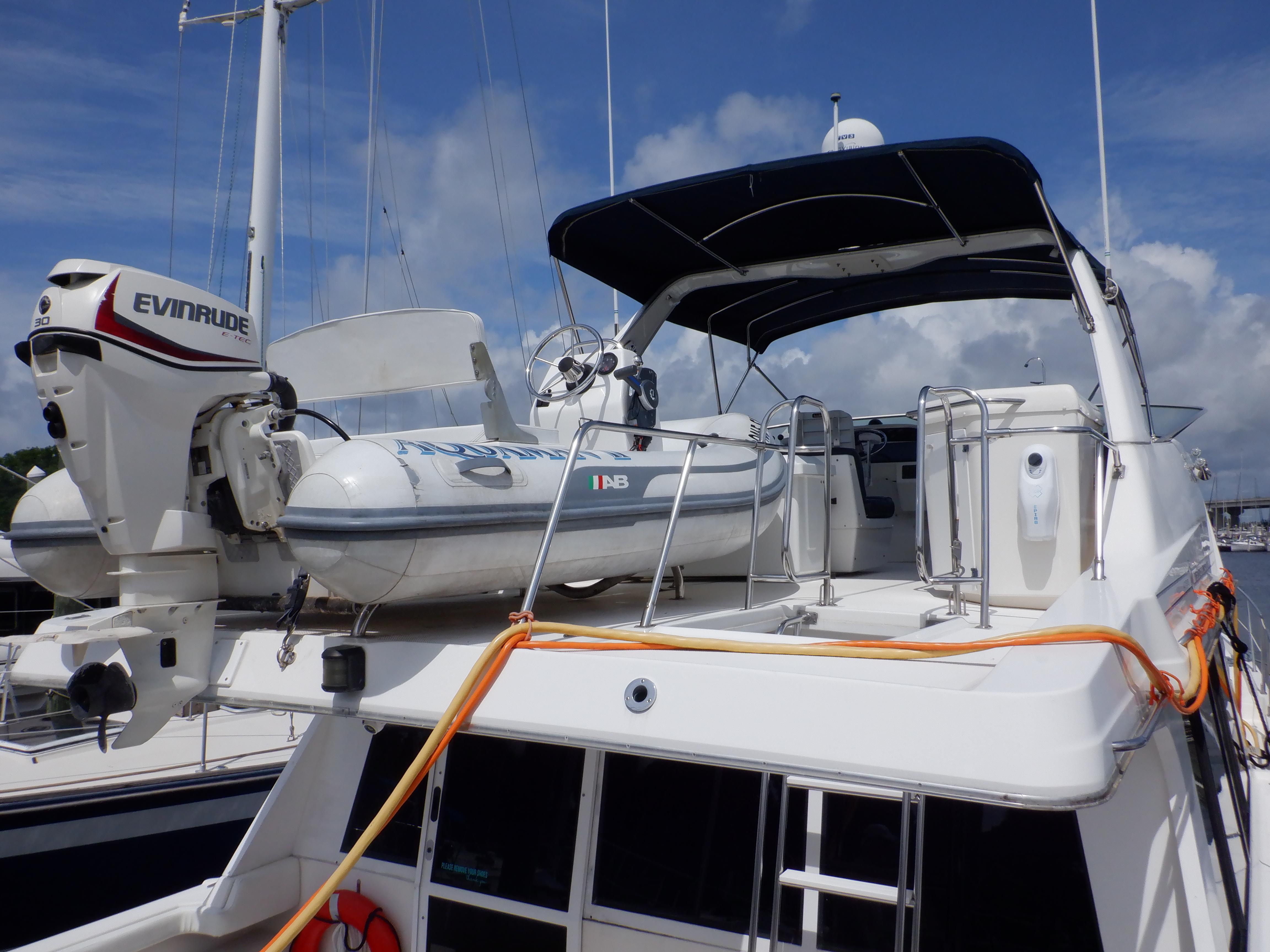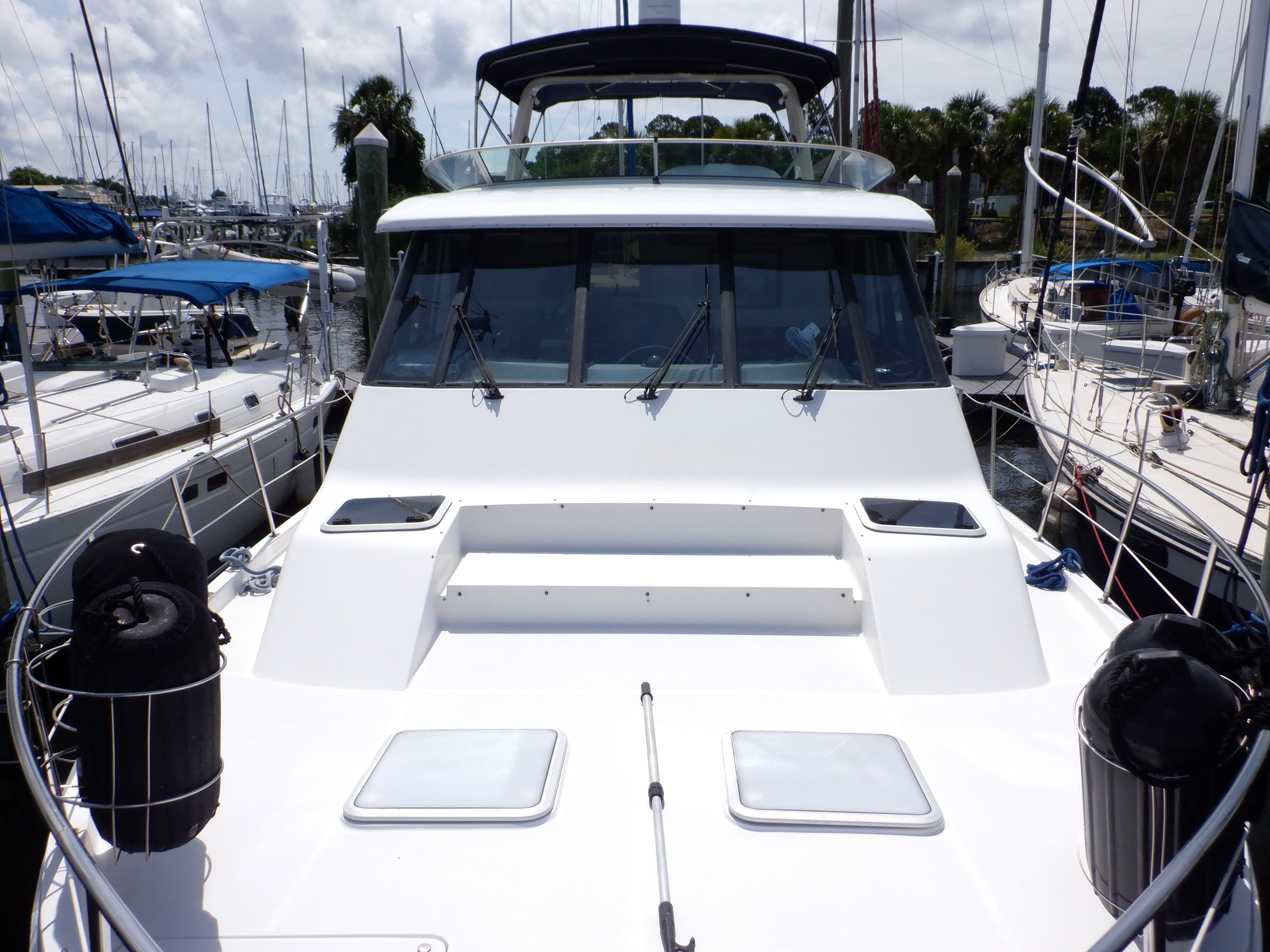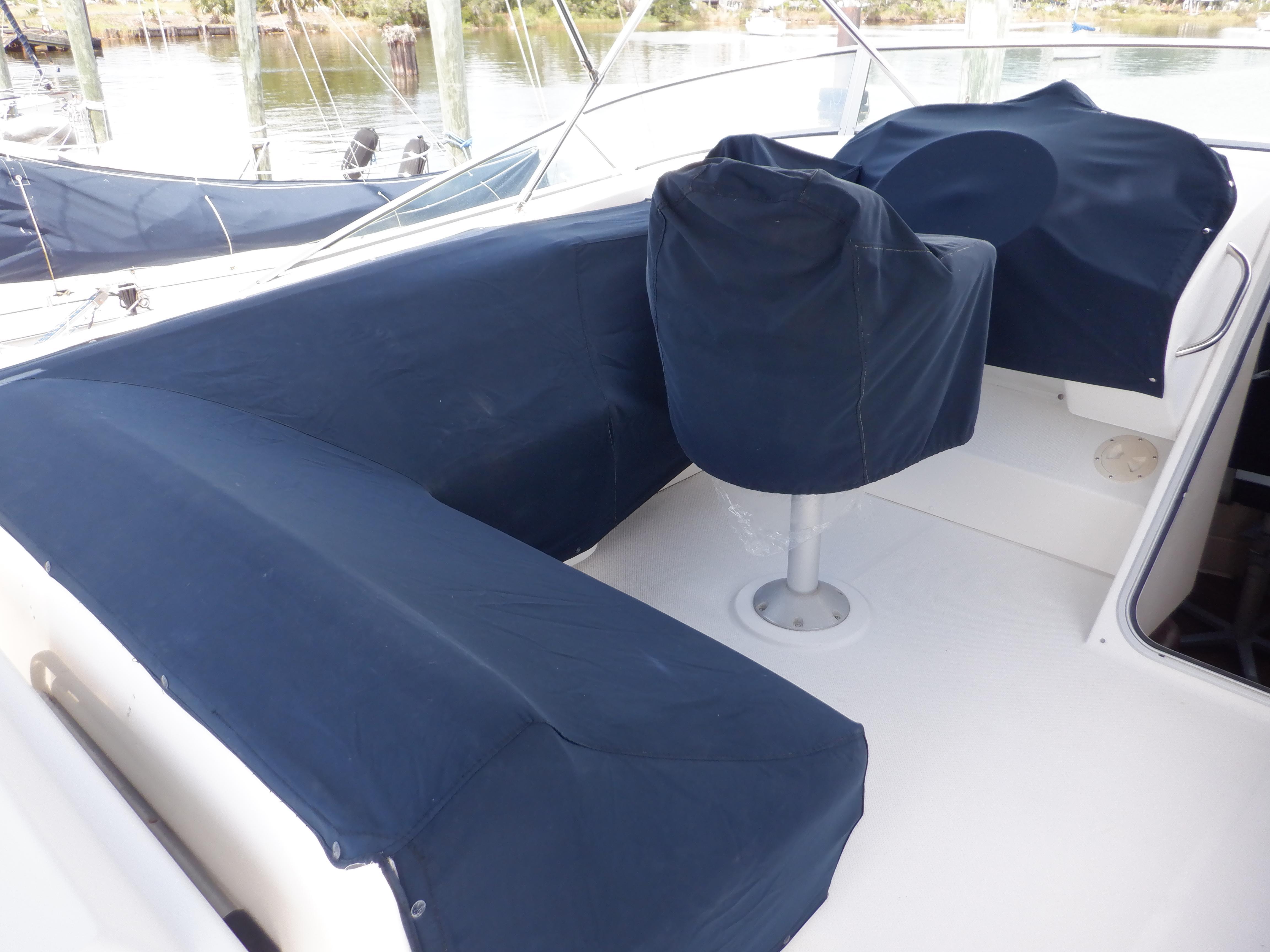The Bayliner 4788 Pilothouse Motor Yacht remains one of the most in demand models her size on the market. In production from 1994-2002. Meridian Yachts purchased the rights, rebranded the same layout calling her the 490 Pilothouse from 2003-2008.The "home run" design of the 4788/490 is her short distance from the Pilothouse station to the Flybridge station through bi-level hatch, measured as less than10 steps. Port & starboard pilot doors leading to the bow and access stairs de-boarding the aft bridge deck to the transom cockpit. Maneuvering your way around this 54' vessel is very easy. Lower Pilothouse station looks more like an aircraft cockpit with everything in reach. "L" shaped settee w/table behind the helm means everyone can enjoy the wide view along with the skipper while underway. Storage is also available under the seating. The flybridge helm is equally as comfortable with lounger seat, "L" shaped settee, access to the wet bar & refrigerator. Radar Arch, Bimini Top and storage is available under seating as well.Dinghy Tender Rack w/Crane means you can drop your auxiliary craft in the water soon as you anchor. Securing straps and dinghy full weather cover for storage. Dock box storage in front of dinghy. Flybridge upholstery also has full sun covers for helm, captains chair, lounger seats, settee seating & wet bar while bridge is secured and not in use. Extended hardtop shelters cockpit and has padded coaming bolster pads, storage lockers, transom door, full length platform w/boarding ladder. Port side sliding glass cabin door entry. "EPIC" is powered with the preferred 370HP Cummins 6BTA 5.9 Lit Diamond Series Diesels. Also equipped with the 12.5KW Westerbeke Generator, over some models having the 8KW. She has plenty of horsepower and plenty of generator power!