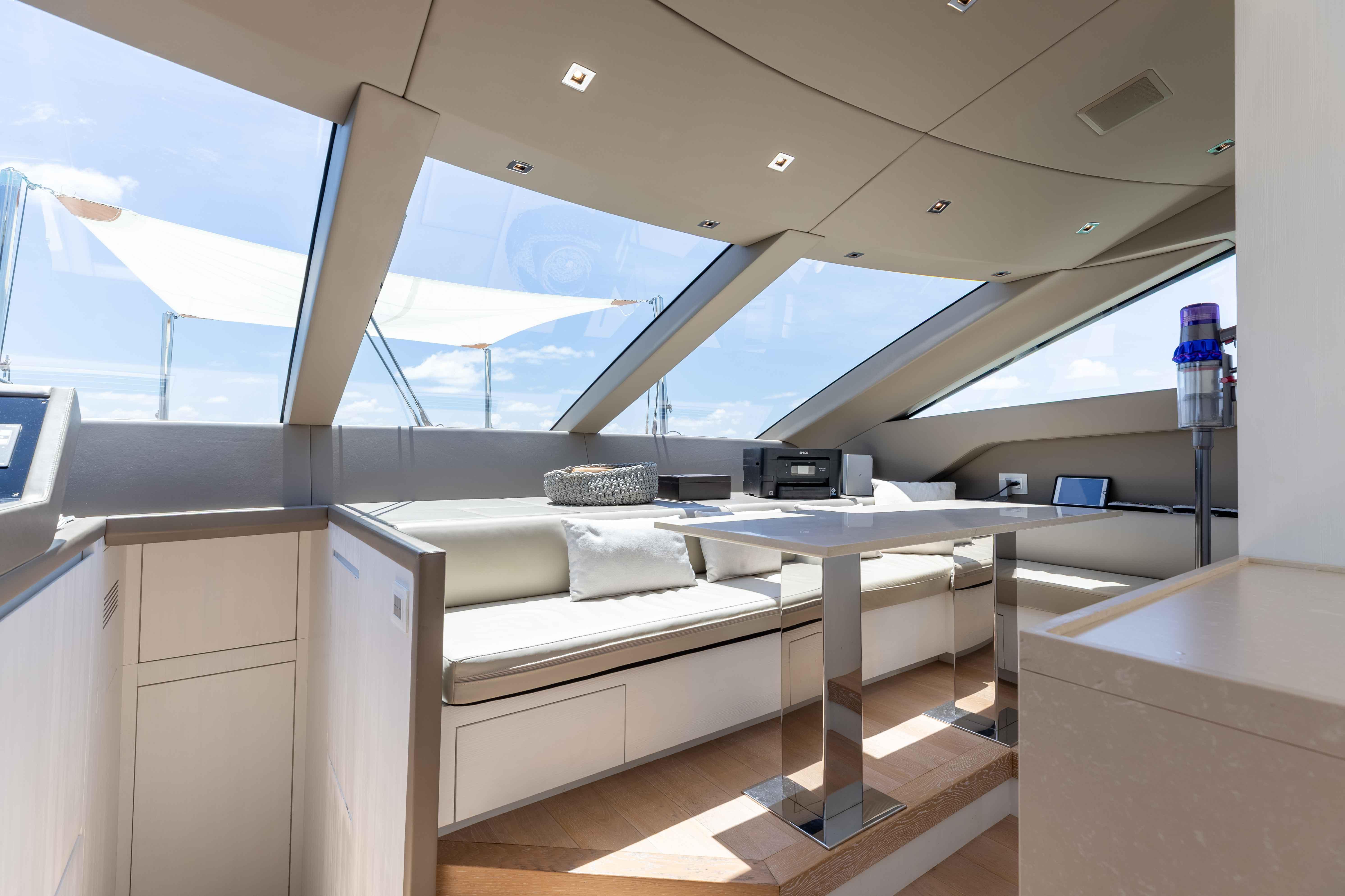 - Electric Up/down and folding table on fly bridge with top in varnished teak