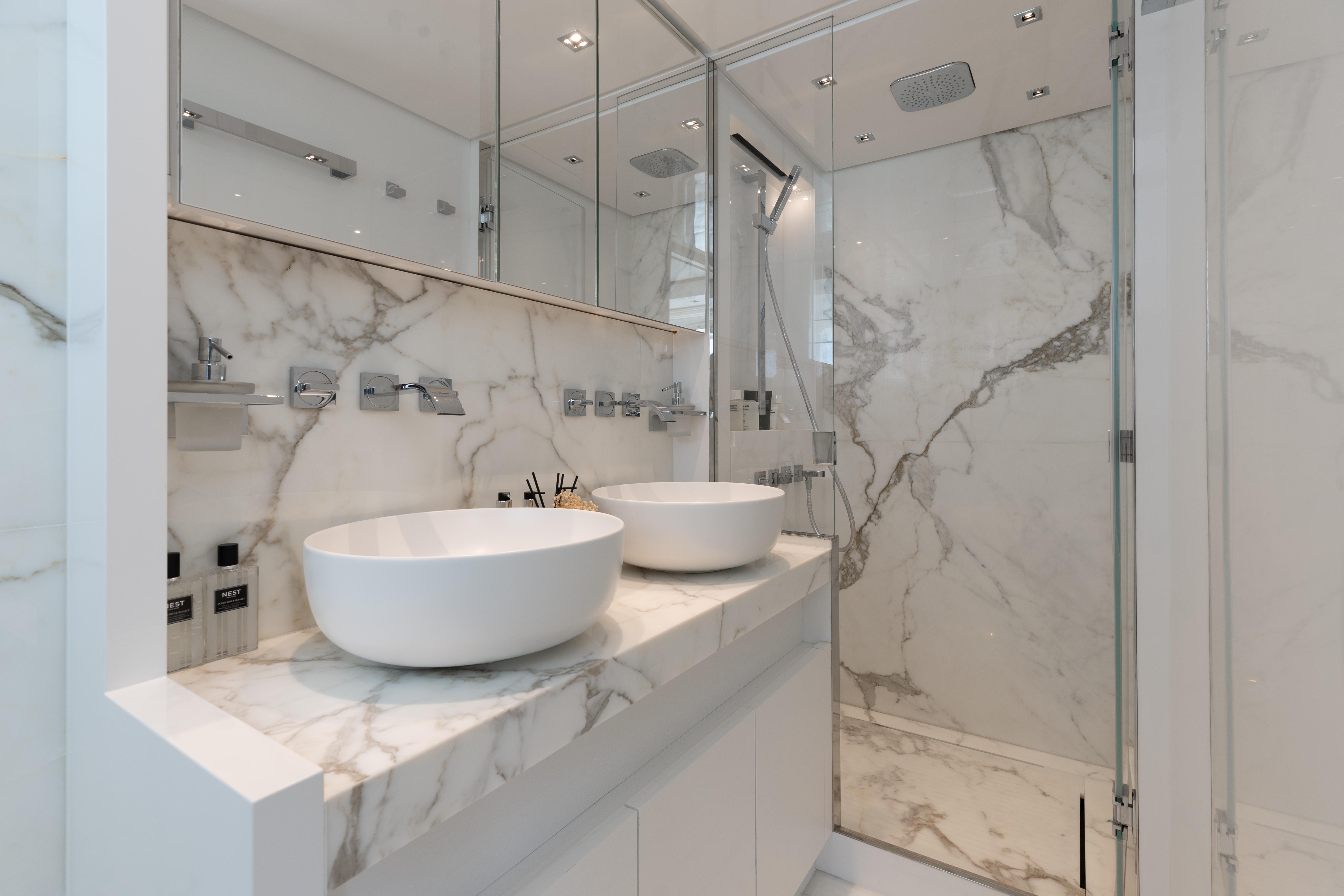 - Calacatta polished finished marble for all bathrooms floor, washbasin top and n°1 wall in owner's shower and n°1 bow wall in owner's bathroom (diff. from marble type Emperador Light previously quoted)