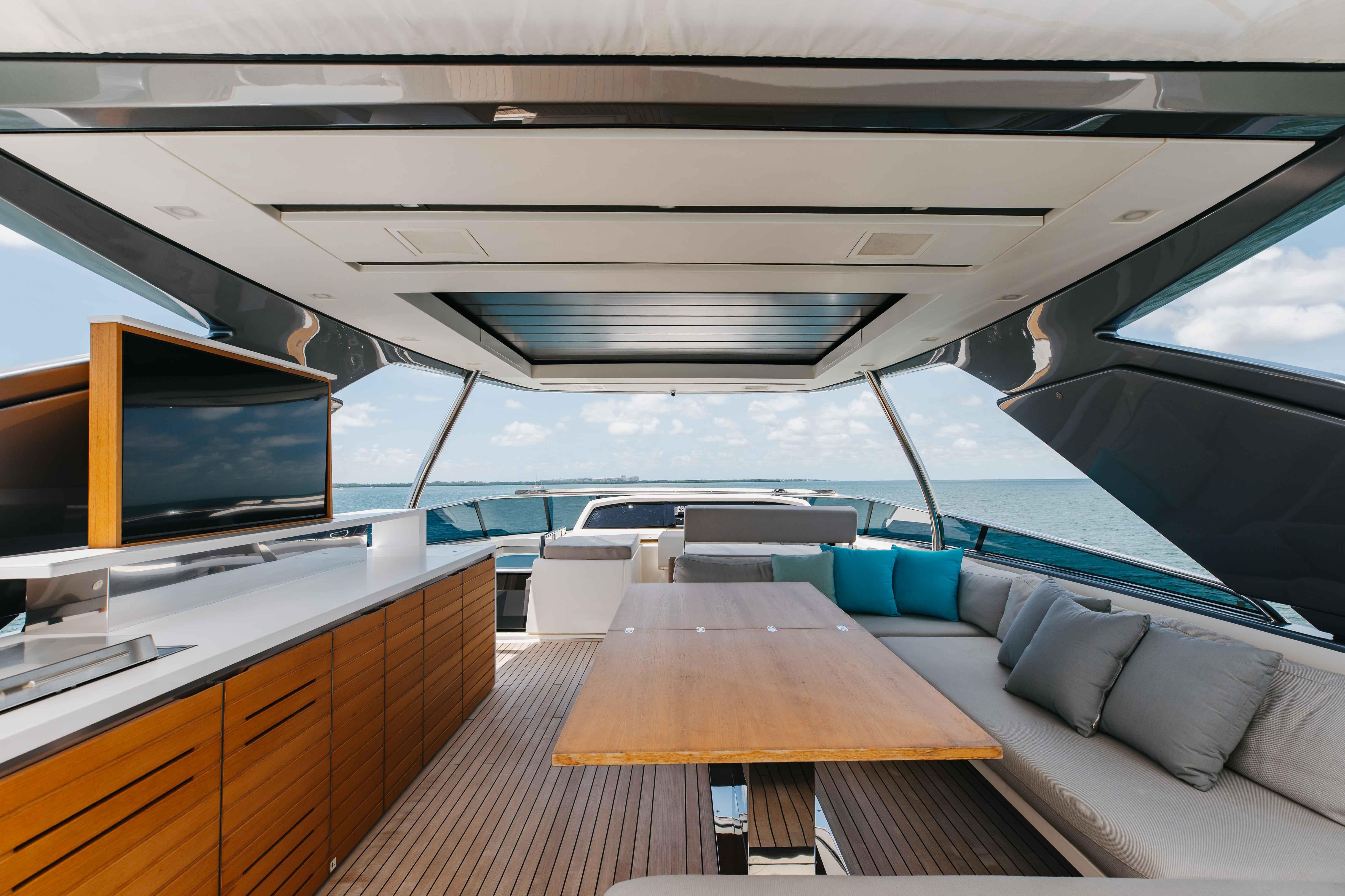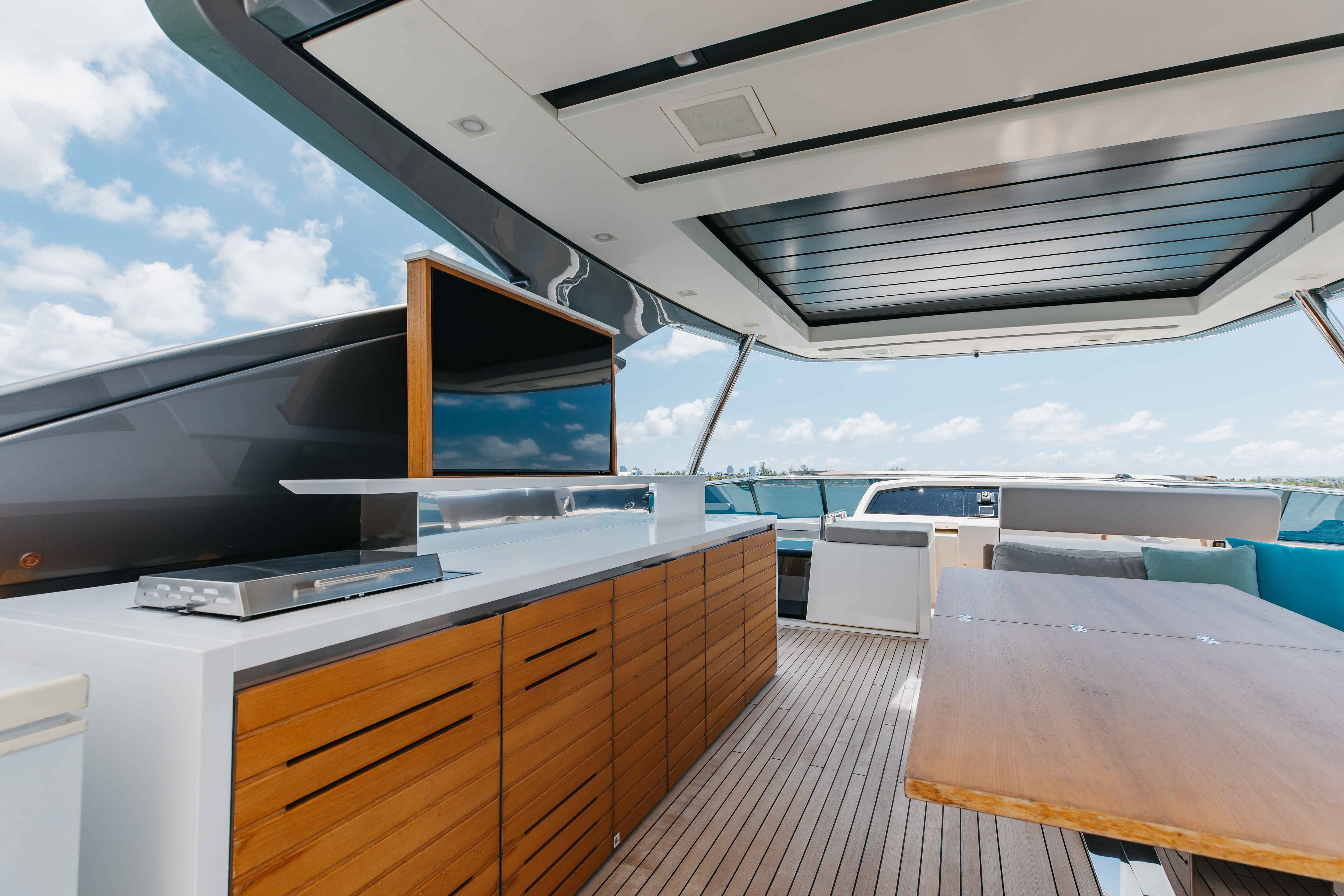 - Bar cabinet on flybridge with integrated lift system 50" TV with varnished doors and side and top in Corian Glacier White (diff. From STD Bar Cabinet)