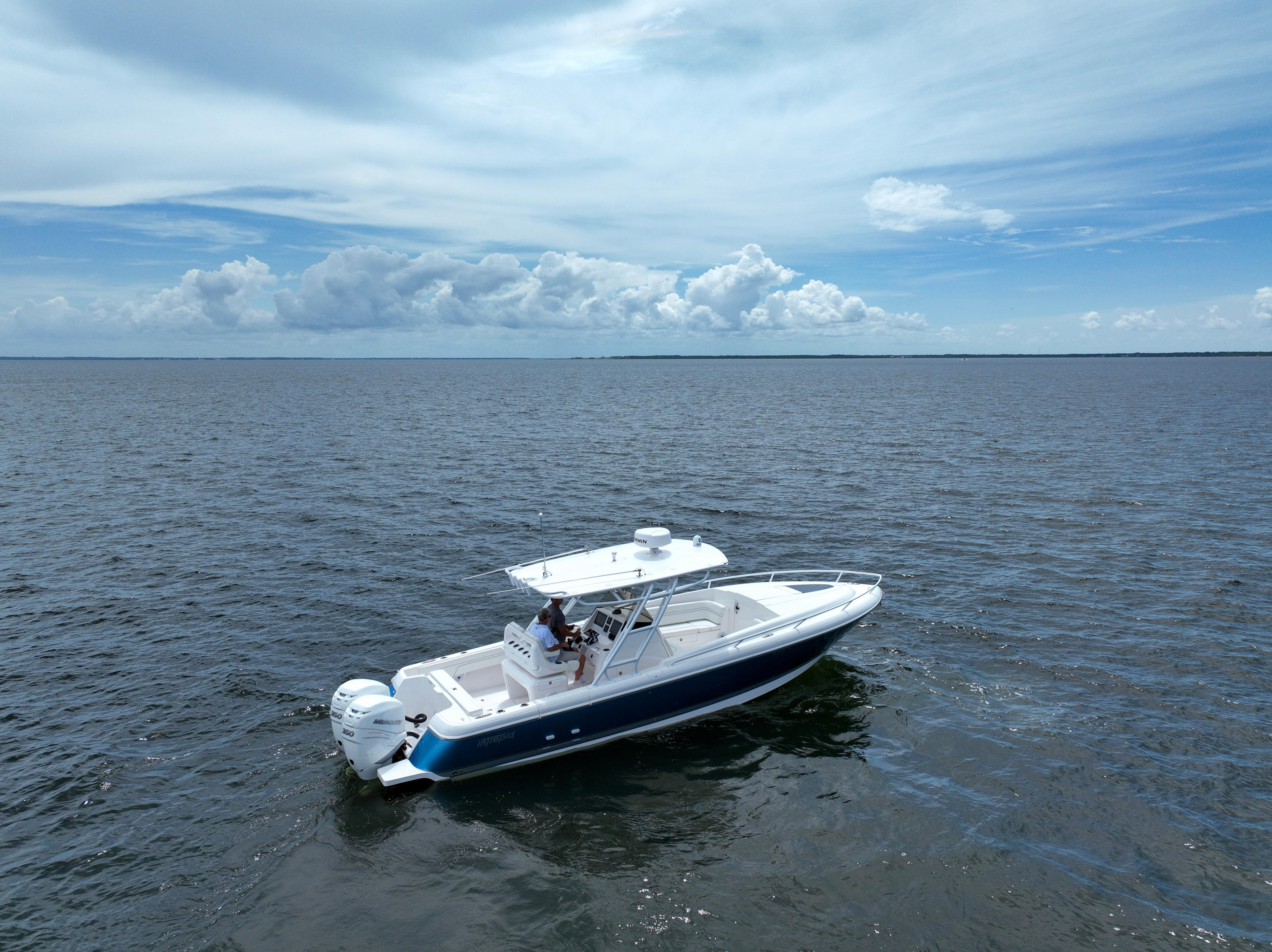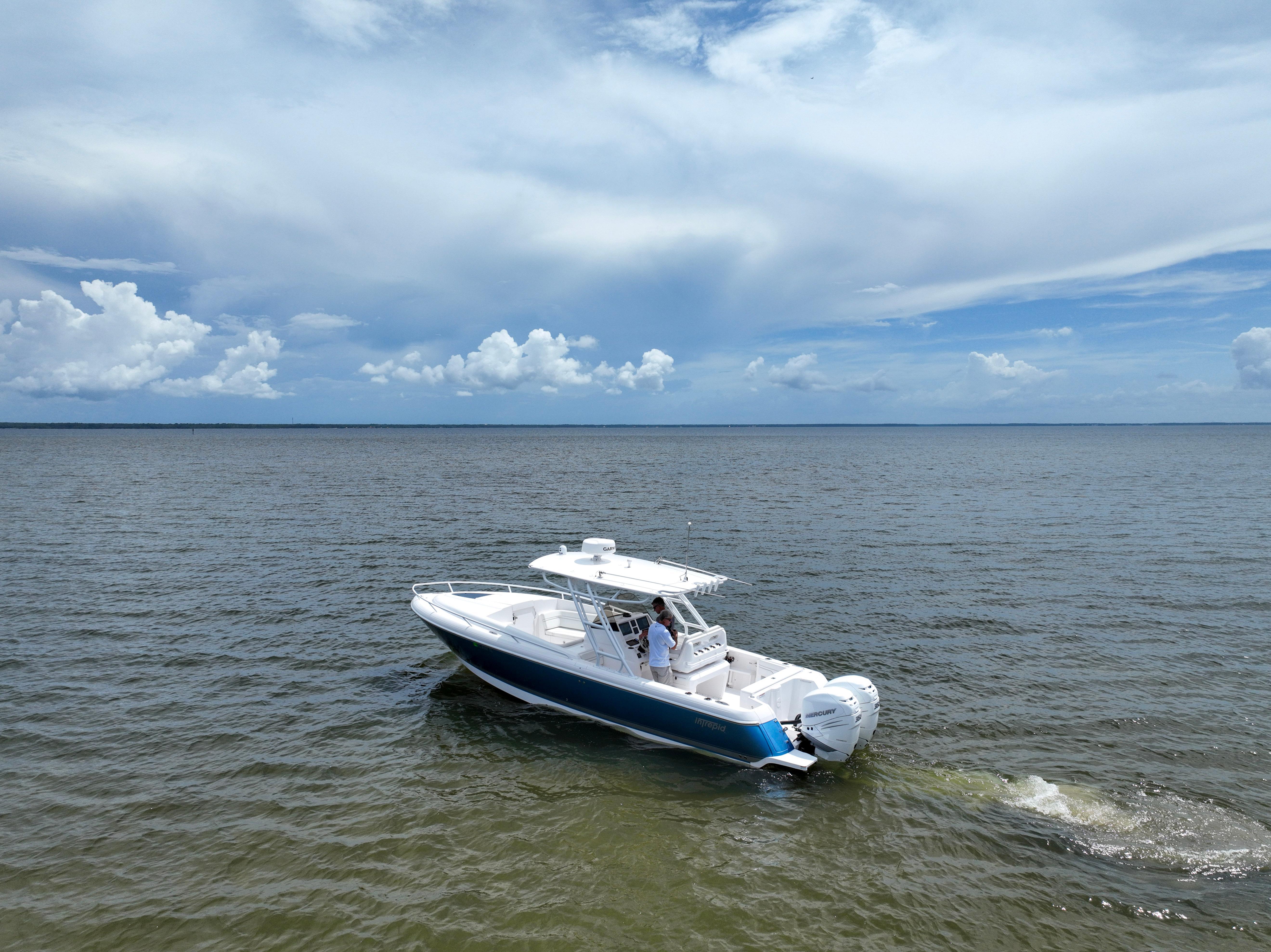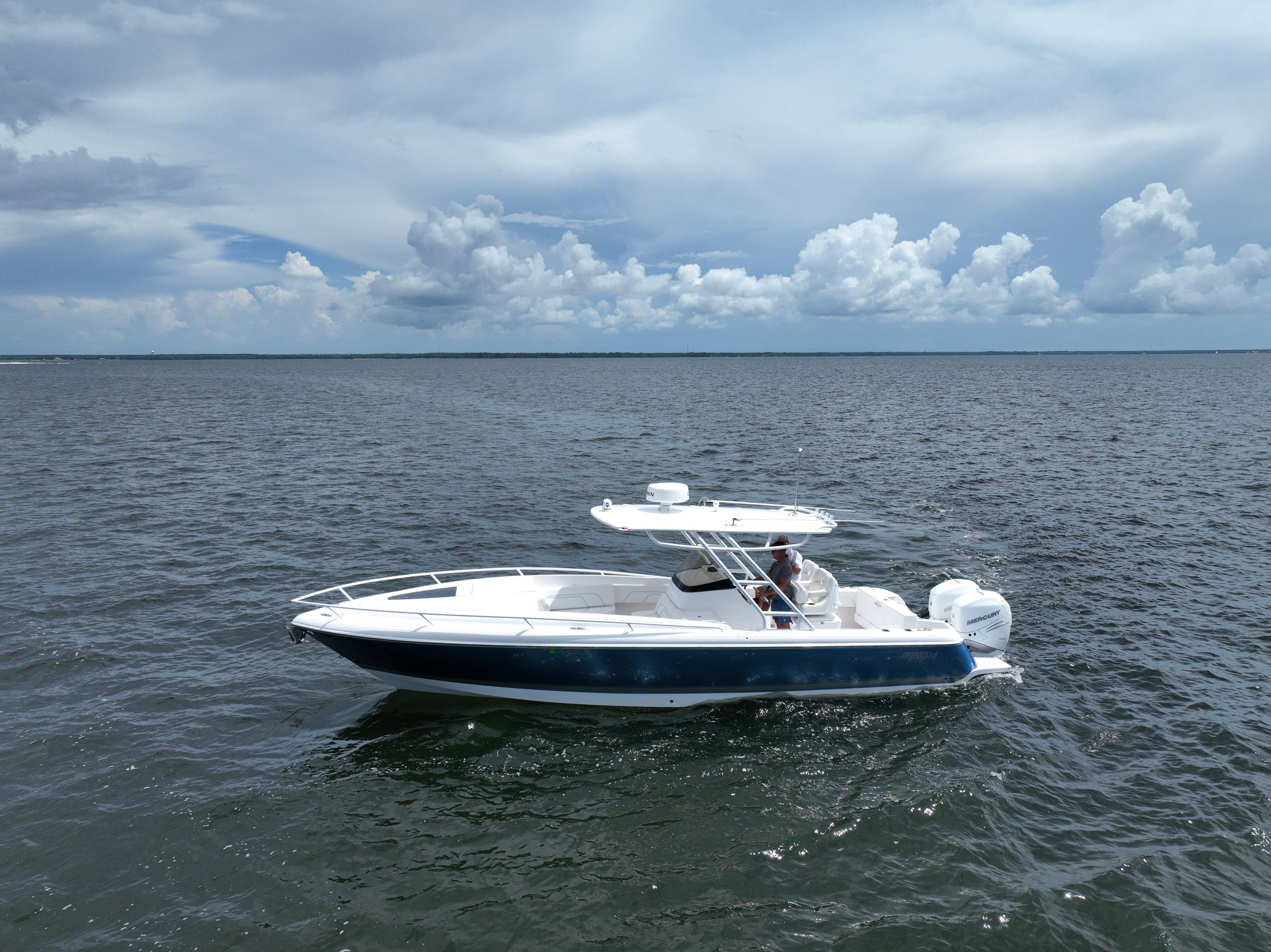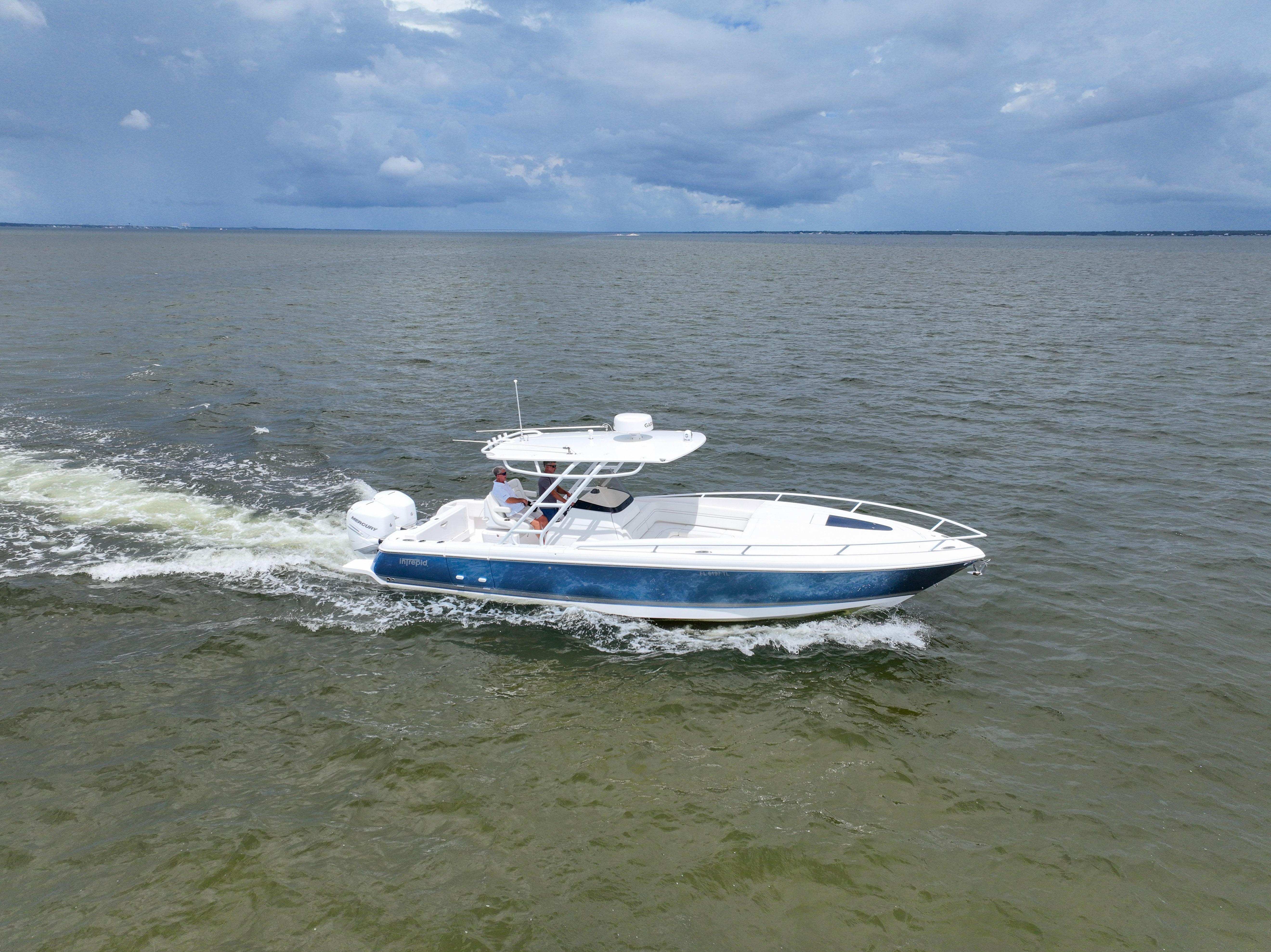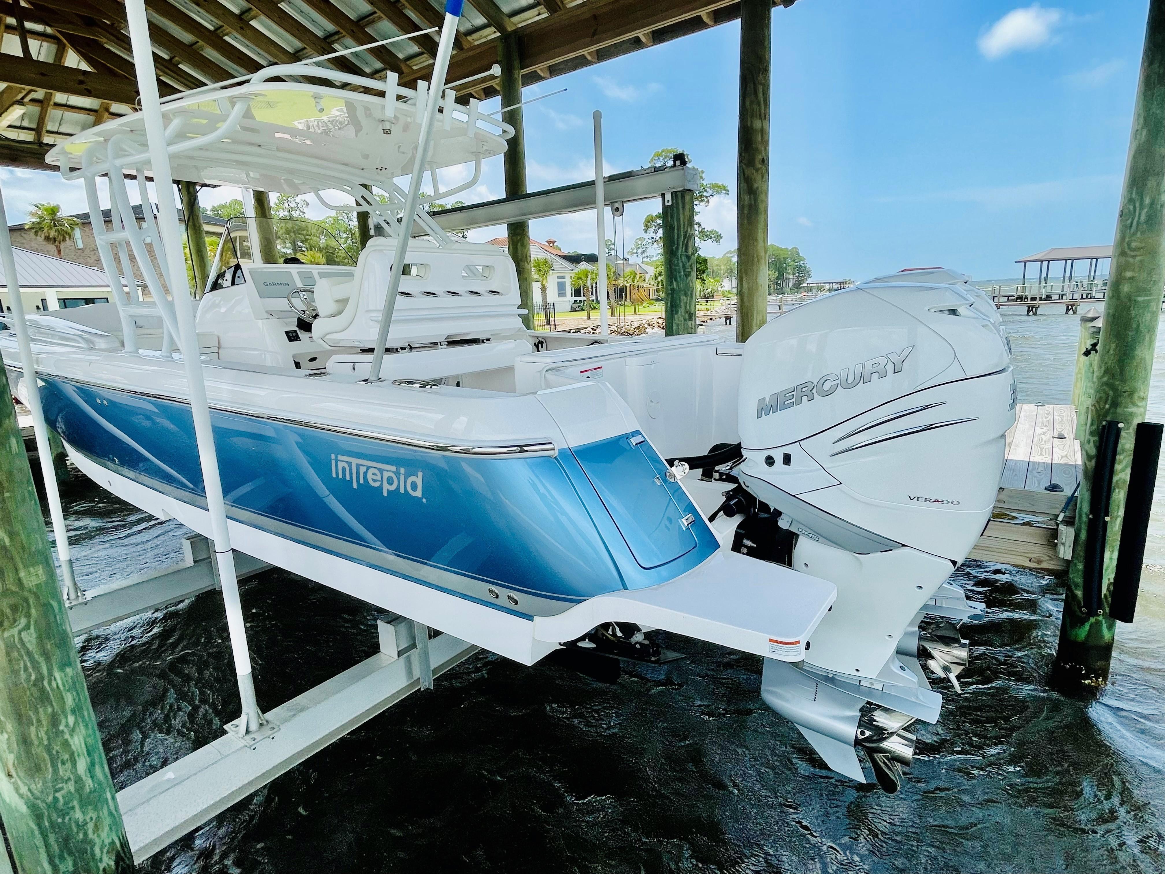 2023 32' Intrepid 327-I Valor for sale- The 327 Intrepid represents a well-versed, excellent running, bespoke of functionality, and a truly enjoyable time on the water. The absolute perfect luxury yacht shuttle vessel or family runabout, the 327 offers a delectable platter to fulfill everyone's needs. Whether you want to partake in offshore fishing, diving, island hopping, or setting up at the sandbar for the day, this Intrepid covers every base without overcomplicating. Twin 350 Mercury Cold Fusion Mercury Verados offer plenty of speed and fuel efficiency, with tremendous handling on its proven high-performance stepped hull. The forward air-circulated cuddy cabin provides enough escape from the elements should you need a break from the wind and sun. A clever side boarding door drops down for easy boarding while swimming or snorkeling with a fiberglass molded step built right in. Most impressive is the ample, well-designed seating, from the fold-down transom seat, comfortable helm, to L-shaped forward lounge seating in the bow. There is even a very convenient electric slide actuator to access the head below the helm. With extremely light use, lift kept and loaded up with options, this one is not to be missed.