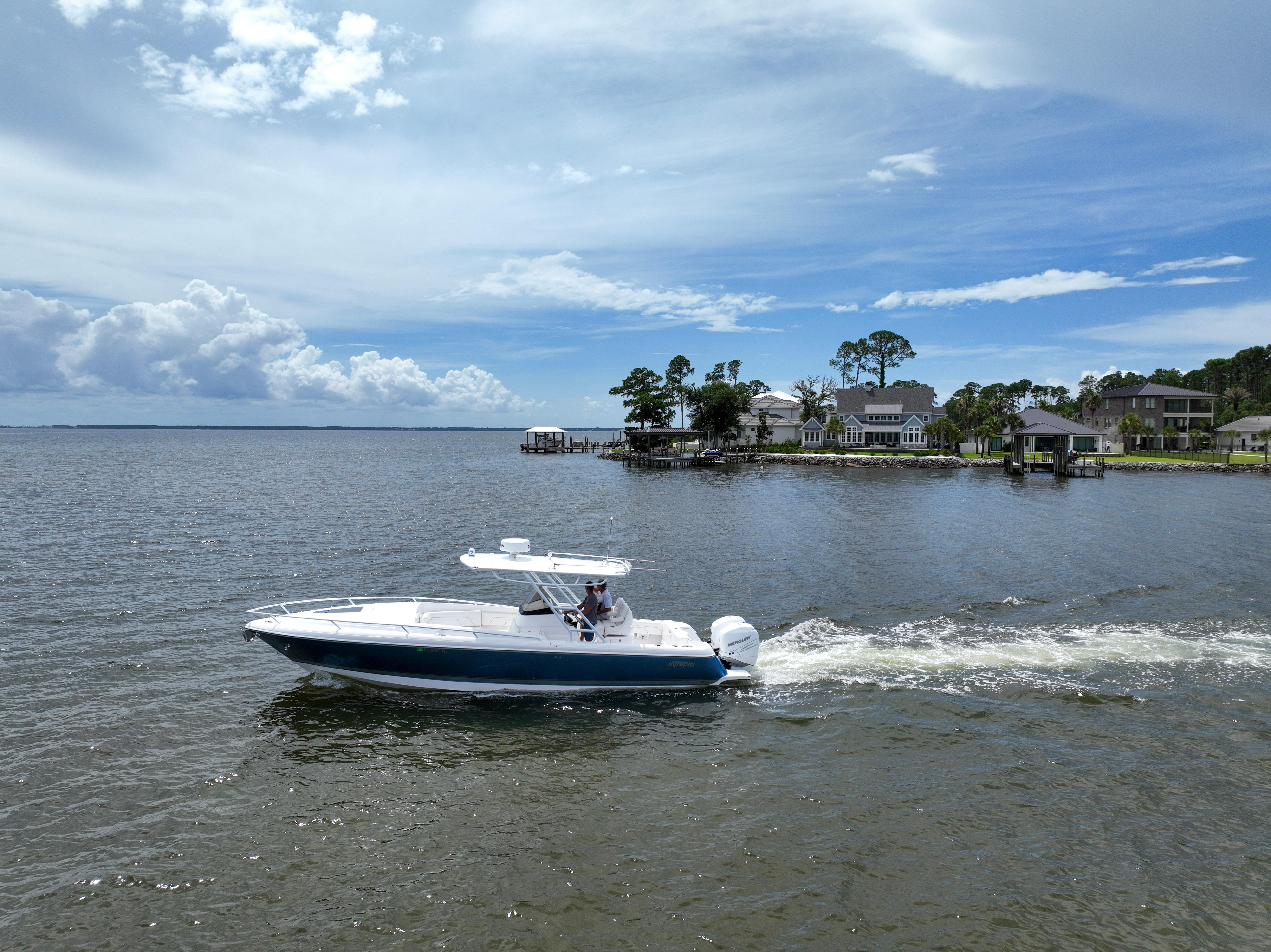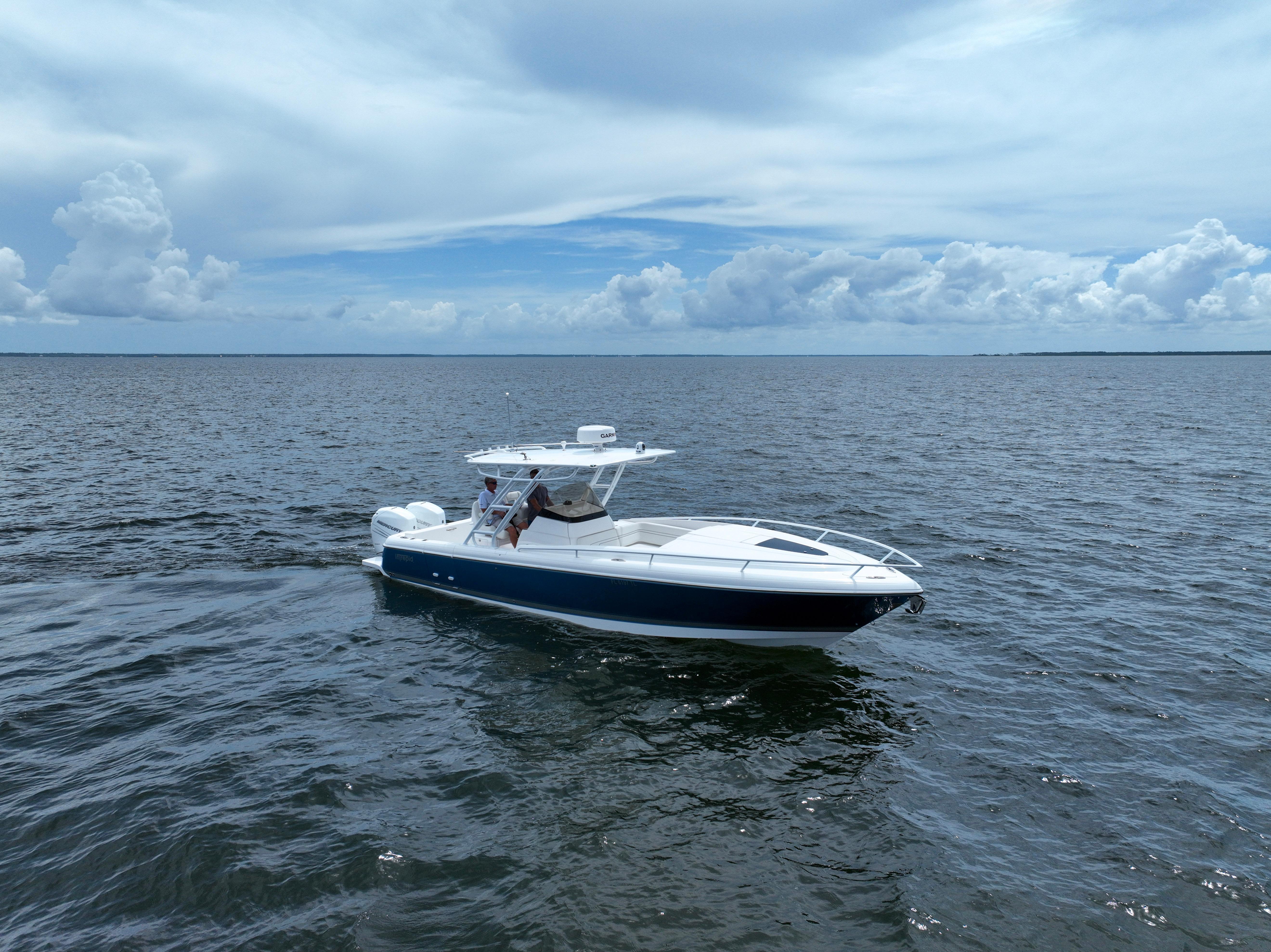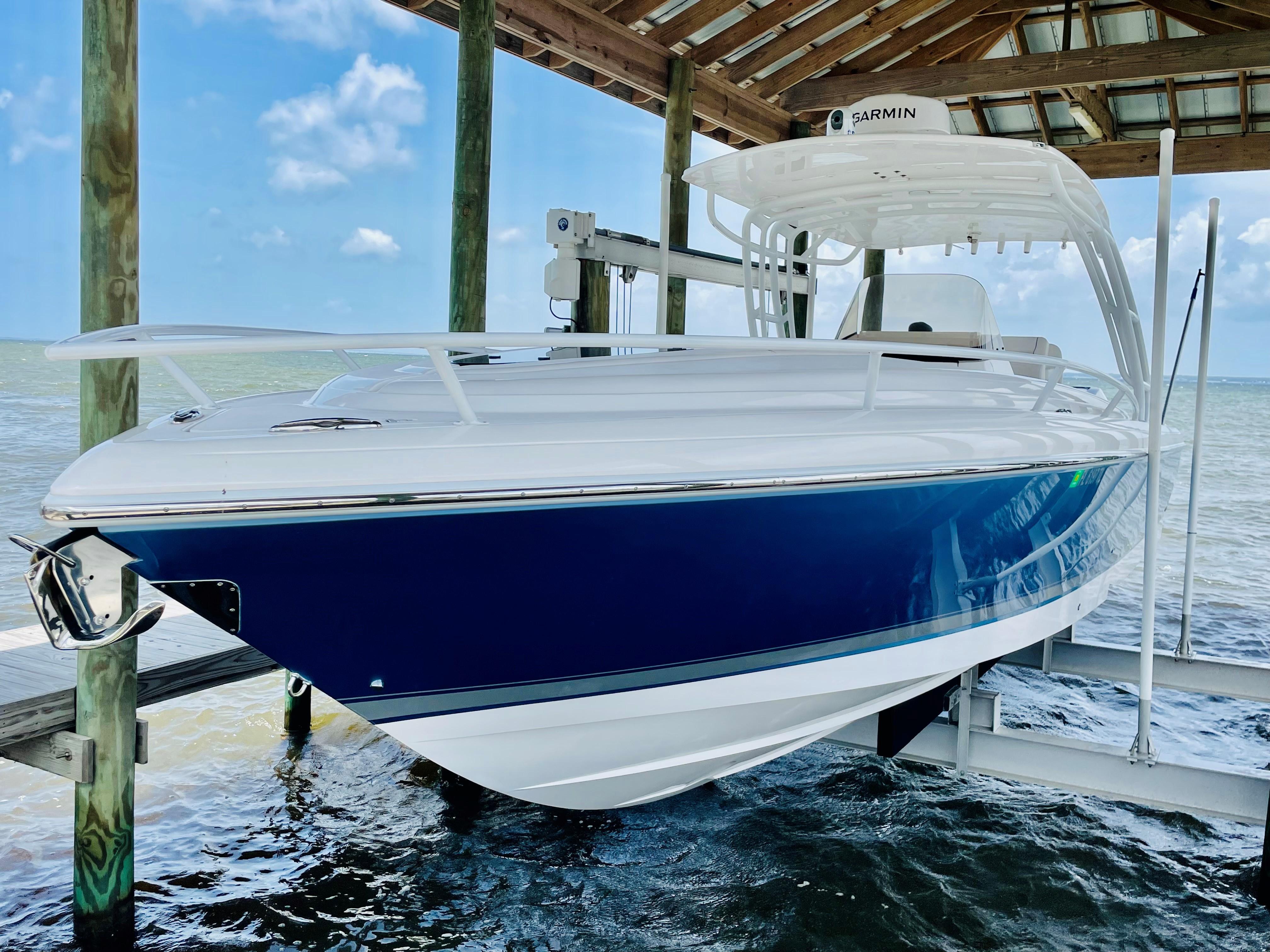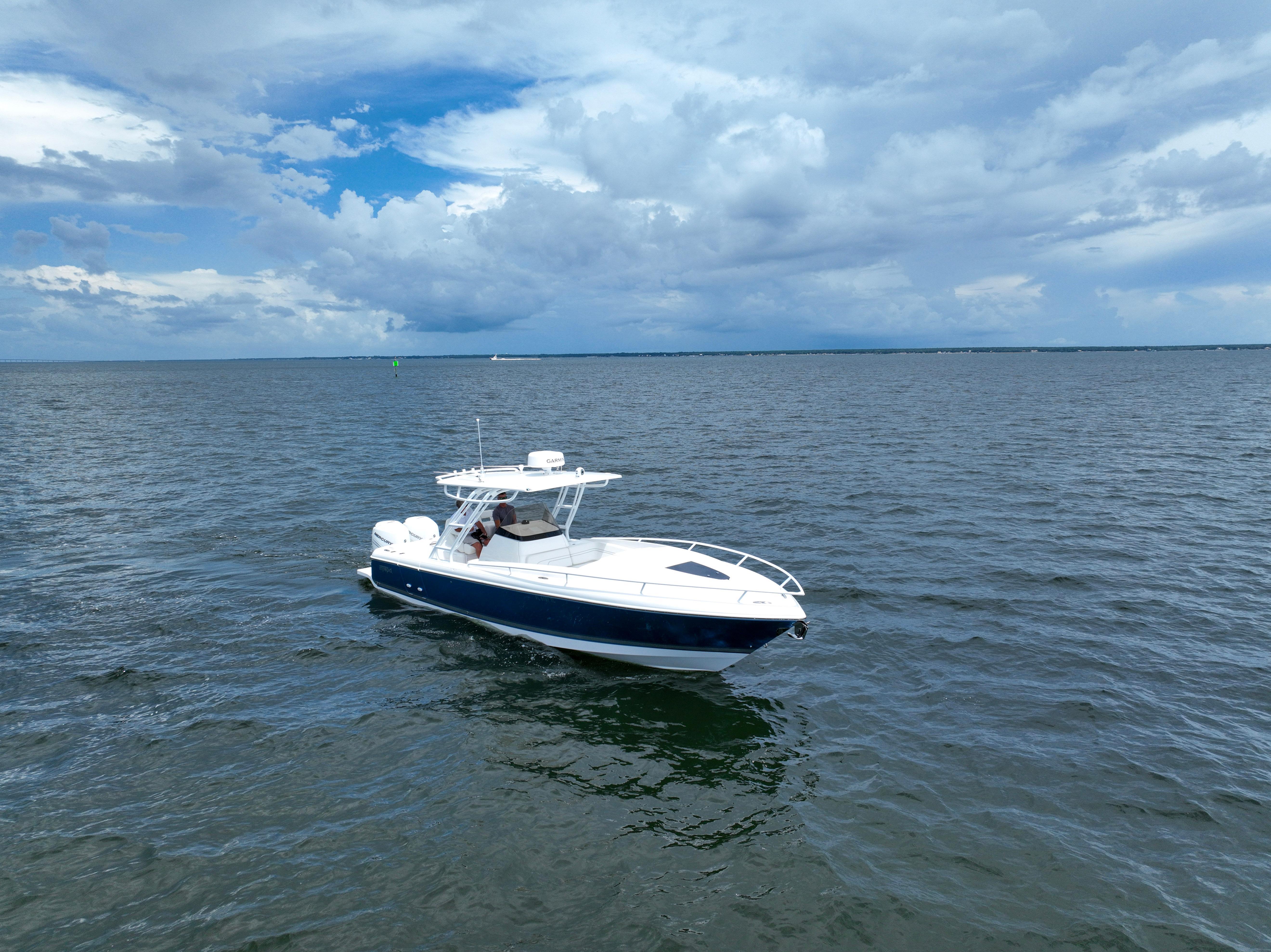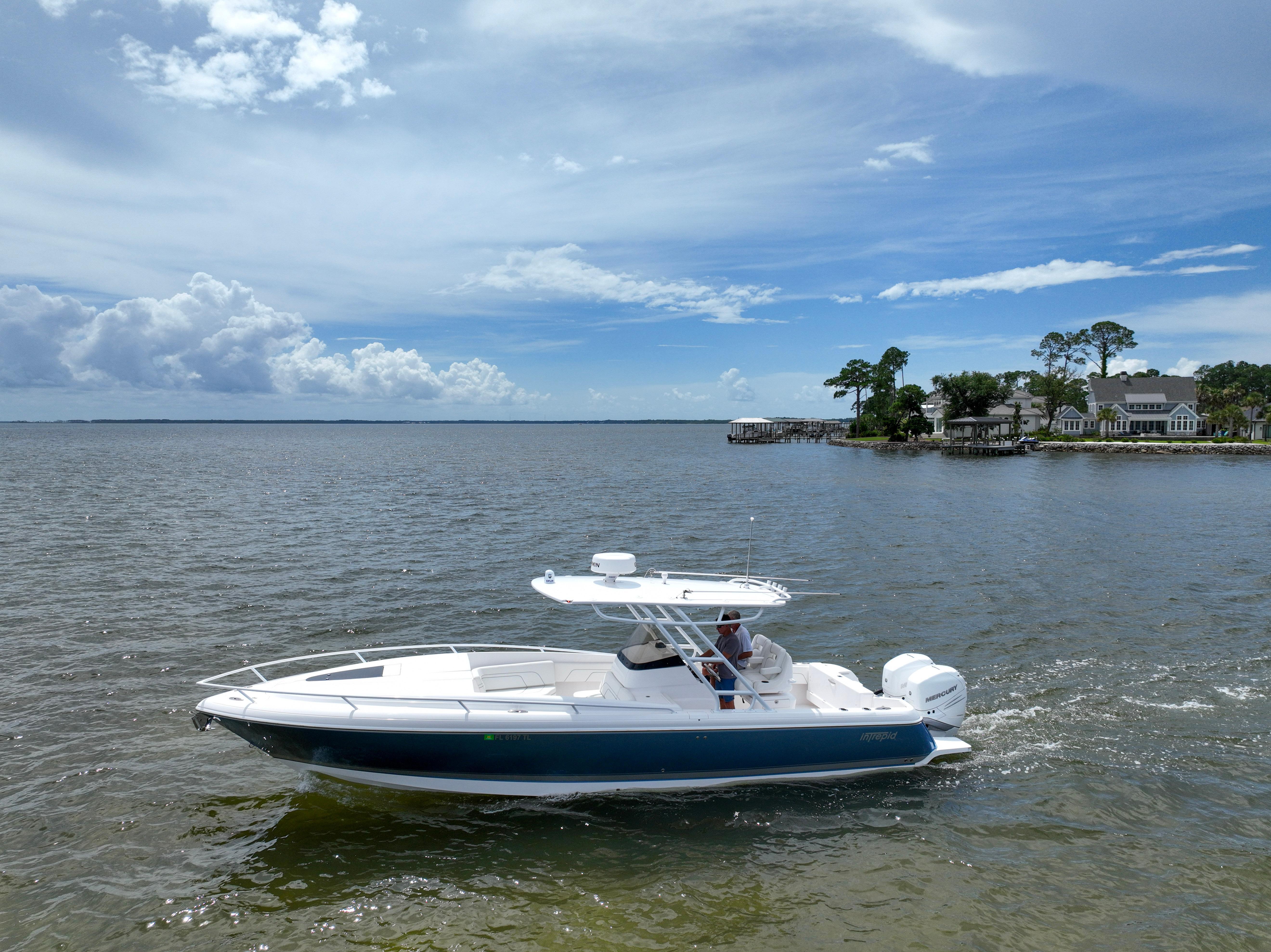 2023 32' Intrepid 327-I Valor for sale- The 327 Intrepid represents a well-versed, excellent running, bespoke of functionality, and a truly enjoyable time on the water. The absolute perfect luxury yacht shuttle vessel or family runabout, the 327 offers a delectable platter to fulfill everyone's needs. Whether you want to partake in offshore fishing, diving, island hopping, or setting up at the sandbar for the day, this Intrepid covers every base without overcomplicating. Twin 350 Mercury Cold Fusion Mercury Verados offer plenty of speed and fuel efficiency, with tremendous handling on its proven high-performance stepped hull. The forward air-circulated cuddy cabin provides enough escape from the elements should you need a break from the wind and sun. A clever side boarding door drops down for easy boarding while swimming or snorkeling with a fiberglass molded step built right in. Most impressive is the ample, well-designed seating, from the fold-down transom seat, comfortable helm, to L-shaped forward lounge seating in the bow. There is even a very convenient electric slide actuator to access the head below the helm. With extremely light use, lift kept and loaded up with options, this one is not to be missed.