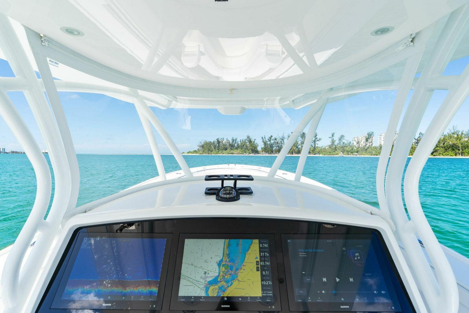 - Custom oversized Palm Beach Towers T-top/hard top with aft supports for extended coverage, rod holders welded to aft legs, Outrigger bases with carbon fiber poles, molded navigation lights, Powder coated white pipework, and Costa Clear windshield panel from HT to console