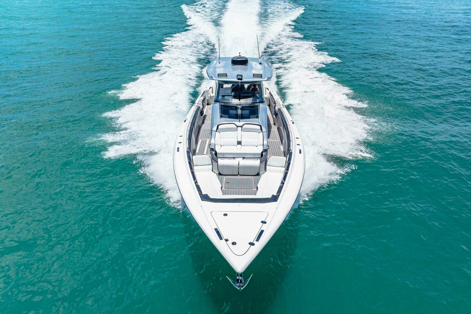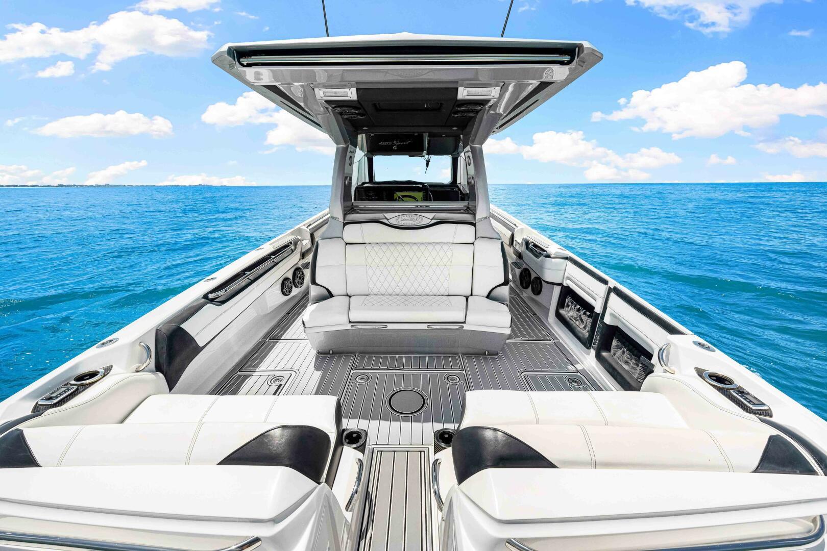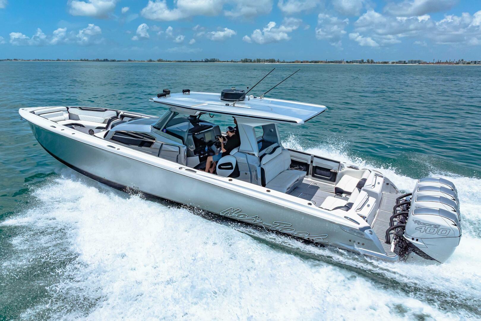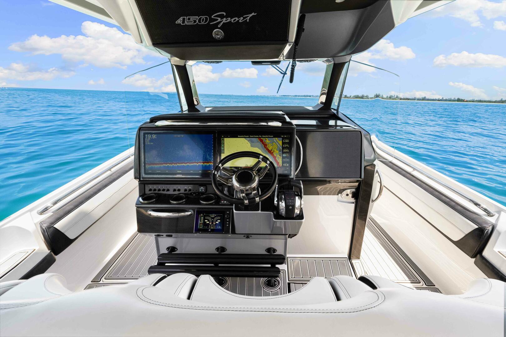 Nor-Tech 450 Sport.The sleek, sweeping lines of this machine are just the start of watching heads turn. The clean, streamlined construction makes this 45-foot boat look even bigger. Everyone will want to be aboard the 450 Sport, and there’s plenty of room and luxurious creature comforts — including a wraparound sofa, Wet Bar, private head with a sink and stand-up shower. The Nor-Tech 450 Sport Center Console is your ultimate hi-performance multi-purpose sporty weekender! Key Features:Twin 22” Garmin display’sBow & Stern ThrusterCold Plate Storage BoxPaint scheme is an elegant Mercedes Iridium Silver with black & white accents Northern Lights Generator (serviced June 2022)