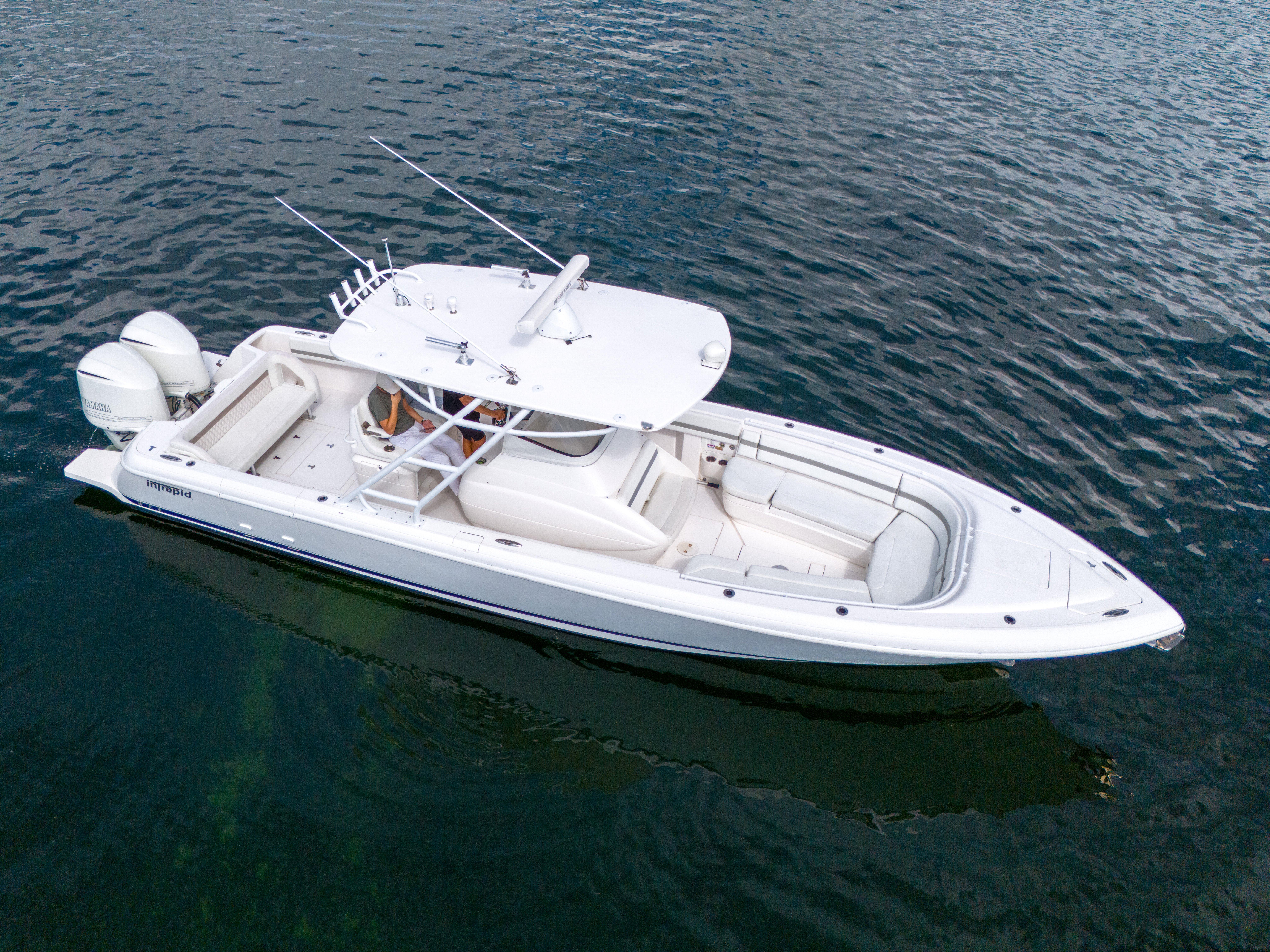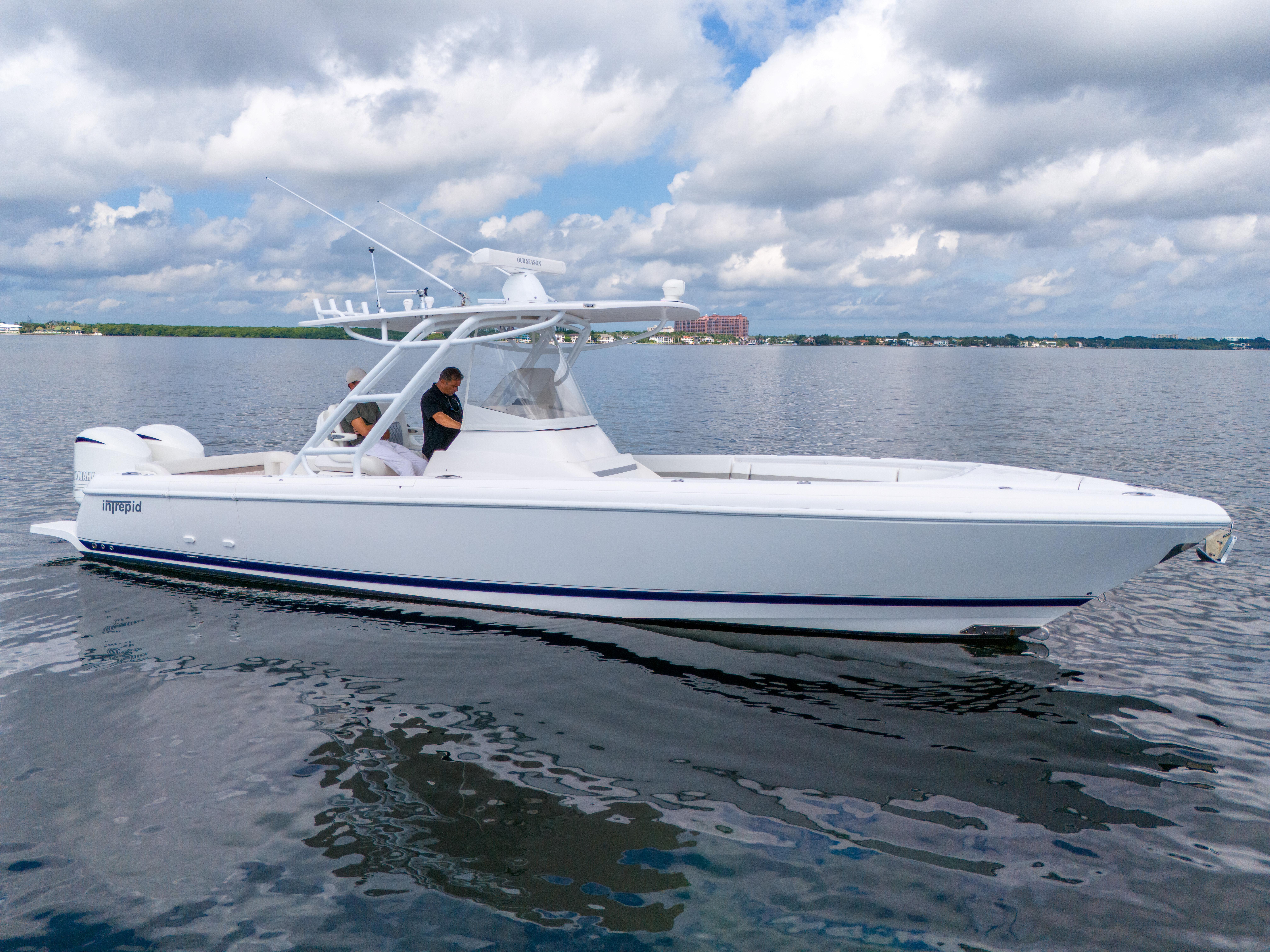 Also designed to serve as the ideal on-board yacht tender, it’s convenient to trailer or tow. Expansive freeboard tops stylish new sheer and tumblehome transom lines. Signature Intrepid comforts include a spacious head and changing room hidden in the console, plush wraparound forward seating with electric backrests, and integrated or removable rear bench seating.