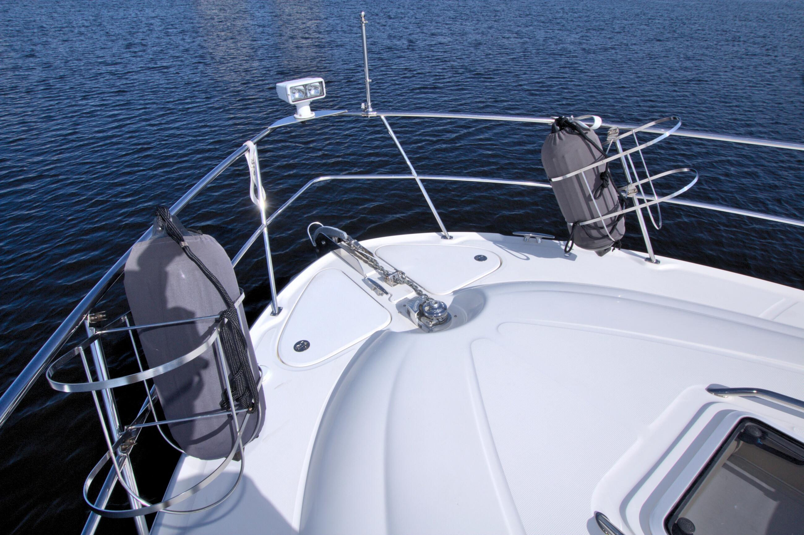 The Sea Ray 480 Motor Yacht features quiet, twin Cummins engines providing a stealthy departure (no wake, of course). For entertaining, the large aft deck has a wet bar with an ice maker, as well as a stereo with four speakers, and a remote control. A fiberglass hardtop protects passengers from the elements, and textured steps lead to the swim platform with concealed stainless steel three-step ladder. The walkways leading to the foredeck are wide and textured for safe passage, and a cushion turns the area into a large sun pad.