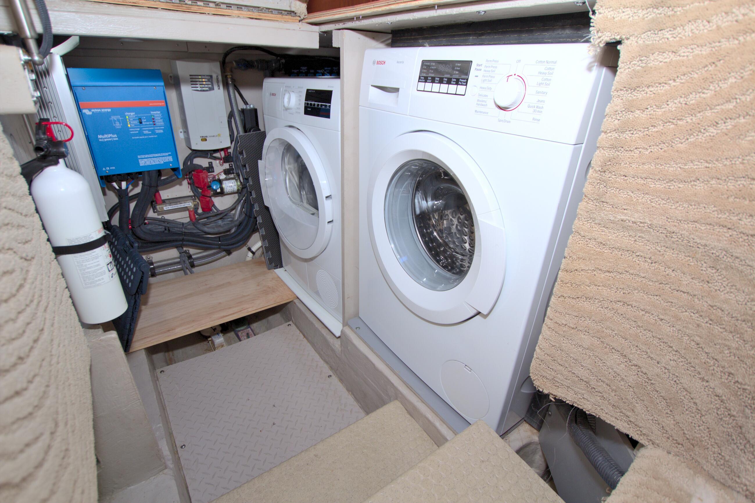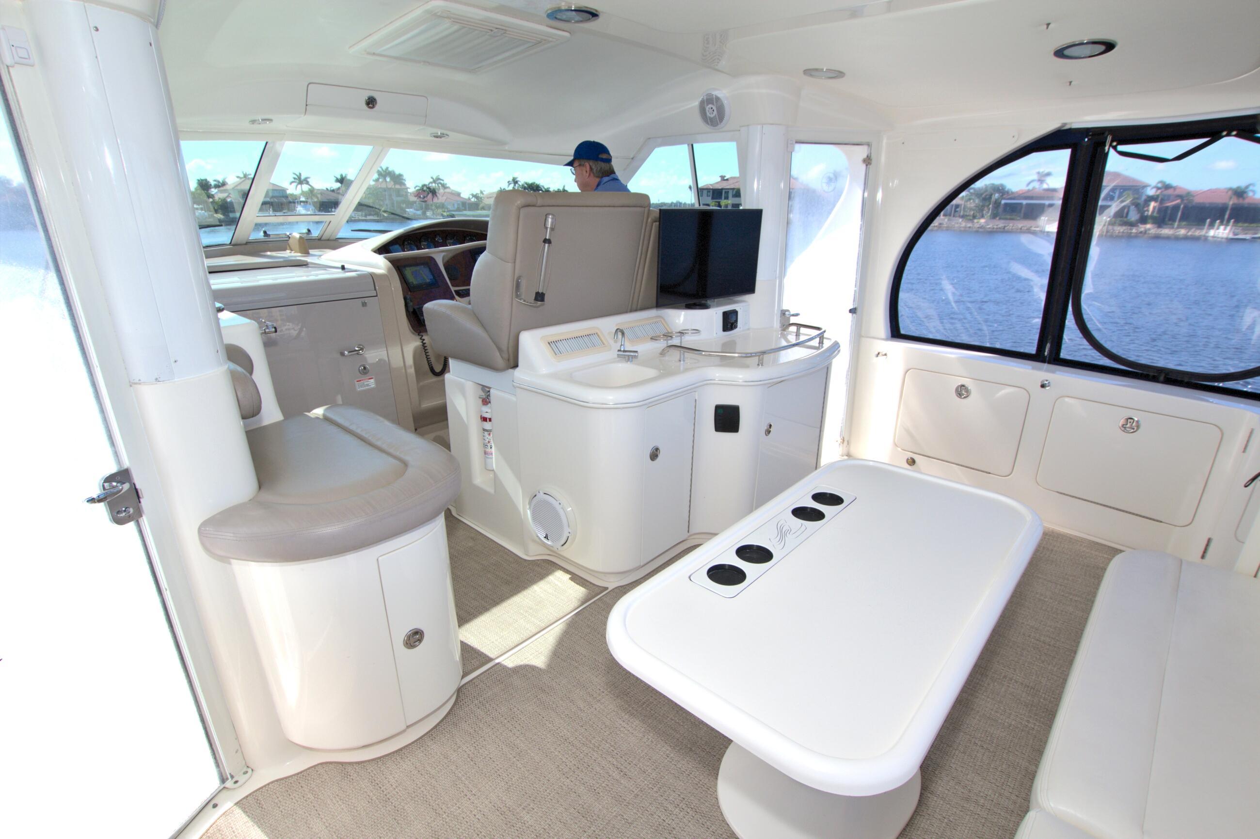 Practical in design and more sociable than flybridge yachts, the 480 allows owners and guests to enjoy the ride together in the comfort and security of the enclosed aft deck. Below decks, the comfortable interior is roomy and luxurious. A long U-Shaped Ultraleather lounge dominates the salon with its recessed lighting, elliptical windows, and built in entertainment center. Both the galley and dinette are open to the salon and there are two staterooms forward, one with a double berth and the other stretching beneath the salon sole, with twins. Note that a washer/dryer combo unit is fitted in a utility space underneath the galley stairs.