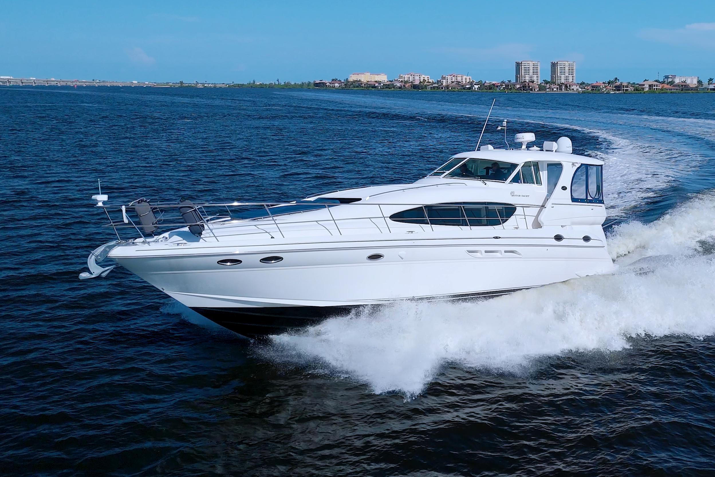 2003 Sea Ray 480 Motor Yacht – “You, Me and the Sea” Upgraded, Well-Maintained, Loop-Ready“You, Me and the Sea” is a highly upgraded 2003 Sea Ray 480 Motor Yacht powered by twin Cummins QSM11 diesels (635HP each, 1120/1125 hrs) with full 1,000-hour service completed. She features major upgrades including a Yacht Controller remote docking system, Victron inverter, separate washer/dryer, Garmin electronics, and bow thruster, making her ideal for long-distance cruising, liveaboard, or America’s Great Loop.Highlights & Upgrades:Twin Cummins QSM11 engines, serviced (2021)Yacht Controller with wireless remote for easy dockingVictron 3000W inverter/charger w/ extra Lithium house batteries (2023)Bow thruster (Vetus) w/ new AGM batteries and 24V charger (2022–23)Separate Bosch washer & dryerOnan 13.5kW generator (875 hrs), serviced 202112" & 8" Garmin displays, HD radar, autopilot, Vesper AIS800lb dinghy davit, spare props, hard bottom paint (2023)Glendinning Cablemaster, ISO Boost shore isolatorFour 240V A/C zones + helm A/C, quiet interior with excellent soundproofingCruising speed: 22 MPH @ 1900 RPMInterior Layout:3 Staterooms / 2 Heads, both with separate showersFull-beam master stateroom aft with Tempur-Pedic queen, ensuite head/shower, vanity, ample storageVIP stateroom forward with centerline queen, private head accessThird stateroom converts from twins to king-size bed, ideal for kids or storageLarge salon with Ultraleather wraparound lounge, 42" Samsung Smart TVGalley features Kenyon 3-burner stove, Nova Kool fridge/freezer, microwave, deep storageCentral vacuum, custom lighting, teak décor touches throughoutHelm & Flybridge:Fully enclosed helm and aft deck (Martini deck) for all-weather cruisingElectric helm seat, Garmin electronics suite, spotlight, engine monitors, trim tabs32" Samsung TV on deck, wet bar w/ ice maker and stereoThis model remains one of Sea Ray’s most popular and well-appointed motor yachts—ideal for cruising Florida, the Bahamas, or going full-time. You, Me and the Sea is ready to cruise today.