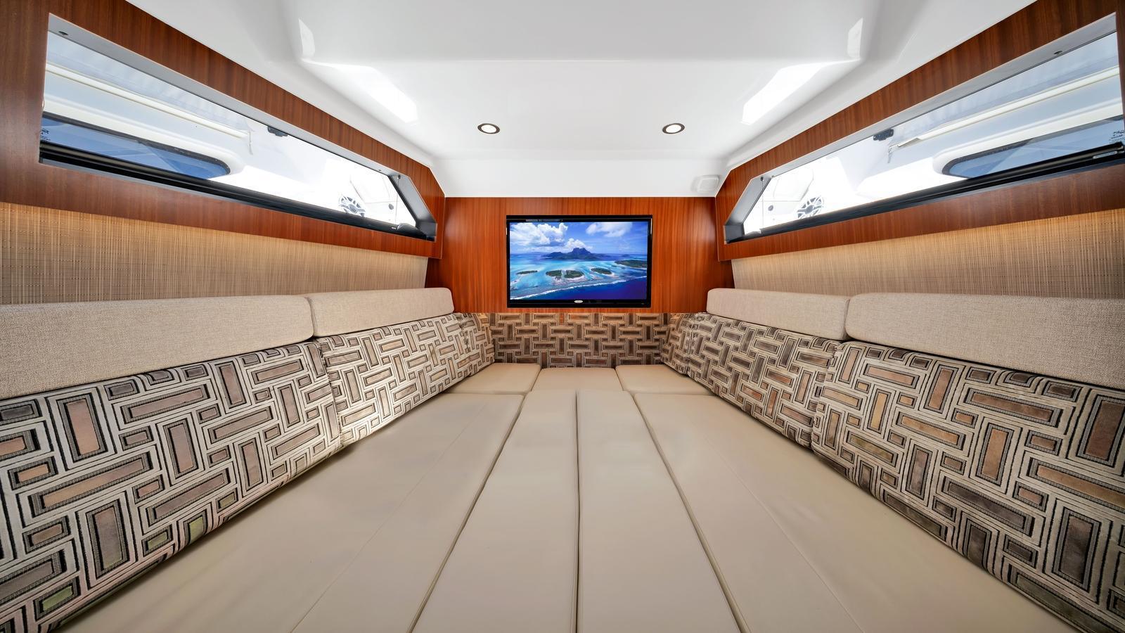 - Forward bow seating with storage underneath, with electrically operated forward-facing backrests that fold into the hull sides.