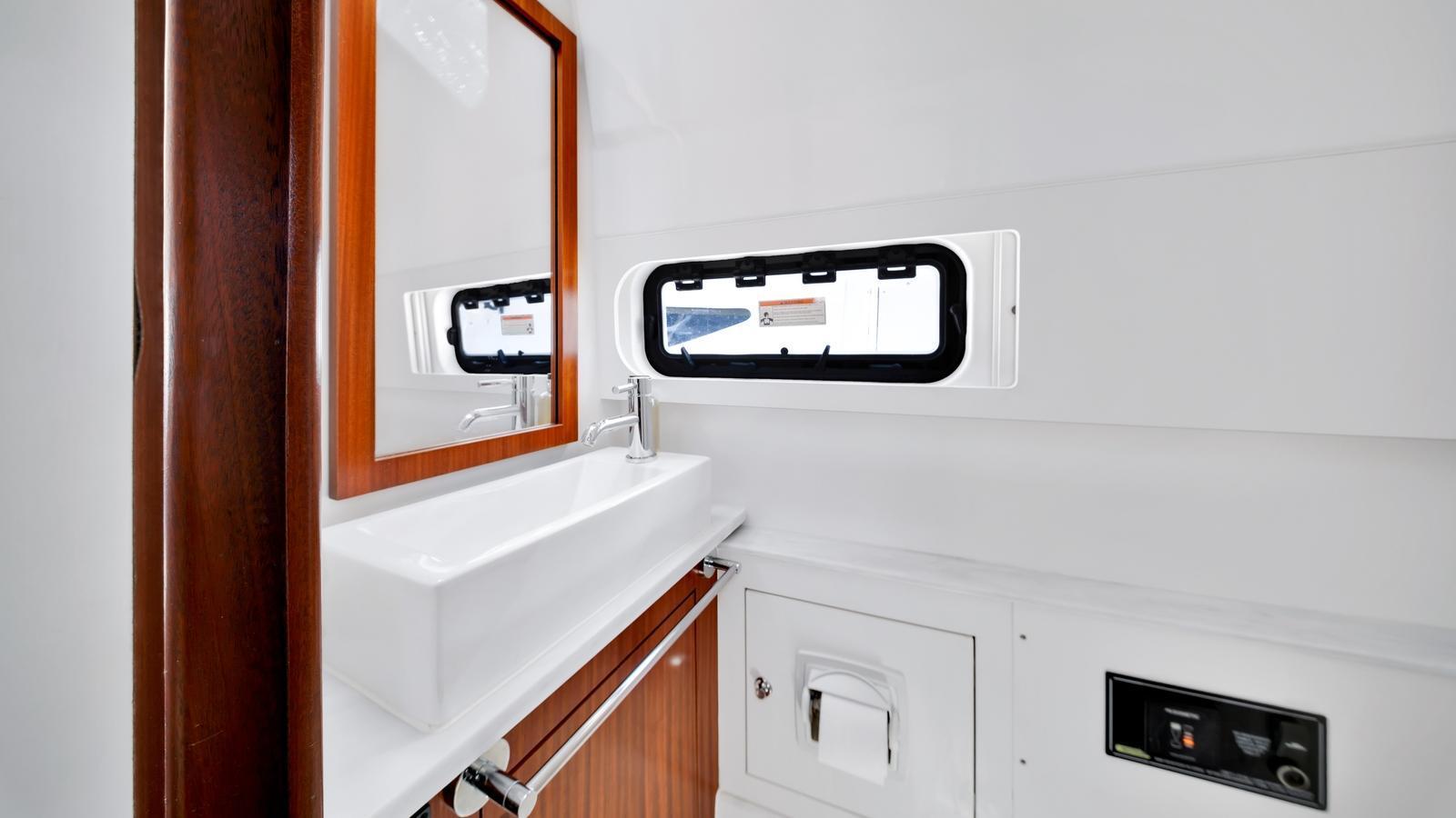 - Starboard side head with vanity/sink, marine head, and shower wand.