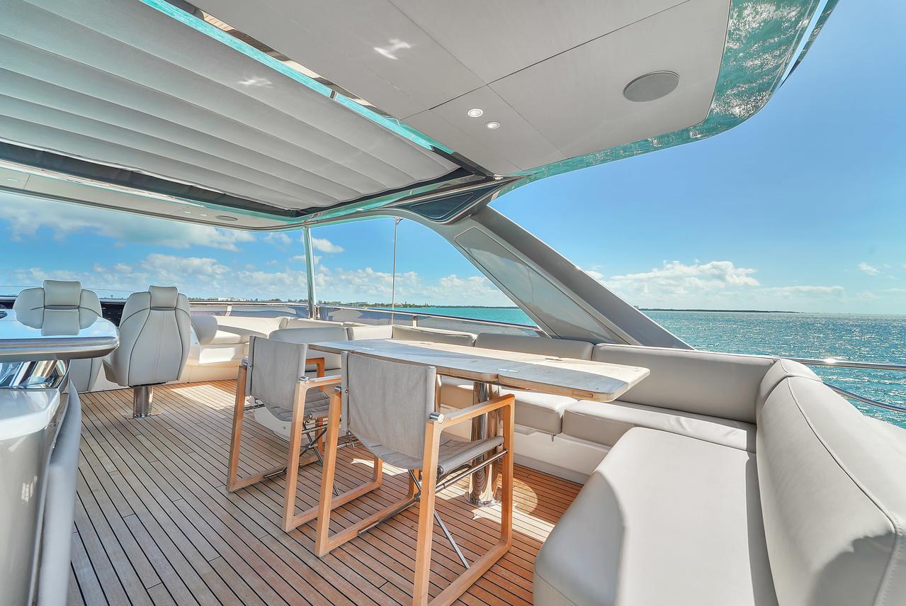 - Flybridge wetbar with BBQ, icemaker, drawer refrigerator, sink, waste bin and storage