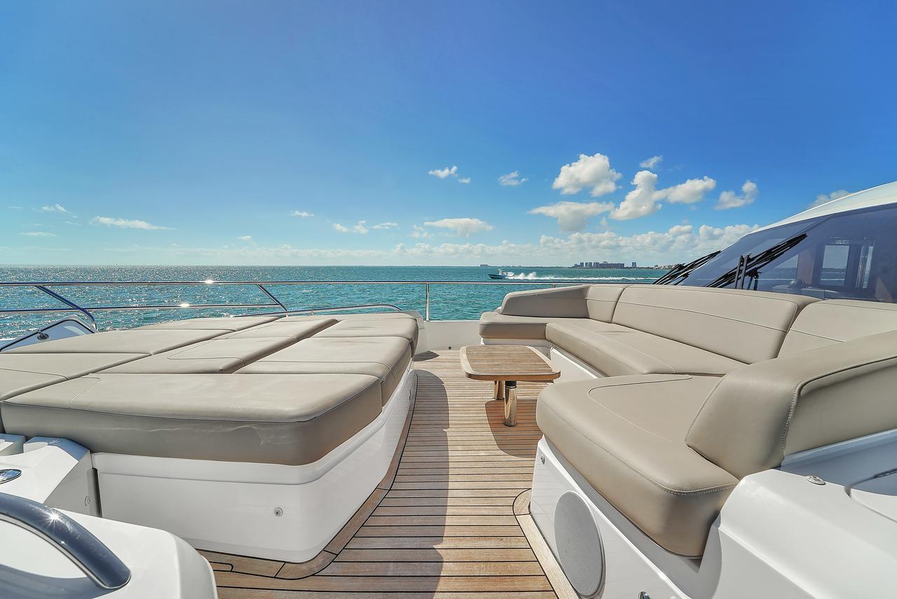 - Foredeck sunbathing area with integrated adjustable headrests and storage