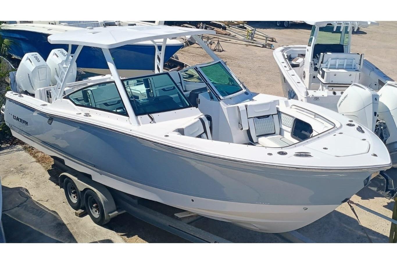 If you need performance as much as you need fishability, throttle up the 302DC. This boat’s unique hull features Michael Peters two step hull design which helps boost performance and creates an impeccably smooth and dry ride. Blackfins 302DC also comes standard with everything you need for serious fishing, while boosting an incredible crossover design making it the perfect vessel for enjoying your time on the water with friends and family as well.OPTIONSEngine: WHITE Mercury Twin 400XXL V10 Verado DTS 800HP WHITE JoystickColor Scheme: Whisper Gray Colors: Whisper Gray Sheer Stripe · Whisper Gray Hull · Whisper Gray Boot Stripe · Arctic White Hard Top Underside· Arctic White BottomUpholstery Options· Feather Upholstery Hull & Deck· Anchor Rode, All Chain· Rub Rail Insert-White (In Lieu of Std. Black)· Swim Platform Inlay - Sea Dek · Underwater Lights, RGB LEDCockpit· Dive Ladder · Grill, Electric with Inverter Canvas· Aft Shade-Gray · Bow Shade for Hardtop-Gray· Bow Cover-Gray· Cockpit Cover-GrayGarmin Electronics Package· Dual GPS/Chartplotter-Garmin 8612, w/Fusion Link, B1751KW Transducer, Garmin 315 VHF