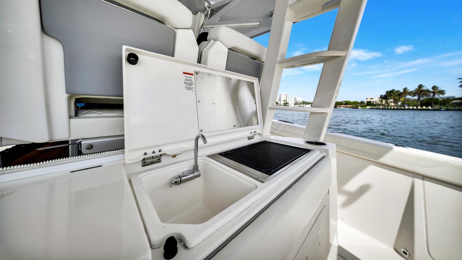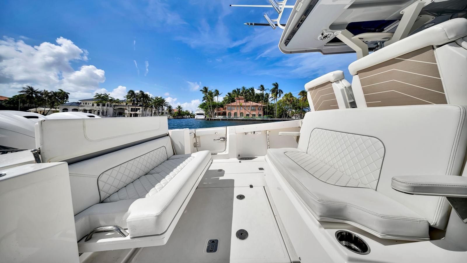 The Pursuit S 428 sport is designed flawlessly from the inside out with expansive decks and thoughtful layout features that cater to every lifestyle. Whether unwinding in comfort, sun-seeking, socializing, or fishing, the S 428 offers multiple zones for every pursuit.At the bow, you'll find one of the best seats in the house for sunseekers - the oversized chaise loungers just forward of the helm, along with additional bow bench seating and a removable center table, perfect for dining alfresco or gathering over drinks. Aft, the well-designed cockpit features two livewells, fish boxes, and an oversized fridge/freezer. Powered mezzanine bench seating slides forward to maximize space or shifts aft for easy access to the summer kitchen, complete with a top-loading fridge, grill, and sink. Complemented by a hullside beach platform that lowers hydraulically for easy water access, a retractable sunshade, transom seating, and an additional stowaway table, the S 428 is as ready for adventure as it is for hosting.The climate-controlled interior cabin accommodates two guests and includes a dinette seating area that converts into a double berth. Filled with natural light through the hullside windows, the cabin also features a flat-screen TV, microwave, hanging locker/storage, and an en-suite head with a shower, providing all the necessary conveniences for long days on the water.Powered by quad Yamaha 425 XTO engines, the Pursuit S 428 Sport features a cruising speed of 27 knots and a top speed of 50 knots. Thanks to her joystick controls and Seakeeper stabilization, she cruises efficiently, confidently, and offers a remarkably smooth ride. Outfitted with Garmin's premium navigation suite and built to the highest standards, the S 428 is an exceptional combination of performance, precision, and craftsmanship. Whether anchored at the sandbar, escaping for a weekend getaway, or reeling in the catch, the S 428 is a standout in its class and checks every box for versatile cruising.Key Features:Yamaha Quad 425 XTO enginesSeakeeper SK6 Gyro StabilizerCarbon hull with black boot stripe Fully loaded with rod holders, outriggers, and an electric cockpit sunshade