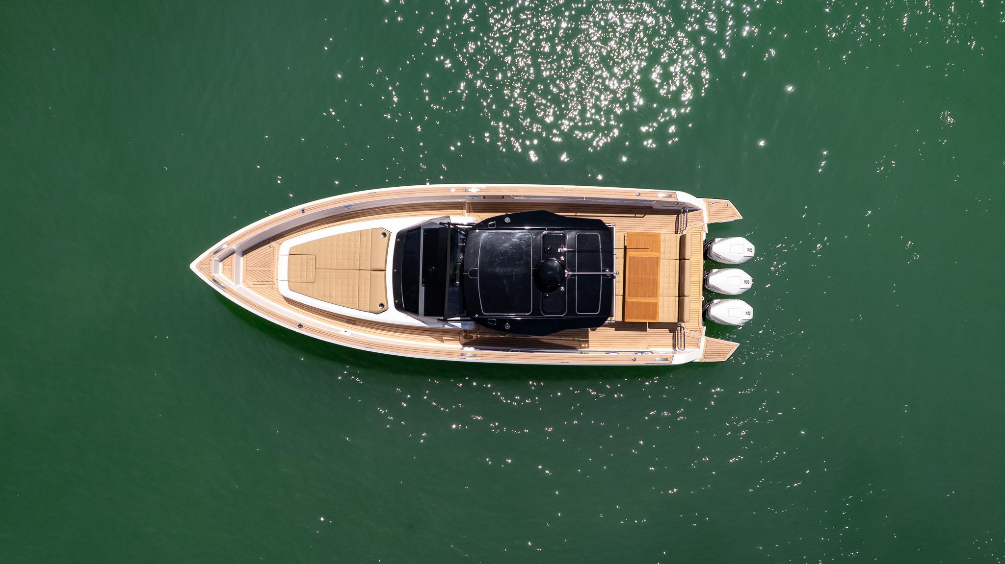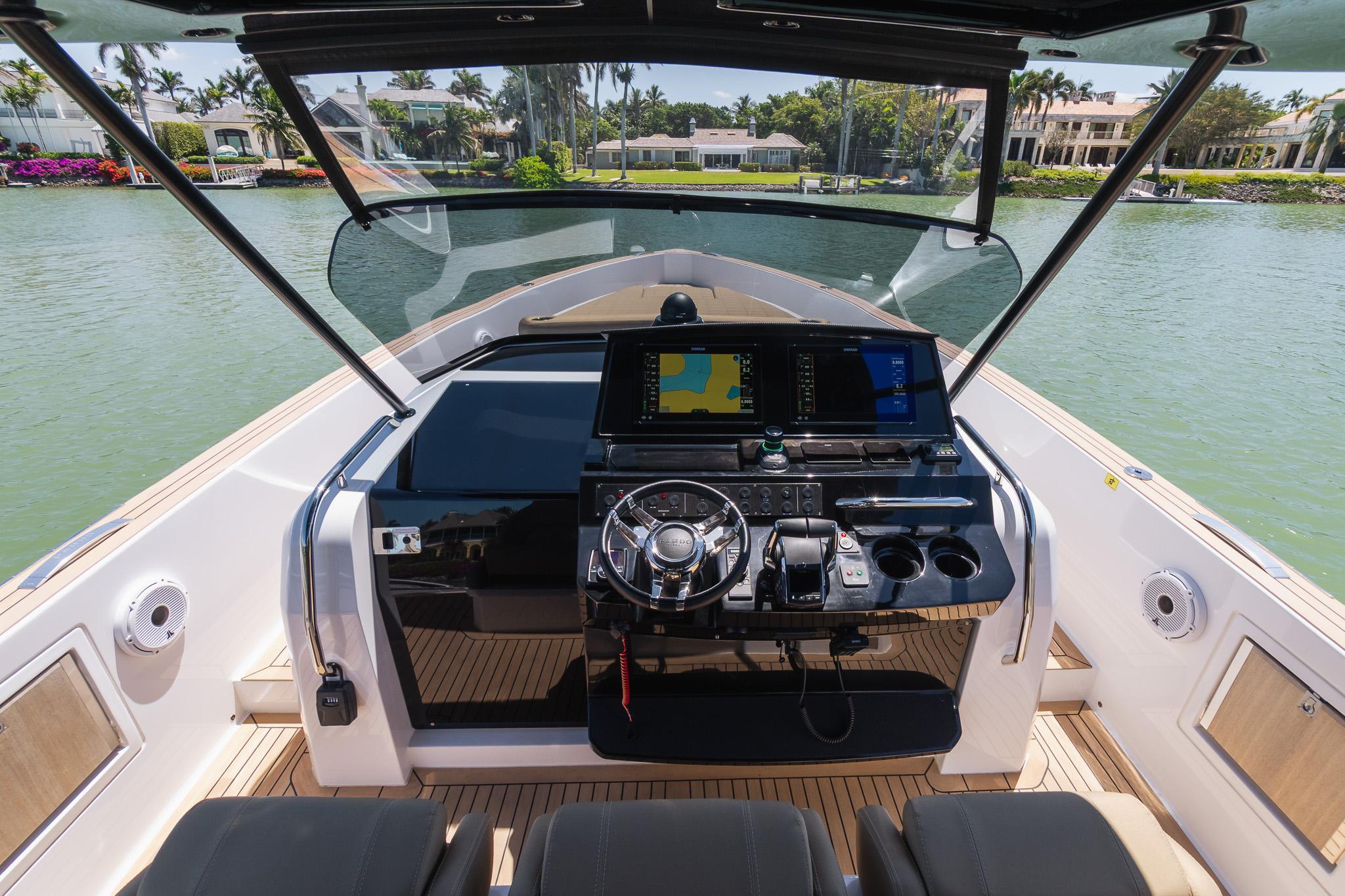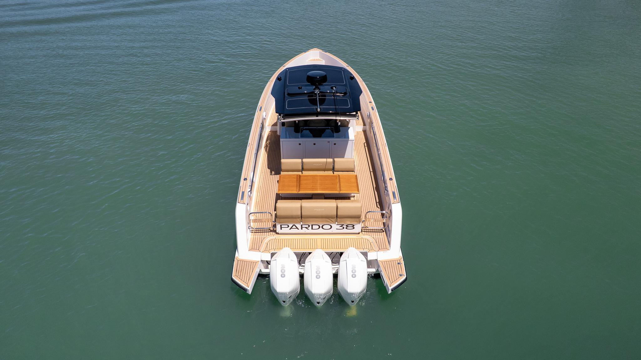 DEALER DEMO...BOAT INCLUDES FULL WARRANTY AT POINT OF SALE (2 YEARS PARDO, 3 YEARS MERCURY) ...DO NOT MISS OUT ON A GREAT OPPORTUNITY. A blend of design and performance defines the Pardo 38, the 'small' outboard in the walkaround range, which enhances the essence of the Pardo character with its reverse bow and sleek lines. The addition of outboard engines further amplifies its sportiness, ensuring higher speeds and thrilling performances. Perfect for daily outings with family and friends, safe and easy to maneuver, the P38 Outboard promises adrenaline and fun for owners seeking an even more spirited driving experience. Also ideal as a luxury tender for large yachts, each P38 Outboard is a masterpiece of Italian design, capable of merging tradition and innovation, with extensive customization options to meet the desires of the most demanding owners. The deck plan maintains the walkaround configuration, ensuring versatile spaces for enjoying the sea at any time of the day. The central cockpit, multifunctional, quickly transforms from a living area for 6/8 people to an additional large sunbathing area. The fixed T-top, made of lightweight and durable carbon fiber, protects the dining area and helm, with the possibility of extending the shade towards the stern thanks to an integrated retractable electric bimini. The outboard engines, positioned at the stern, not only free up additional space on board but also provide an even more dynamic aesthetic and unparalleled propulsive thrust. The interiors of the P38 Outboard maintain the flexibility and minimalist style that distinguish the model. Two layouts are available: a standard configuration with a double cabin and bathroom, or a layout with a second aft cabin with twin beds. Thanks to the choice of outboards, the interior spaces gain additional livability, with volumes optimized for excellent comfort on a 38-foot boat.