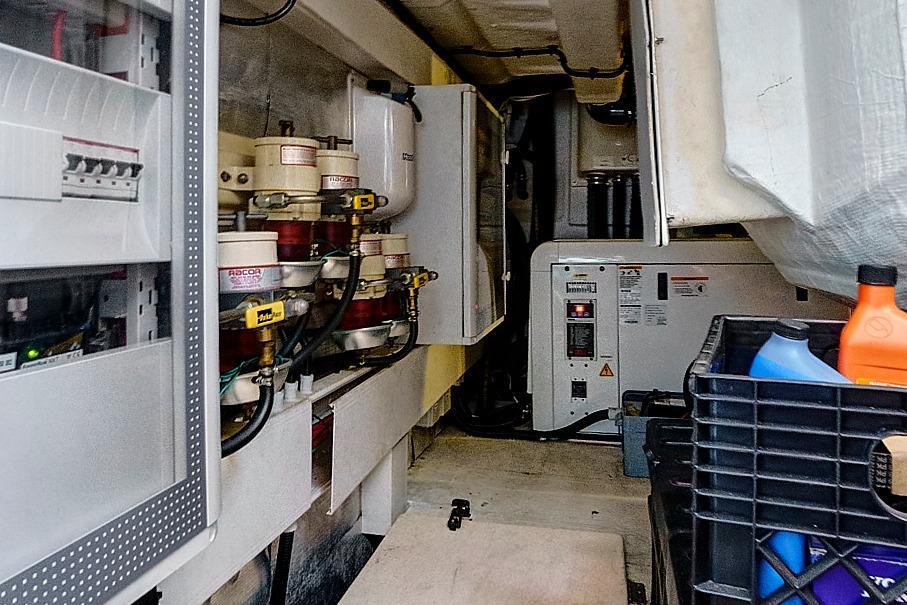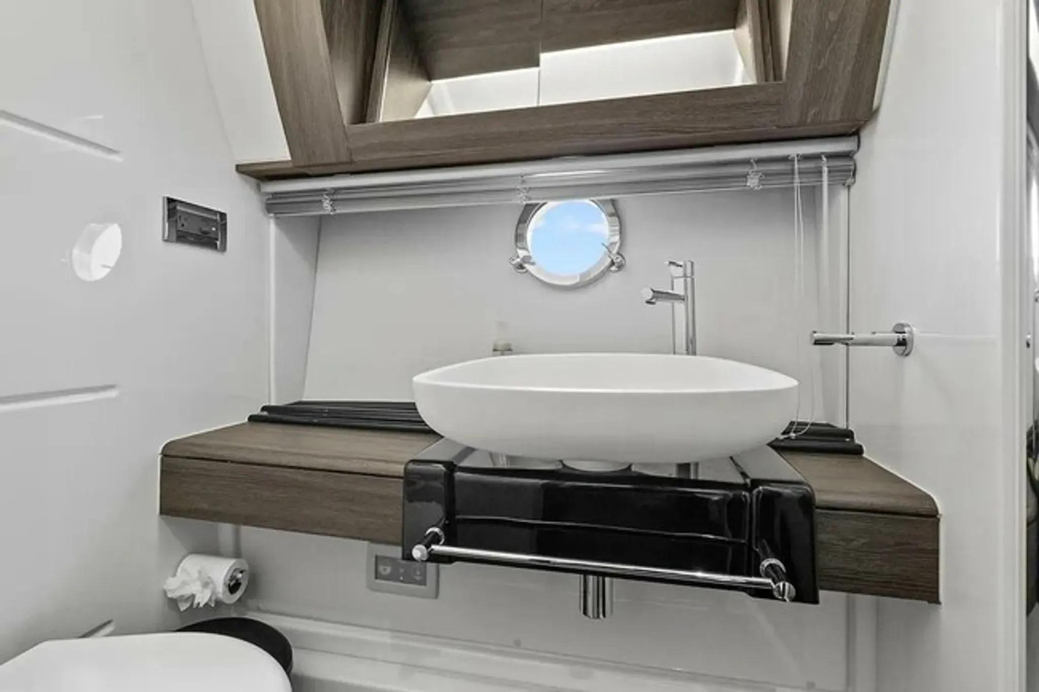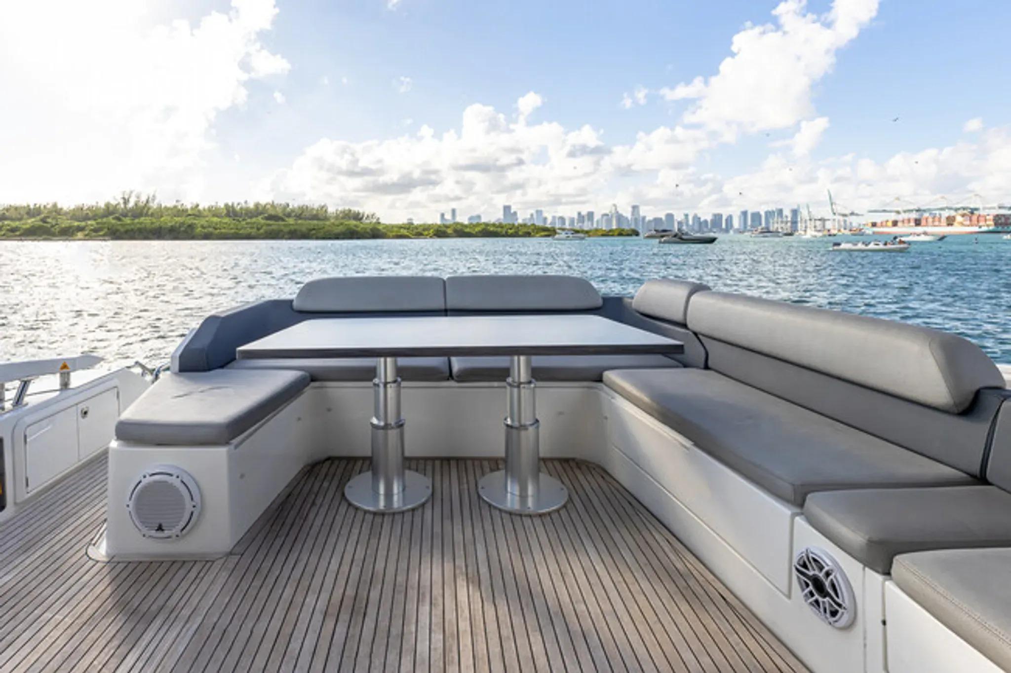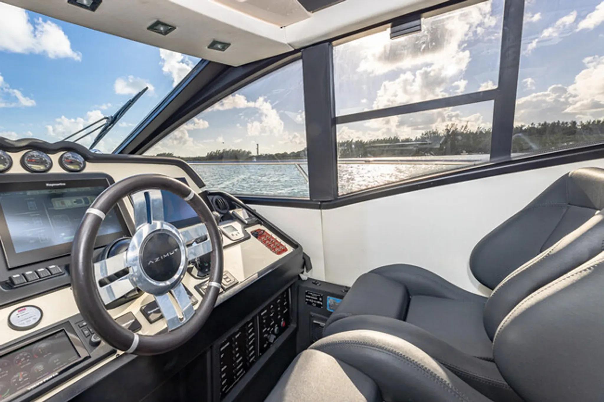 Main Salon and GalleyThe Azimut's sleek profile is accentuated by two forward windows, side windows that stretch alongside the length of the vessel and sliding glass doors that effortlessly link the covered aft deck to the salon. The abundant use of glass not only lends to the yacht's stylish, low-profile exterior but also floods the interior with natural light. Inside, you will find a generous seating area with cream wooden floors, white modern cabinetry, and contemporary chrome detailing. The dining table and discreetly integrated amenities including a sink, Miele induction cooktop, and oven, make it the perfect layout for creating any of your culinary wishes. Additionally, the Fusion surround sound system equipped with Bose speakers, TV, and large seating area, are all made for entertaining. Lithium is the ideal blend of contemporary design and functionality.