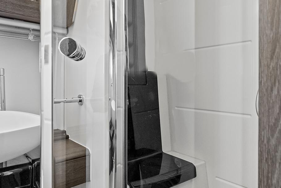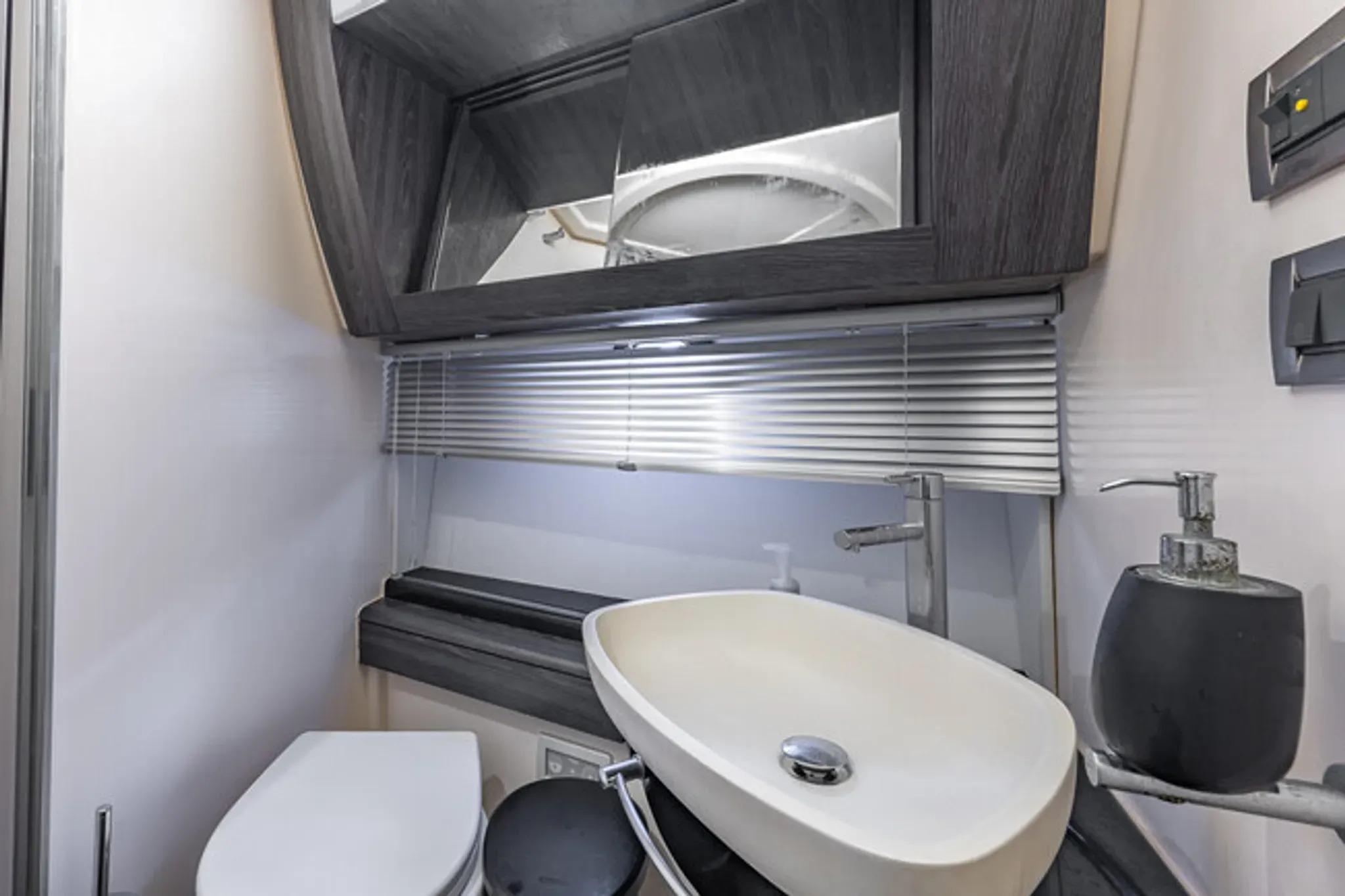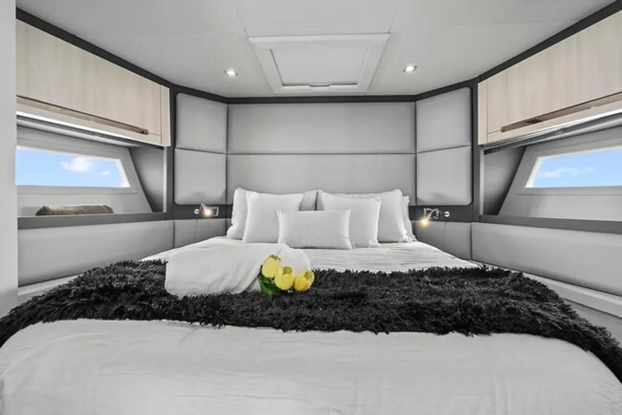 The spacious VIP stateroom, located at the bow, features a plush queen-sized bed, padded headboard, skylight, and TV. Additionally, the headboard features stylish light fixtures which can be used for softer lighting. The large windows and skylight flood the room with light. Above the windows are modern white wooden cabinets with silver accents which provide ample storage space, as well as two full-length closets where clothes can be hung. The adjacent bathroom is functional and stylish equipped with a spacious shower, mirror, and a porthole for extra light.