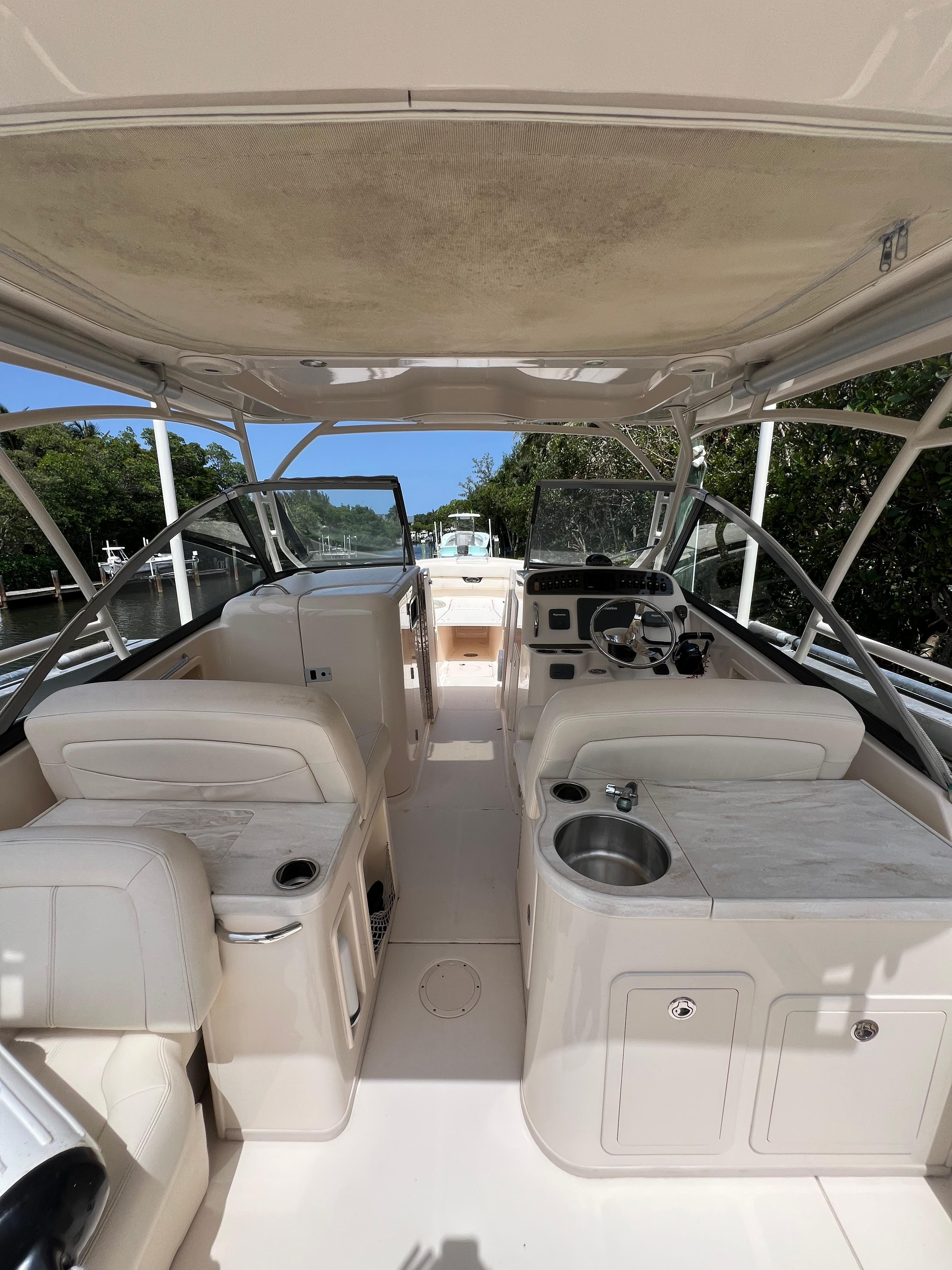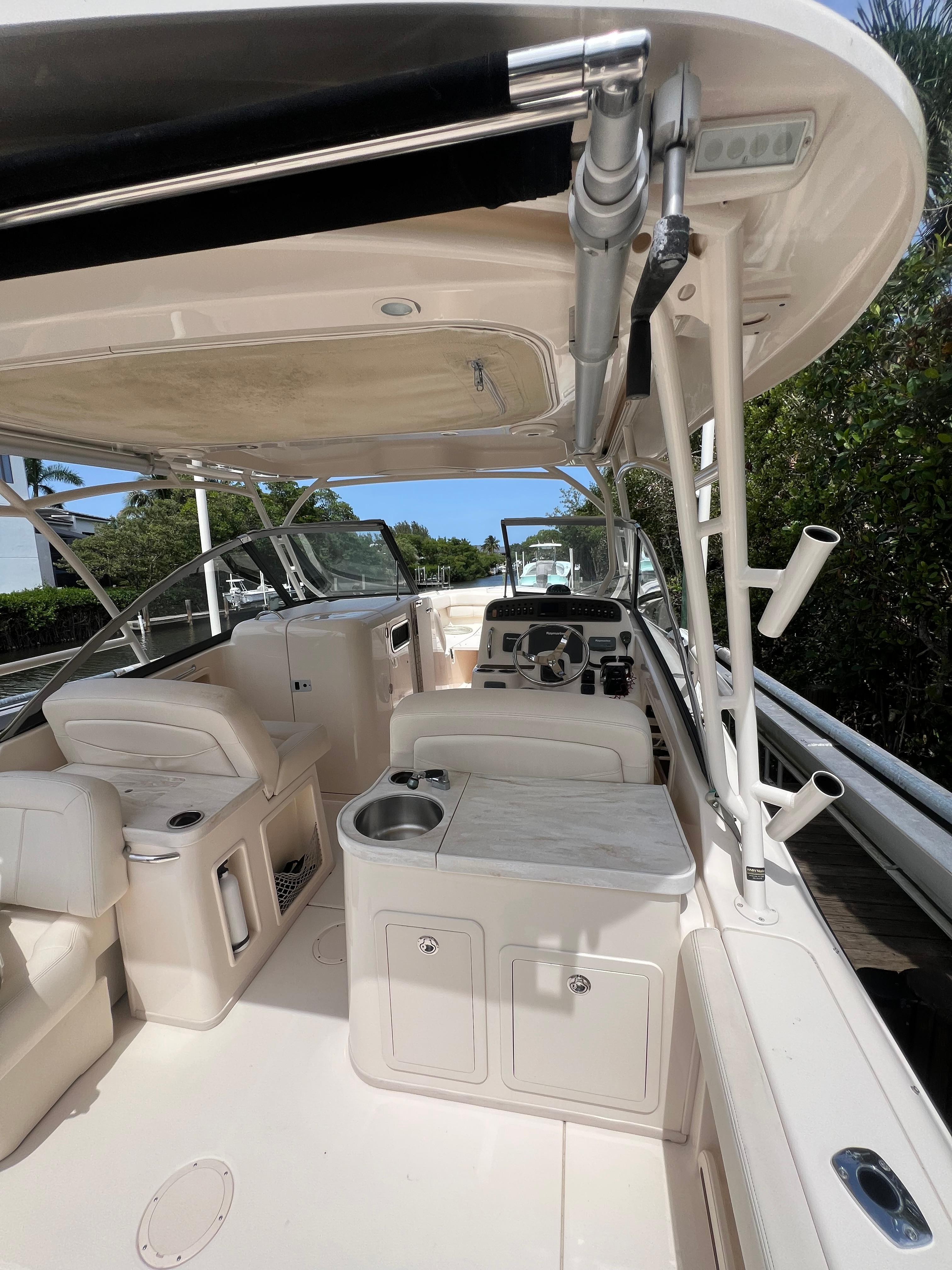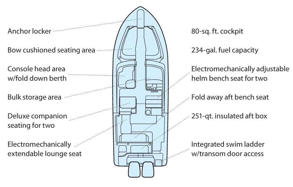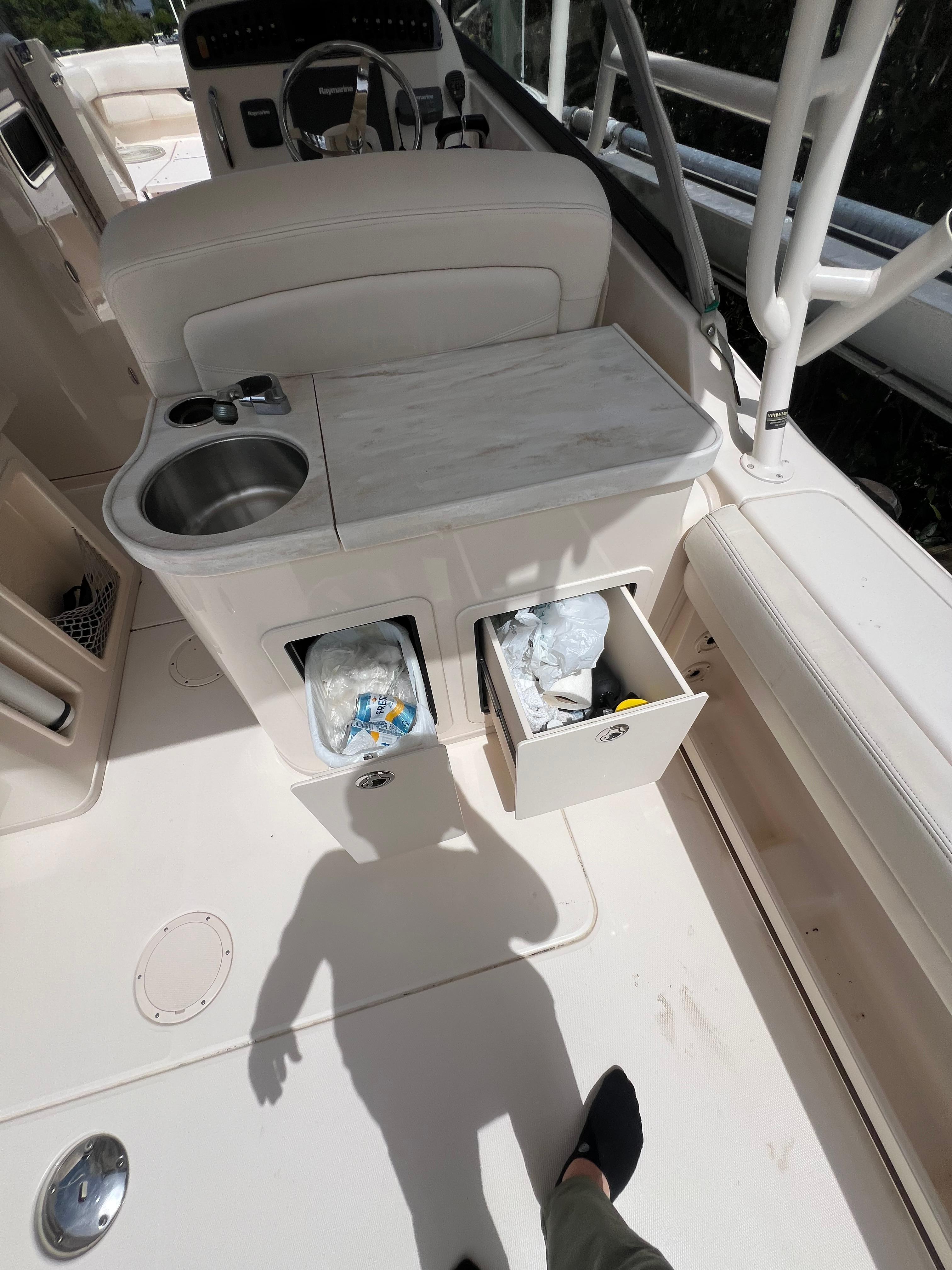 - Wet bar w/sink, storage drawers, trash bin, drink holders (2) & fire extinguisher holder (integrated with electronically adjustable helm seat)