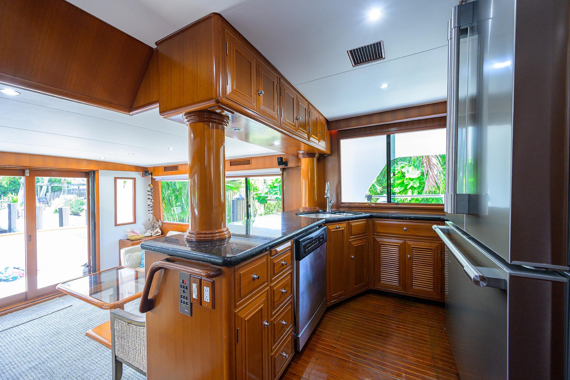 - Up two steps and open to the salon, the galley is a cook's dream