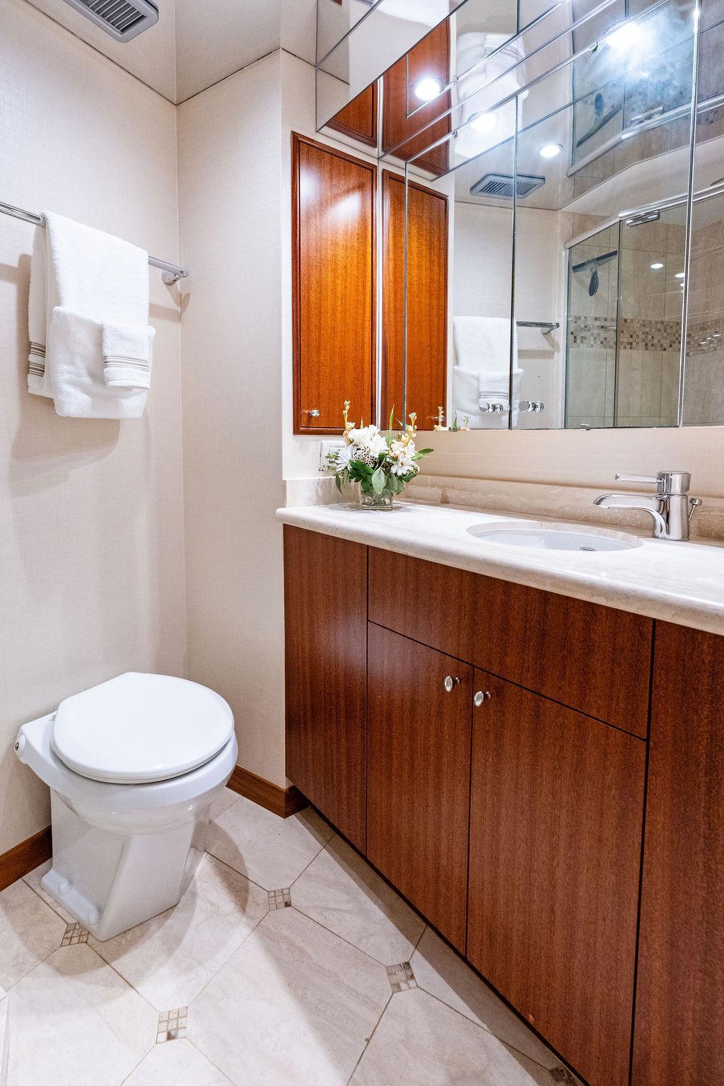 Making your way back to the salon we proceed forward to the starboard side and, before descending to the staterooms below deck, we come upon the day head, which is nicely appointed with satin wood cabinets, a granite counter top and mosaic tile covered walls. Upon reaching the bottom of the stairs we make our way aft to the full beam master stateroom. The room is a work of symmetry. The king bed is center with identical night stands, twelve drawer dressers, triple port lights and large closets positioned on each side. There is an en suite on each side joined together in between with a glass enclosed shared shower. The entry door is off centered to starboard as a large flat screen TV is off to port. All the way forward in the companionway is the VIP stateroom with a raised bed on center, storage cabinets each side and matching hanging closets. The spacious en suite has a glass-enclosed shower. The guest stateroom to port has a queen bed with overhead cabinets, two nightstands, dresser drawers for storage and a hanging closet. This stateroom has a single hull port light. The en suite is spacious as well. Across the companionway is the twin guest stateroom with a storage cabinet and dresser drawers. This room is en suite as well with ample space. There is storage below all the stateroom beds and a stacked washer and dryer in the companionway.