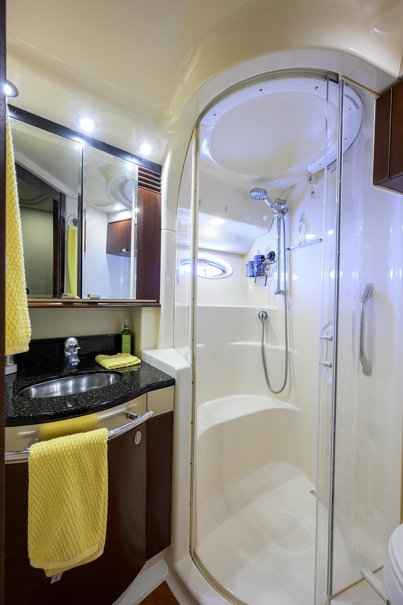 The master stateroom is located forward with an island queen berth and ensuite head with enclosed shower stall. It is equipped with ample storage, and it’s own A/C unit. The VIP suite is located to port with a queen berth and ensuite shared head with enclosed shower. The bunk room is located to starboard with two twin bunks.