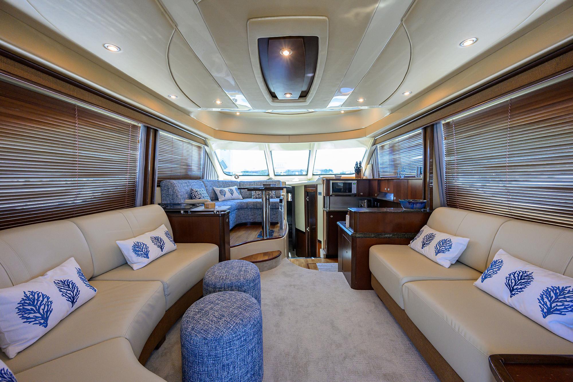 The salon has two generous wraparound sofas located outboard on both sides. There are stainless steel framed sliding doors aft and large windows wrapping around the entire area gives the salon very open feel.