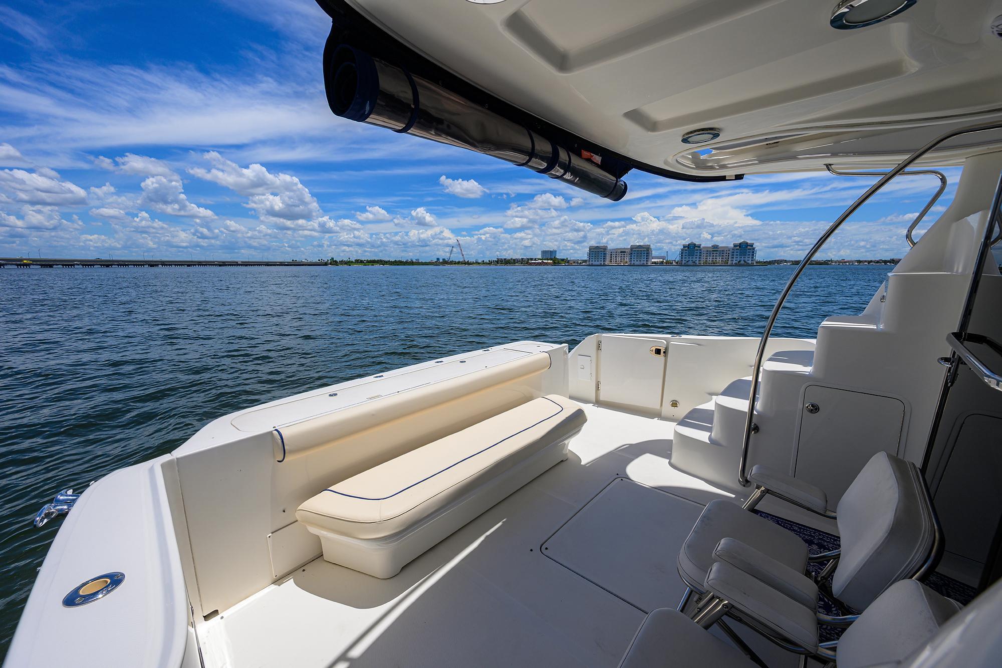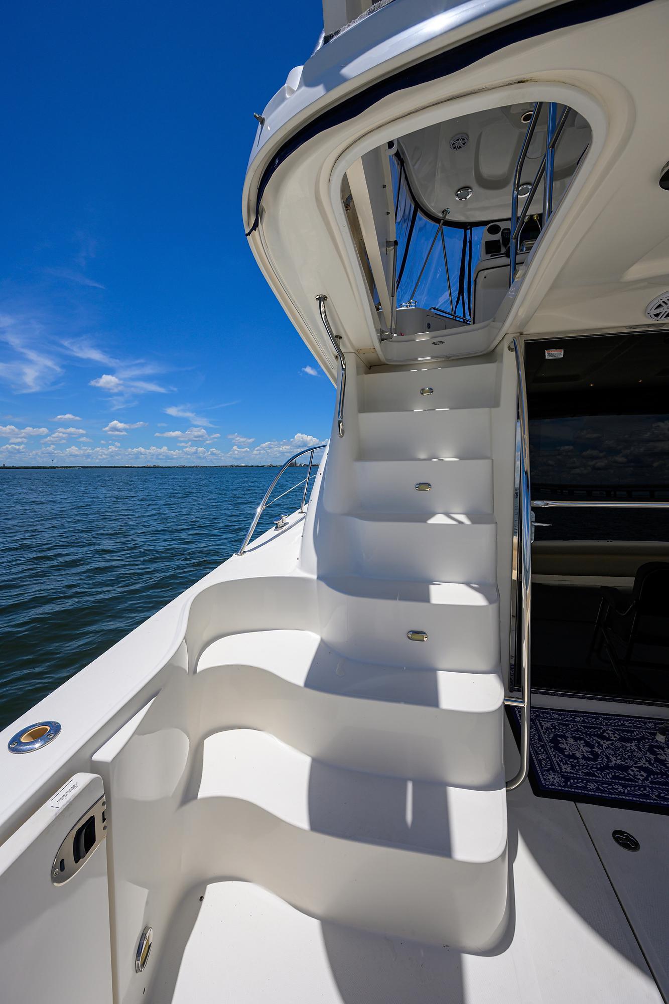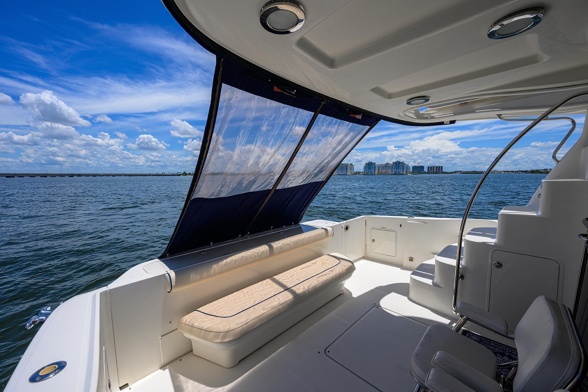 FlybridgeThe flybridge is accessed via molded in fiberglass steps on the port side. There is a centerline aft located helm with two pedestal mounted helm chairs, a bench seat aft, large U-shaped settee forward to starboard and a wet bar with a refrigerator and sink to port. The flybridge is enclosed with isinglass and air conditioned. Navigation is a breeze with the updated Garmin 7612 chartplotters.