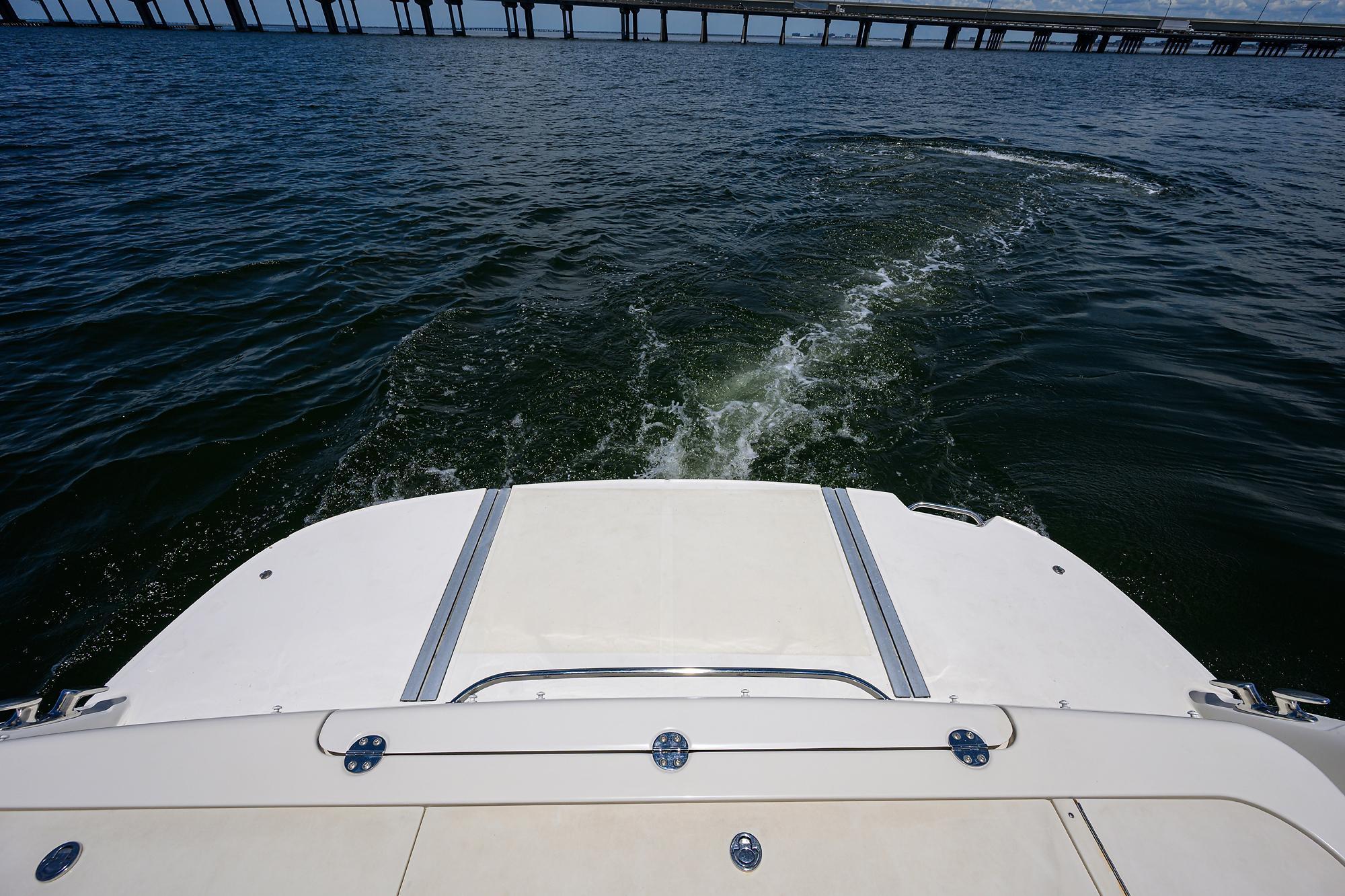 Aft Deck / PlatformThe aft deck has a molded bench seat and two folding chairs. A large deck hatch is located in the floor with access the engine room. The fixed swim platform allows easy access to the dock or enjoying some time in the water. There are molded in steps on either side allowing gentle access to the side decks and bow where there is a large sun pad. The platform has a large storage locker to accommodate gear as well as several smaller cabinets on the aft deck.