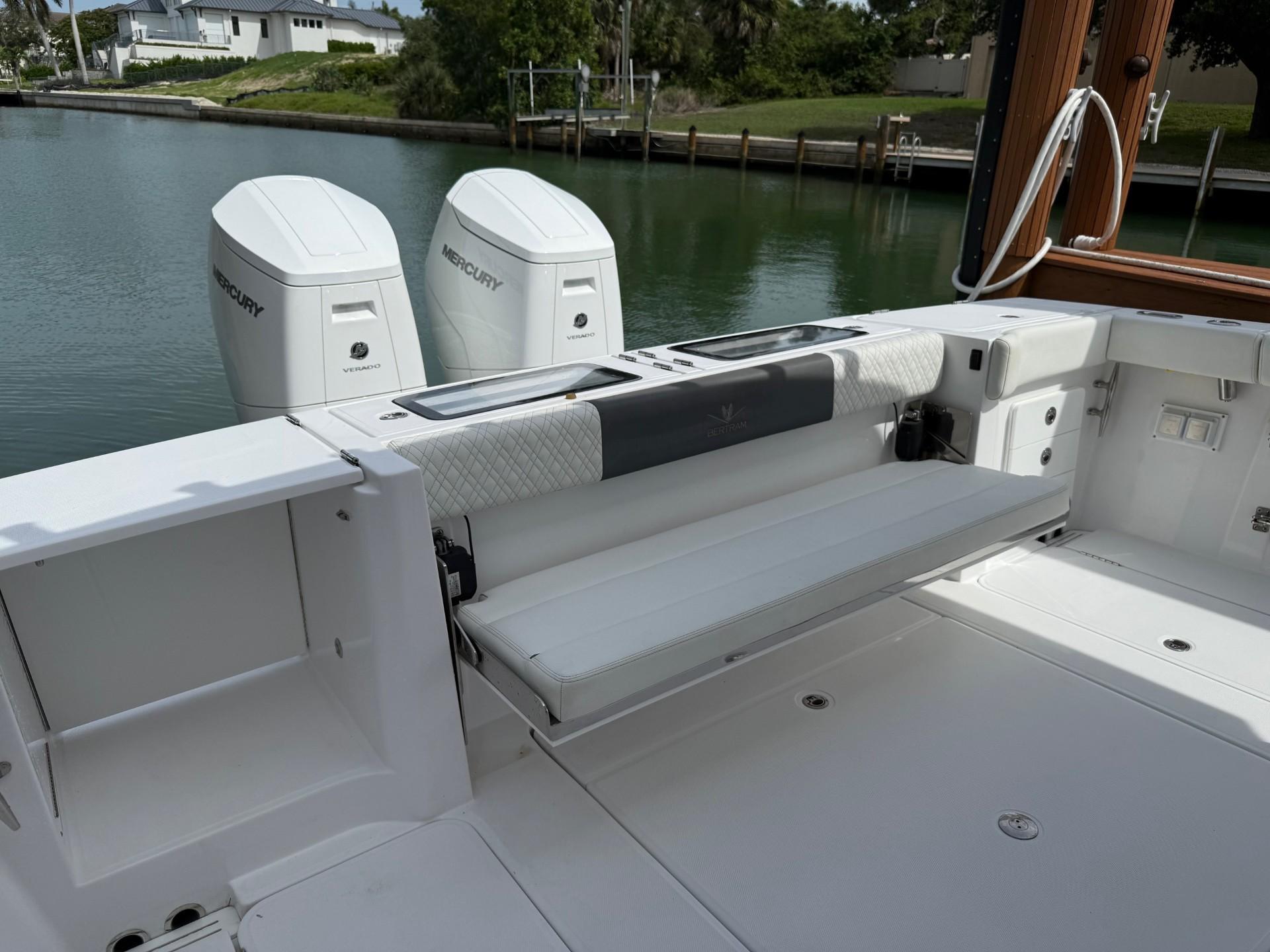 Aft-facing mezzanine seat with built in tackle center behind backrest