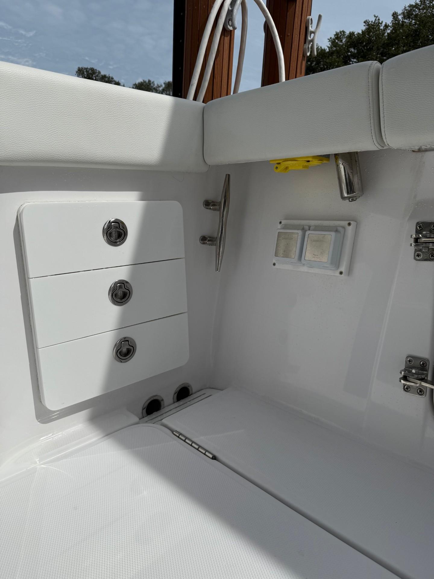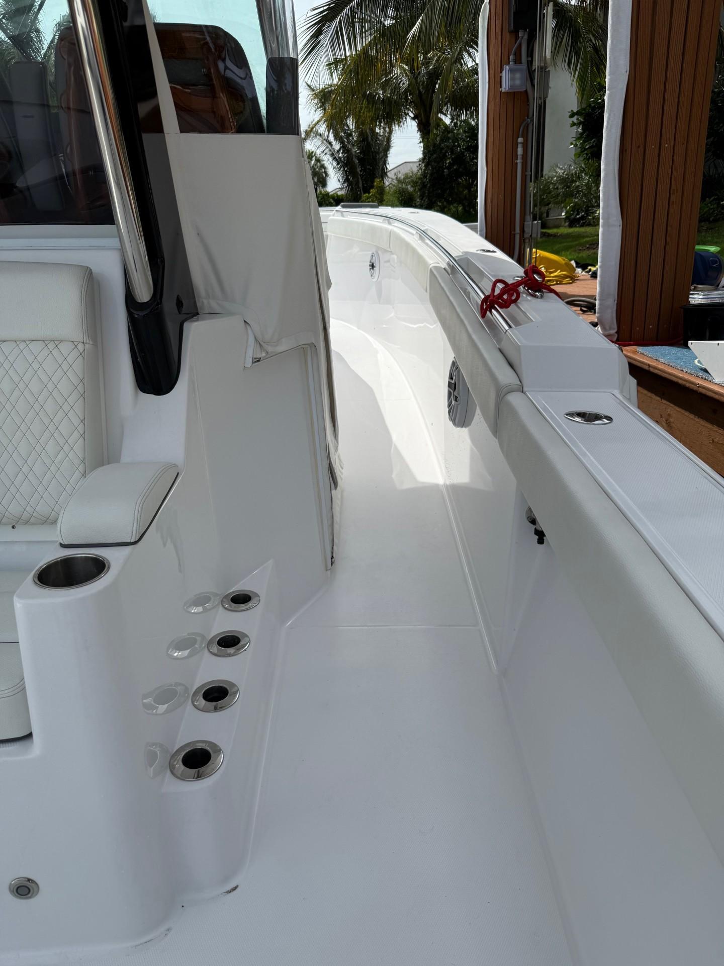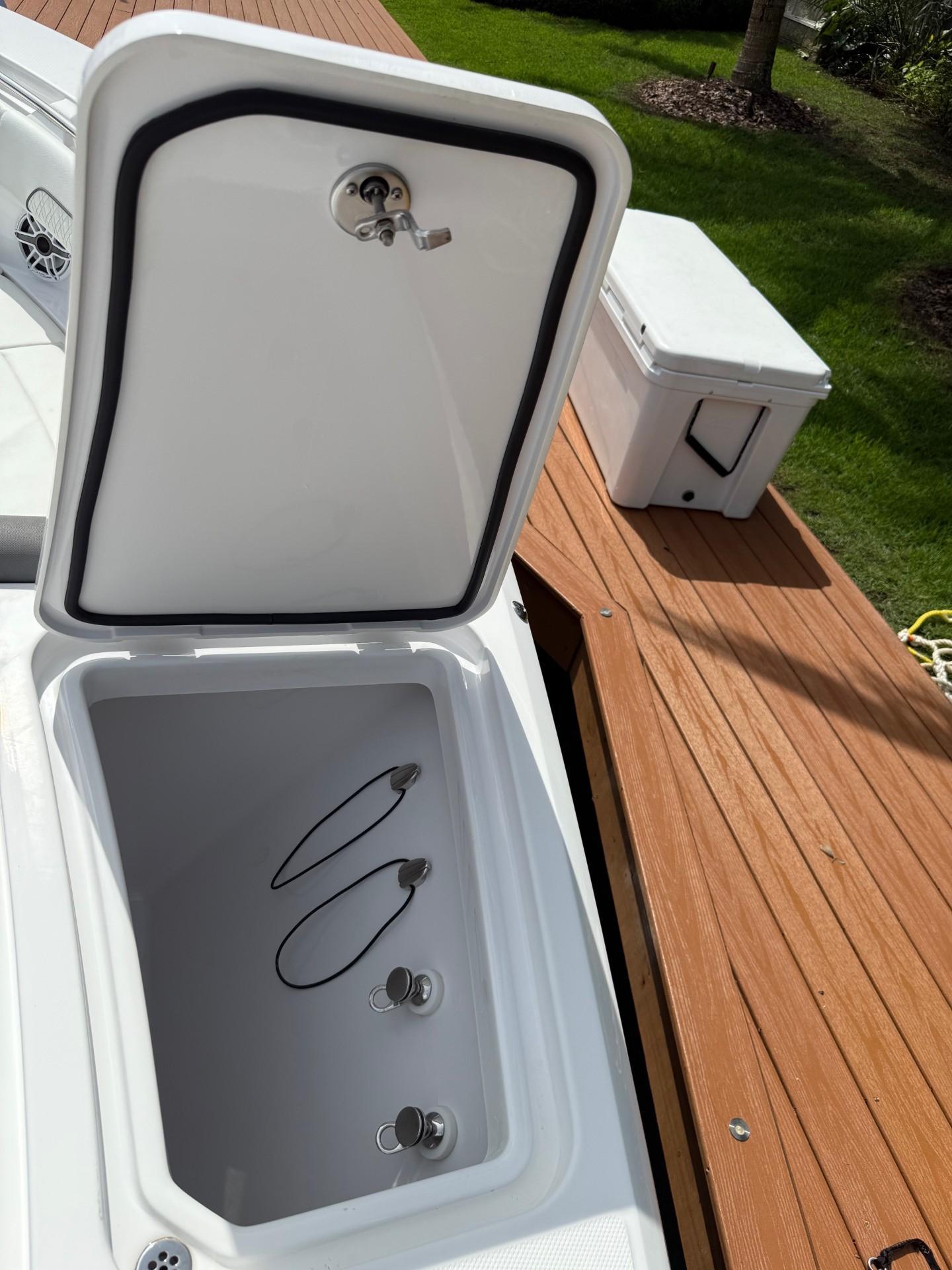 2X 380 qt. insulated in-floor fish box with pump-out, 18X stainless steel flush mount rod holders (6X transom, 4X gunnel, 8X in-floor)