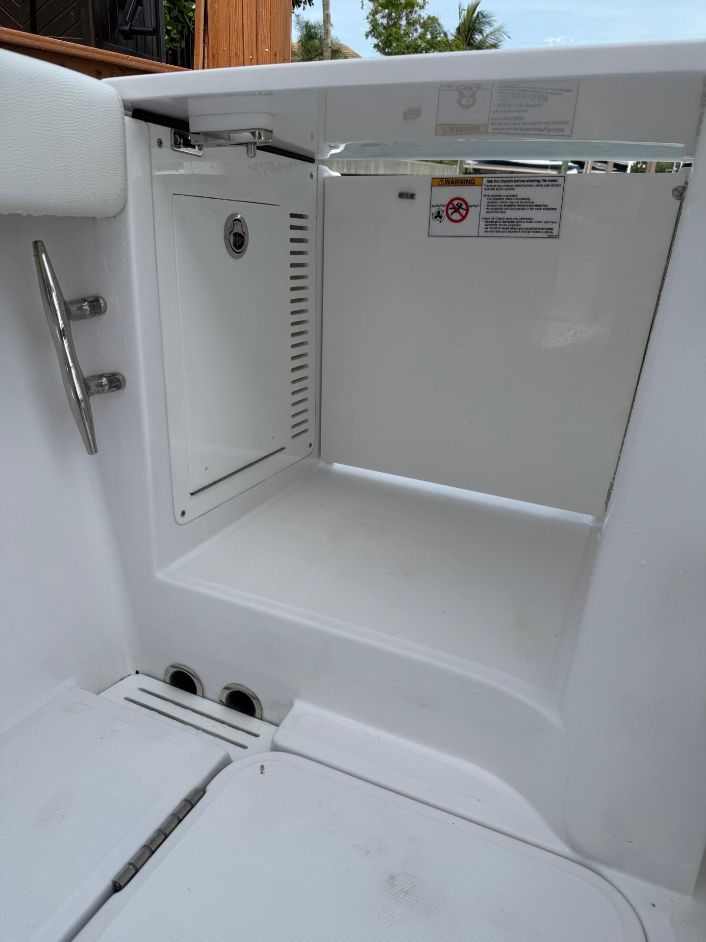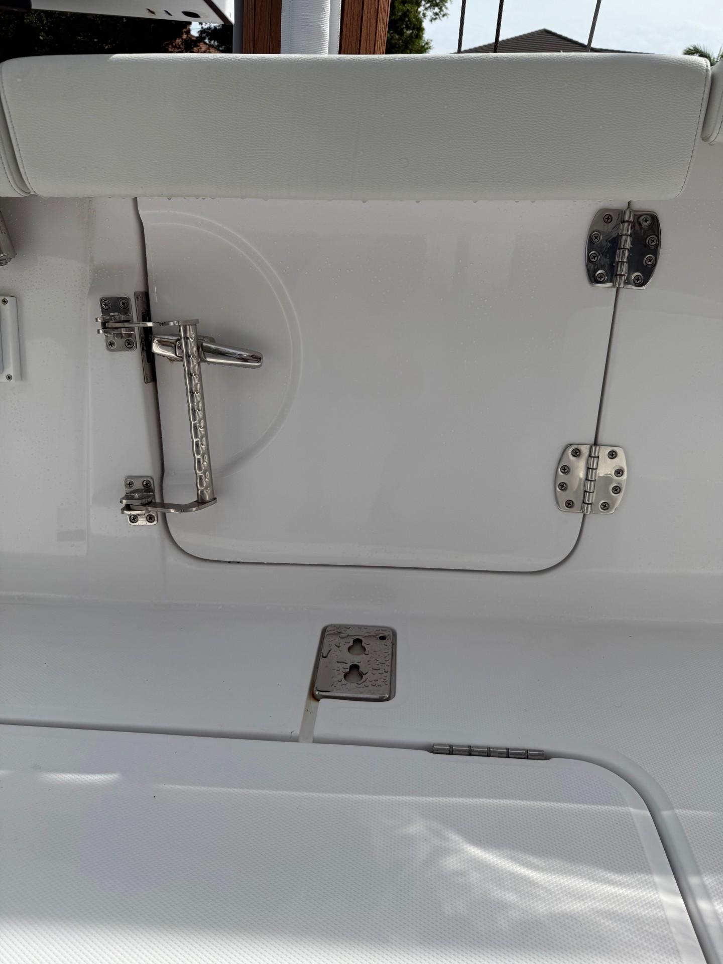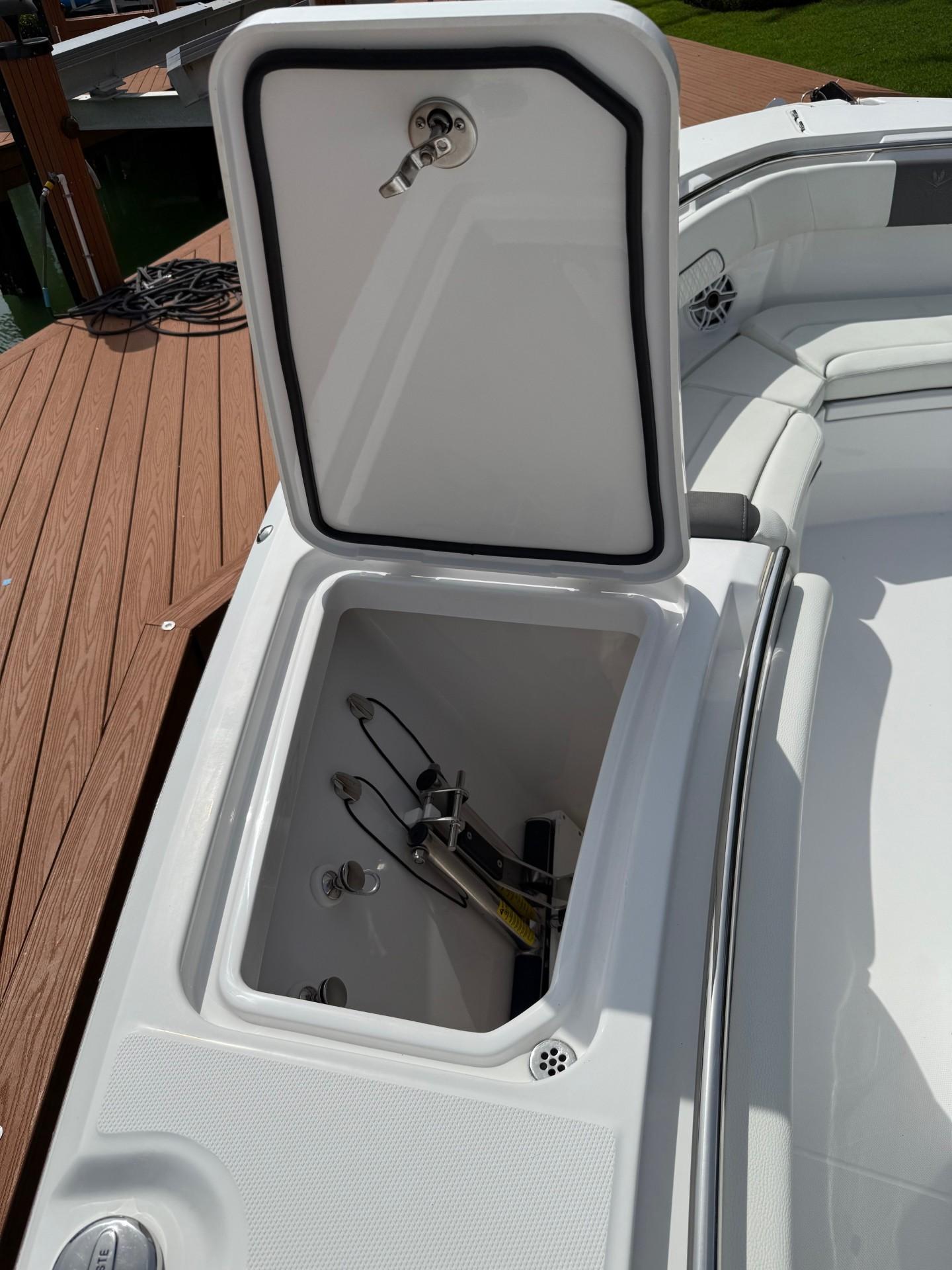 2X 380 qt. insulated in-floor fish box with pump-out, 18X stainless steel flush mount rod holders (6X transom, 4X gunnel, 8X in-floor)