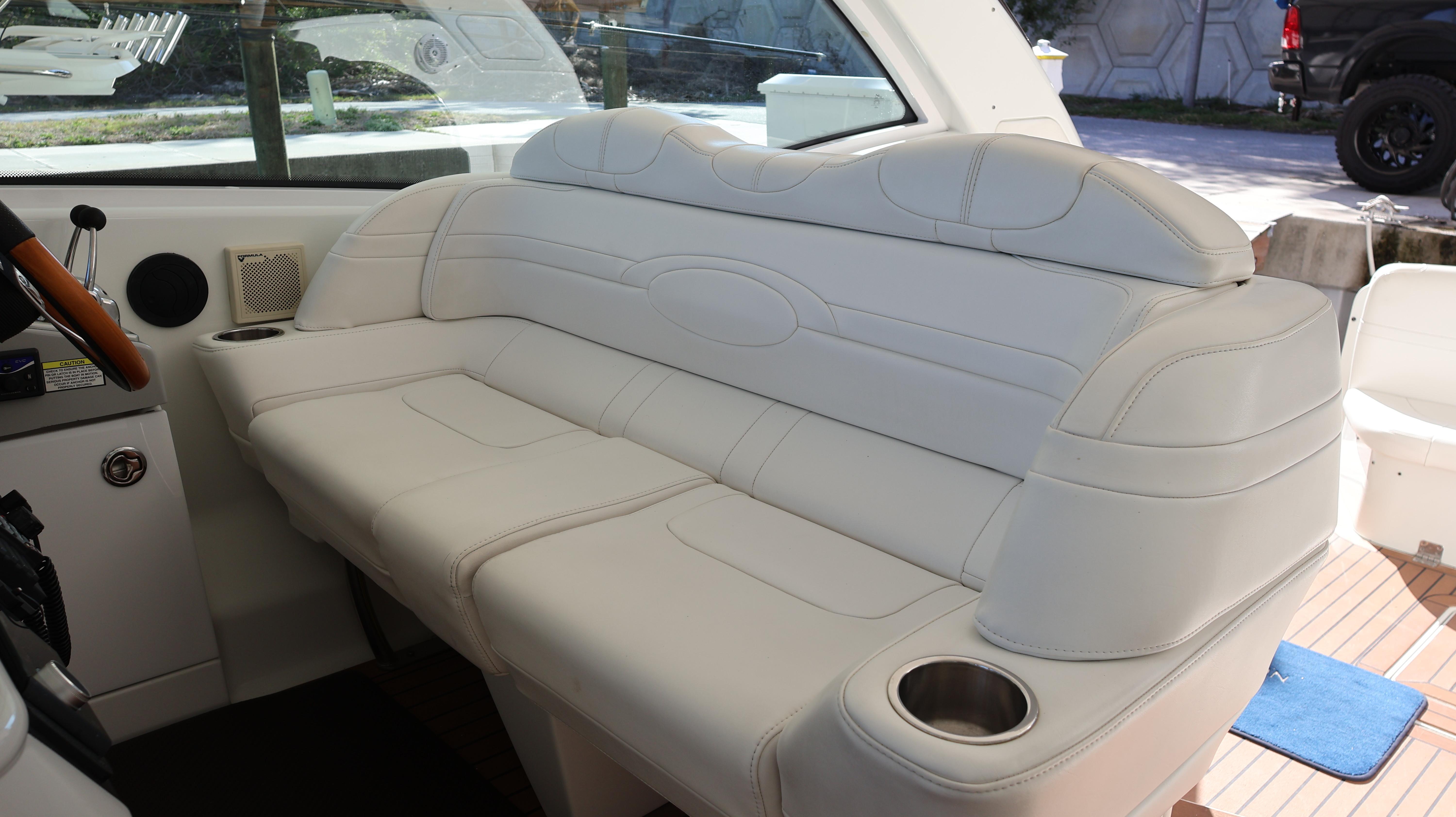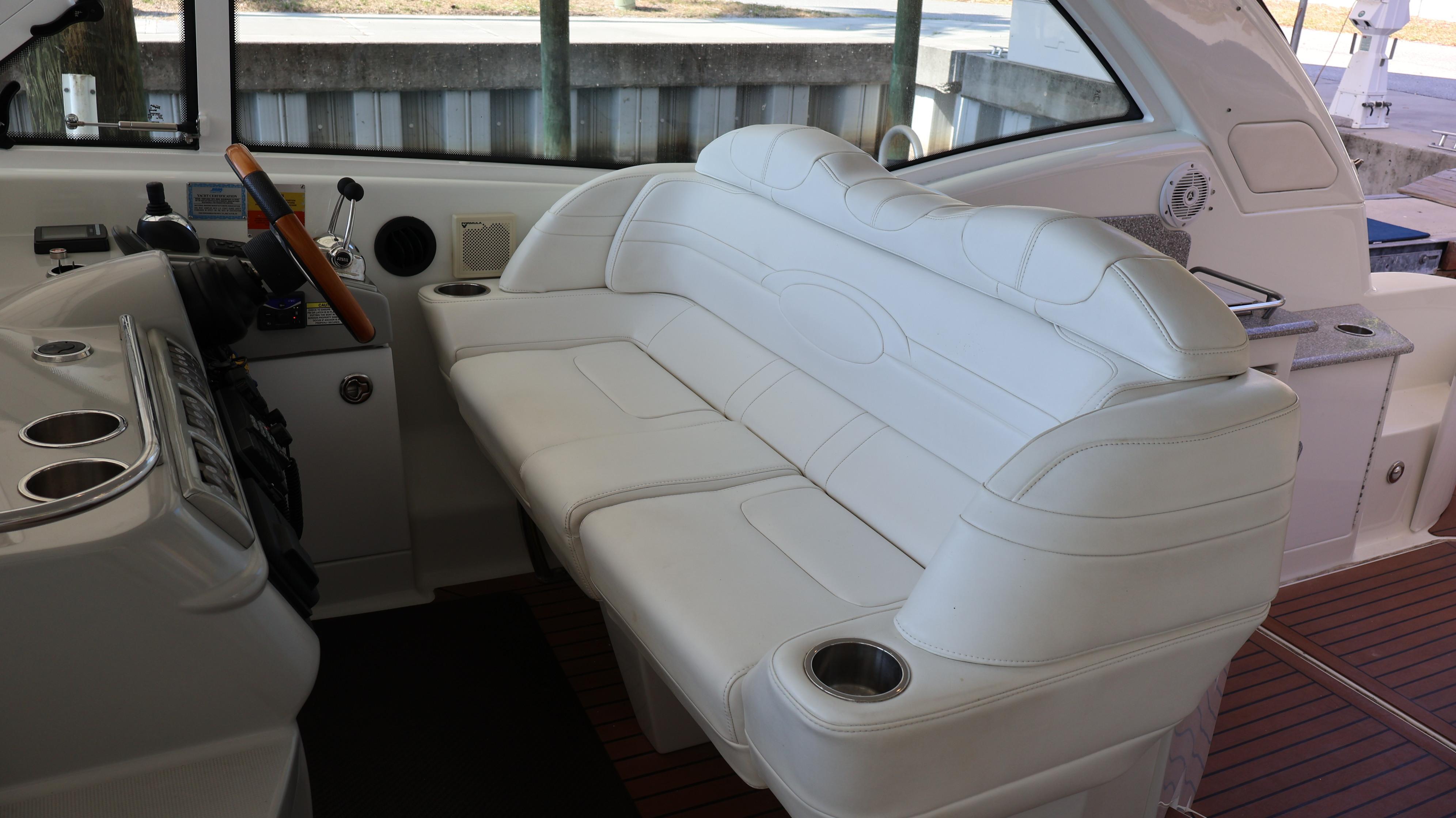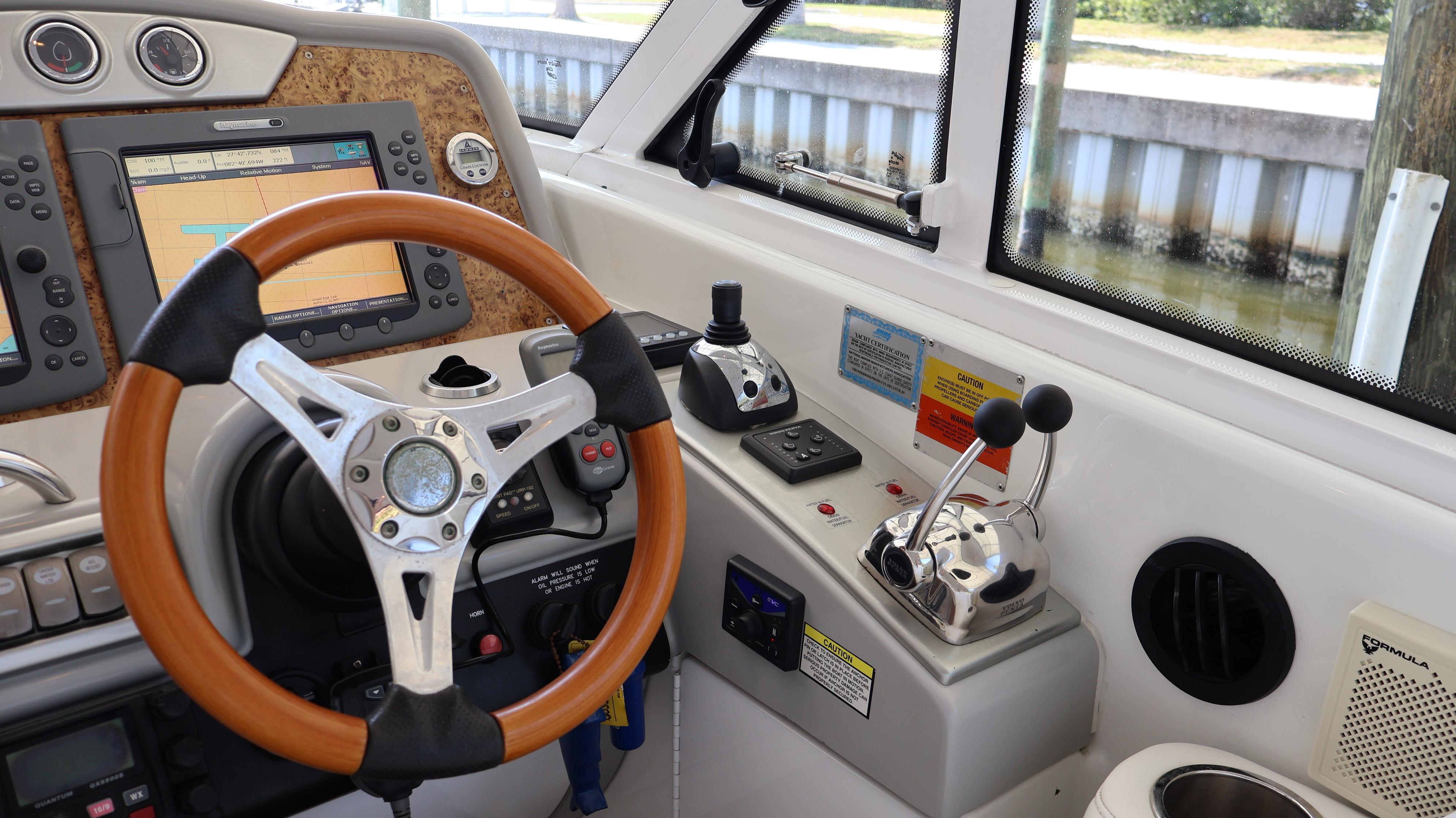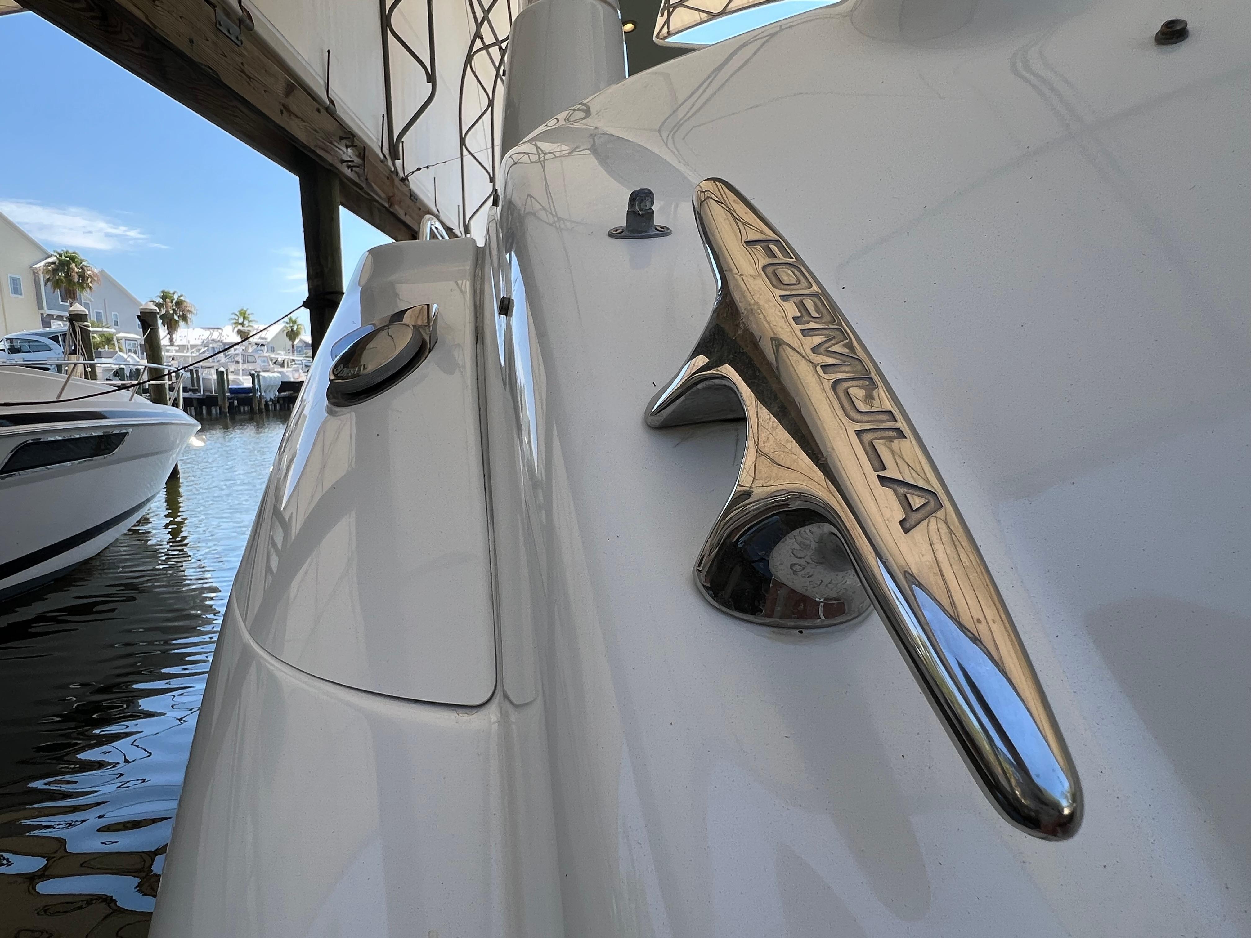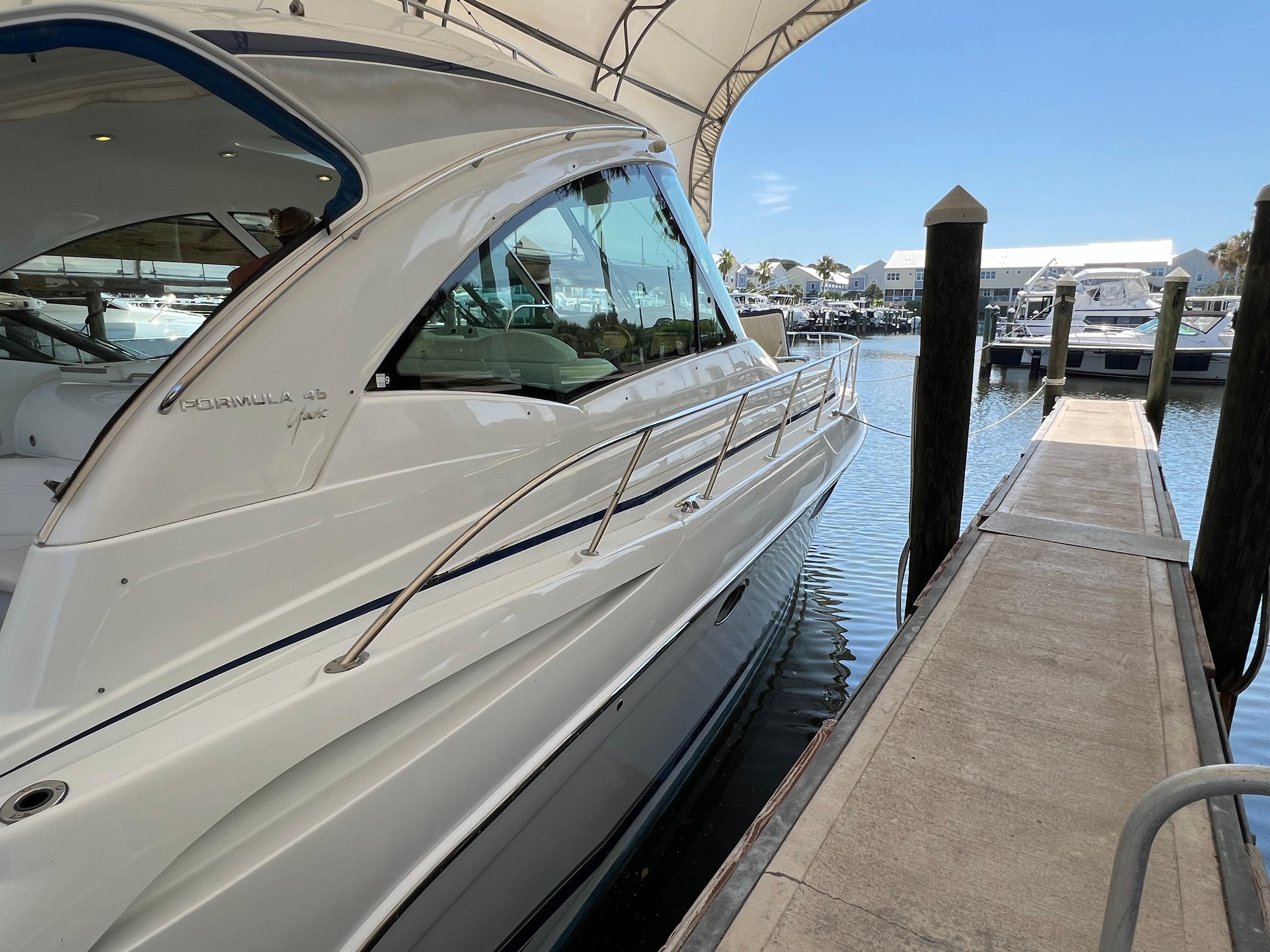 2007 Formula 45 YachtPowered by Twin Volvo IPS 600This boat is priced to sell! Welcome aboard this stunning 2007 Formula 45 Yacht. Currently sheltered in a covered wet slip, she is well-protected from the Florida sun. The exterior has just received a comprehensive wax and polish, enhancing her already impressive appearance. The current owner has invested significantly in her upkeep, including remanufacturing both pods, replacing all air conditioning units, installing new bow sun pads, and much more.Step aboard and you'll immediately appreciate the oversized, hydraulic swim platform, capable of supporting a 1400-pound water toy, making boarding safe and straightforward. The transom speakers elevate your entertainment experience, while the large transom storage is perfect for all your gear. Navigating this 45 Yacht is effortless, thanks to the Volvo controls and joystick docking system.This yacht epitomizes power, performance, functionality, and comfort. Its two-cabin, two-head layout is ideal for both couples and families, offering an exceptional cruising experience. As you descend into the salon, the quality craftsmanship that has made Formula a leader in power boat manufacturing for over 50 years is evident. Every element is thoughtfully designed and easily accessible, ensuring a luxurious and enjoyable journey. Formula's commitment to excellence shines through every detail, providing you with the ultimate yachting experience.AccommodationsU-Shaped sofa seating converts to double berthAdjustable-Height high gloss Deep Cherry inlaid tableTwo Pedestal Dining StoolsLarge LCD with Bose Lifestyle Surround Sound Built-In central vac system American Cherry Woodgrain-Finish Cabin FlooringHigh-Gloss Deep Cherry-Finish Cabinetry ThroughoutOWNERS PRIVATE STATEROOMPocket entry door w/full length mirrorOceanAir Rollour SkyScreen & Privacy ShadeOwners Centerline Berth storage beneath & four dovetailed hardwood drawersTwo cedar-lined hanging lockers w/auto lights19" LCD TV/DVDBose Sound SystemOwners Private Head compartment to PortSeparate Shower compartment to Starboard PRIVATE GUEST CABINPrivate stateroom w/Twin beds that adjust to a queen berthUnder Berth Drawer StorageHanging Locker w/auto light15" LCD TV/DVDPrivate Head w/ShowerVanity w/Corian CountertopGalleyL-Shaped Galley w/High Gloss Deep-Cherry finish CabinetryFull Corian CountertopStainless Steel Sink with Double Basin 2-Burner Electric Stove Brushed Stainless Steel Microwave Oven120V/12V Upright Fridge FreezerLighted Show Case w/Wine Rack 120V water heater w/heat exchangerElectronics & Navigation EquipmentDual Electronic Engine Monitoring DisplaysFuel GaugesRichie CompassTwin Raymarine GPS/Chart Plotters VHF radio50amp cord with Glendinning motorized extent/retract and storage systemRemote Control SearchlightElectrical SystemWesterbeke Generator Two Automatic Bilge PumpsAutomatic fire extinguishing systemEngine Room LightingMotorized Engine Room hatchDeckElectric Windlass w/chain counter, concealed anchor davit w/molded chain lockerConcealed quick-disconnect coiled-hose transom wash-down systemSix venting stainless steel portlights w/screens2X oversized stainless steel HarbourView portlights w/screensNonskid deck & walk-around coverboards2X vinyl foam deck sun pads w/adjustable Sunbrella chaise backrest & 316L stainless steel railsCoupe Top w/tinted, tempered curved-glass windshield w/vented Center WALK-THRU DOOR & side ventsLARGE, MOTORIZED COUPE-TOP SUNROOFWindshield wipersPolished dual air hornFull-Width Swim Platform, concealed 316L stainless steel swim ladder, swim rails & pull-up cleatsTransom shower w/single-lever temp controlMolded transom trunk w/pneumatic-assist hatch, line storage and fender rackTwin command seating w/dual position helm & companion seats w/center storage compartmentsCurved extended port loungeMid Cockpit storage locker for cockpit tables and canvas enclosuresU-shaped lounge seating aft w/fiberglass lined storageAft sun lounge package w/two dual height Corian tables & filler cushionsMolded wetbar/beverage center w/integrated sink, flush corian countertop, ice maker, in-counter trash container,PFD storage locker w/corian countertopAft curtain enclosure w/easy mount zipper connections Mechanical Equipment & Engine DetailsTwin Volvo IPS 600 Diesel EnginesMotorized engine room hatchIntegrated quick-access (day hatch) engine room hatch with stainless steel ladderEngine Room lightingAuto fire extinguishing system2X auto bilge pumpsBilge high water alarm