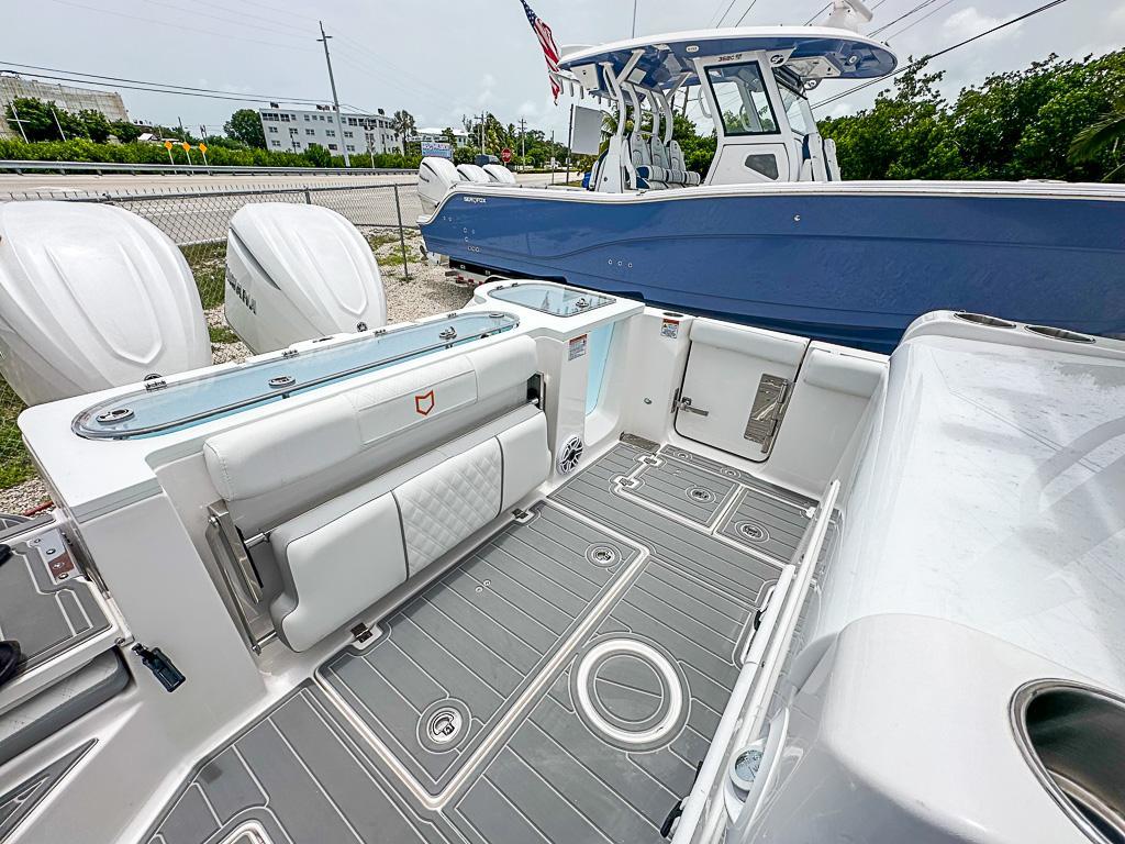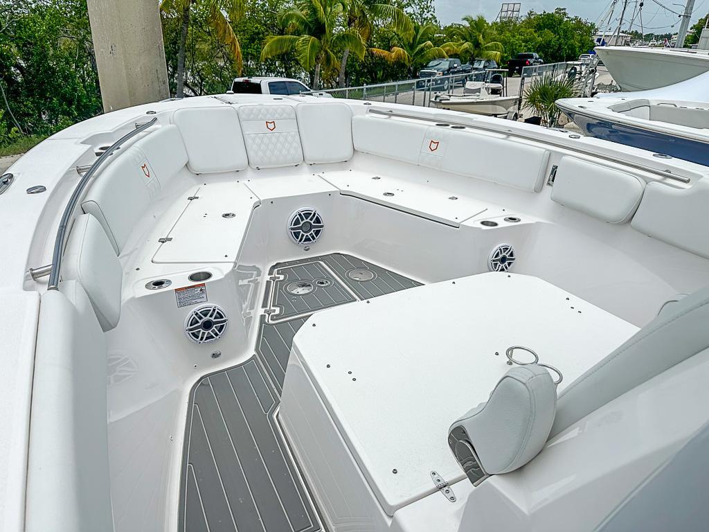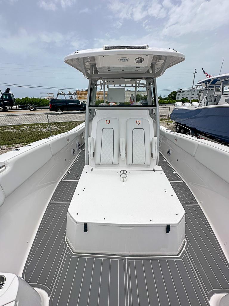 - Fiberglass helm seating pod with three deluxe bucket chairs, adjustable armrests, adjustable footrests, rigging station and cooler storage