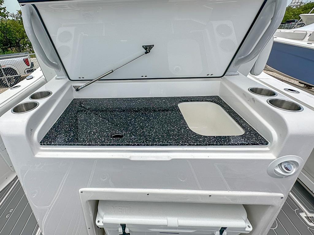 - Pod double sink with freshwater shower faucet/wand, cutting board, bait storage tray, and hard surface accents