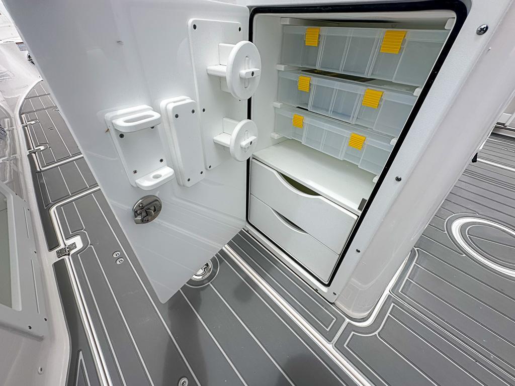 - Pod Storage: Tackle tray storage center, forward drawer, chart tubes, water hose coil fiddles