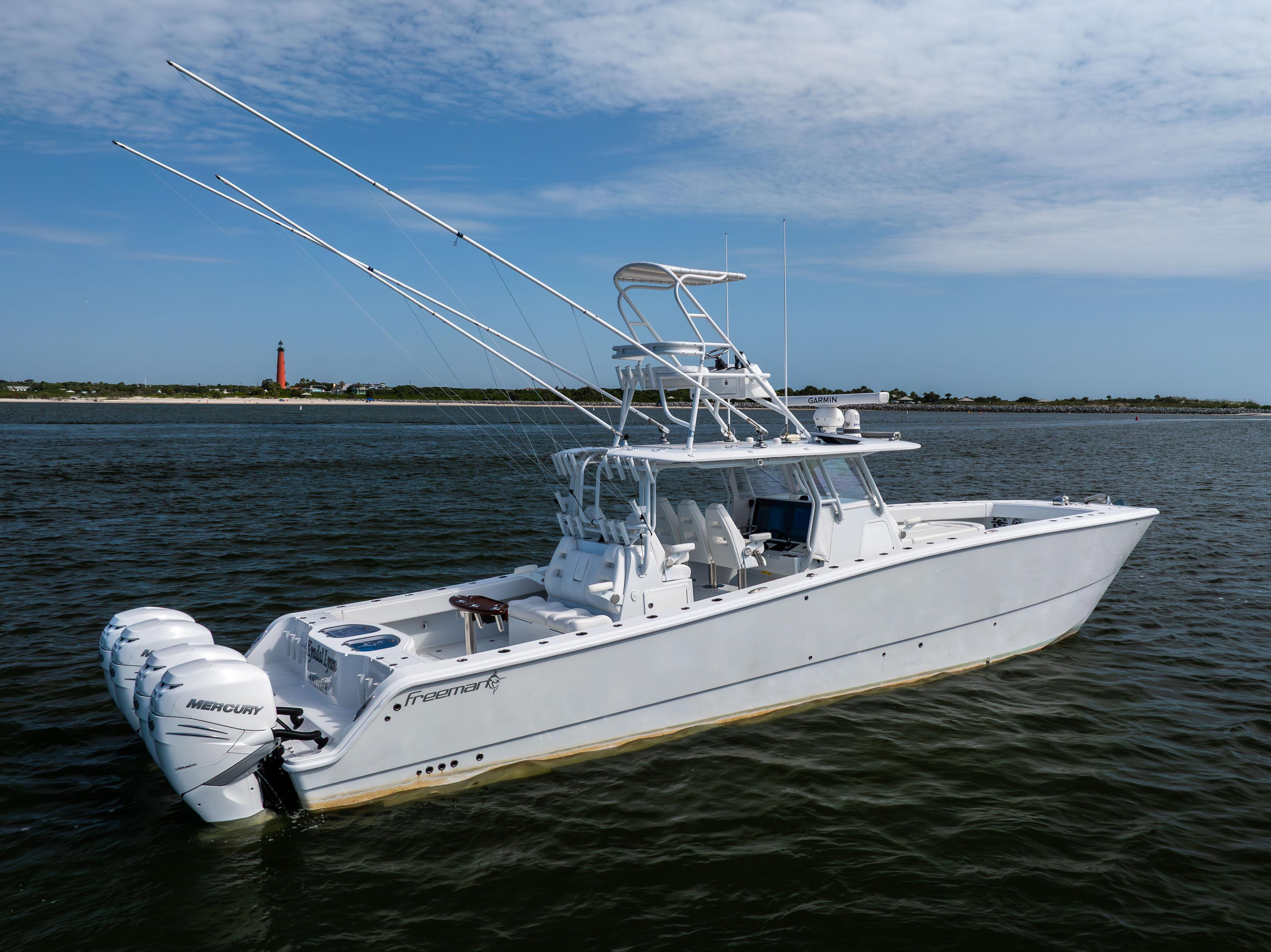 2023 Freeman 42 LR “KYNDAL LYNN” Quad Mercury 400HP w/ 250hrs Optimus 360 Joystick w/ SeaStation Electronics: (2) Garmin 8624 GPS 24” Displays Garmin Phantom 6’ Open Array Radar Garmin GSD 26 Airmar B175HW & Airmar R599(2) iCom VHF Radios FLIR Nightvision Camera Starlink Internet (Subscription Required) SiriusXM Antenna (Subscription Required)LED Light Bar 50”Under Gunnel LED Lights Multicolor Underwater LED Lights Multicolor (4) Electric Reel Plugs Over The Top JL Audio Stereo System Other Options: Matterhorn White White Powder Coat XL Hardtop Dual Row Seating Package Rear Facing Mezzanine Seating Chiller Plates In Drink Boxes & Starboard Coffin Reverso Engine Flush System Console Covers 4 Rod Teak Rocket Launcher Windlass Anchor In Floor Livewells Gemlux Outrigger Bases w/ Carbon 21’ RiggersCenter Rigger Marine Head 7-10 year 3x layer Ceramic Coated EverythingFolding/ Removable Factory Tower w/ Full ElectronicsMiddle & Upper Row Rod RacksBottom Paint& More!Factory Build Sheet Available Upon RequestThis Vessel Shows In Exceptional Condition & Is Professionally Serviced & MaintainedNew Smyrna Beach, FLShown By Appointment Only