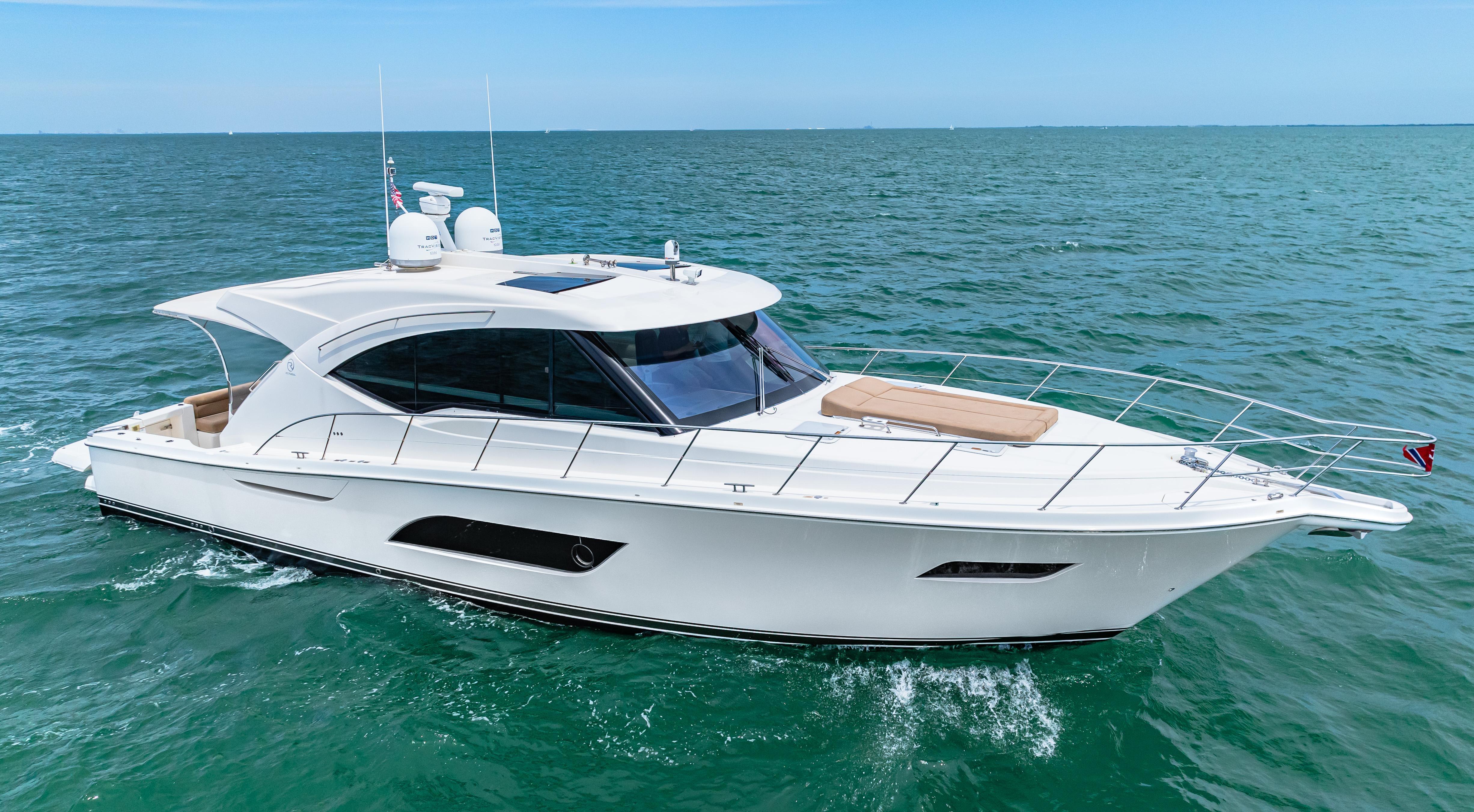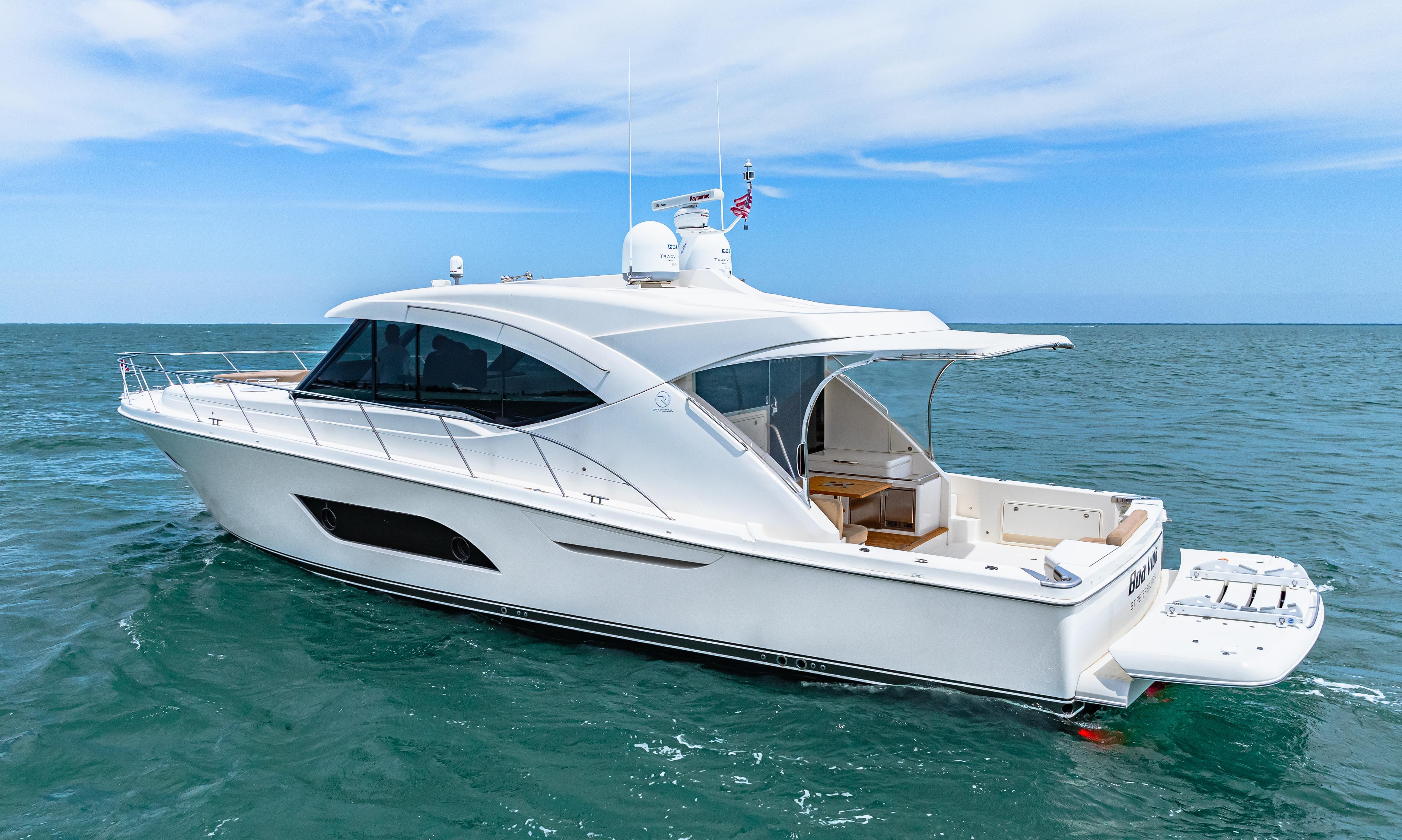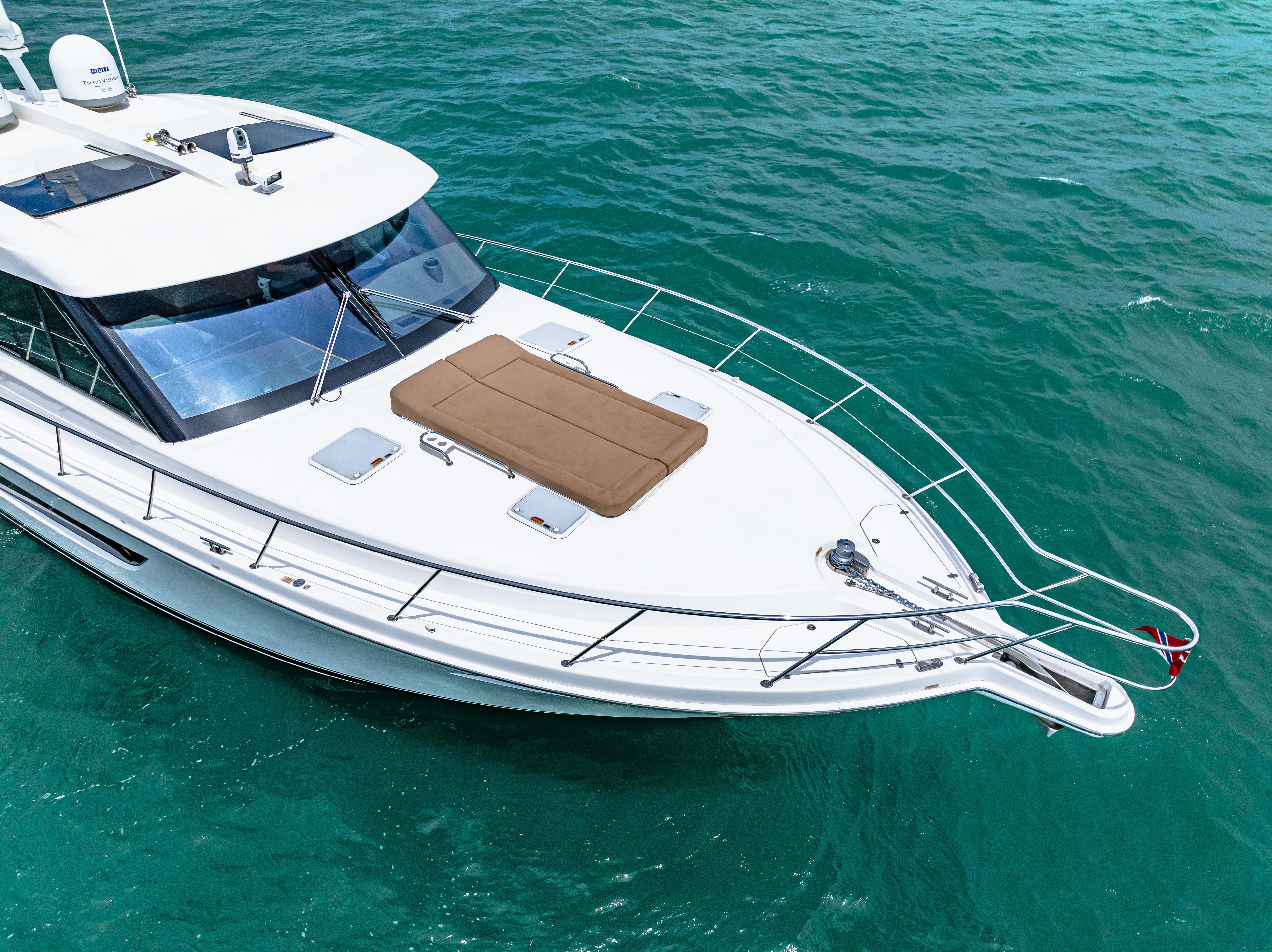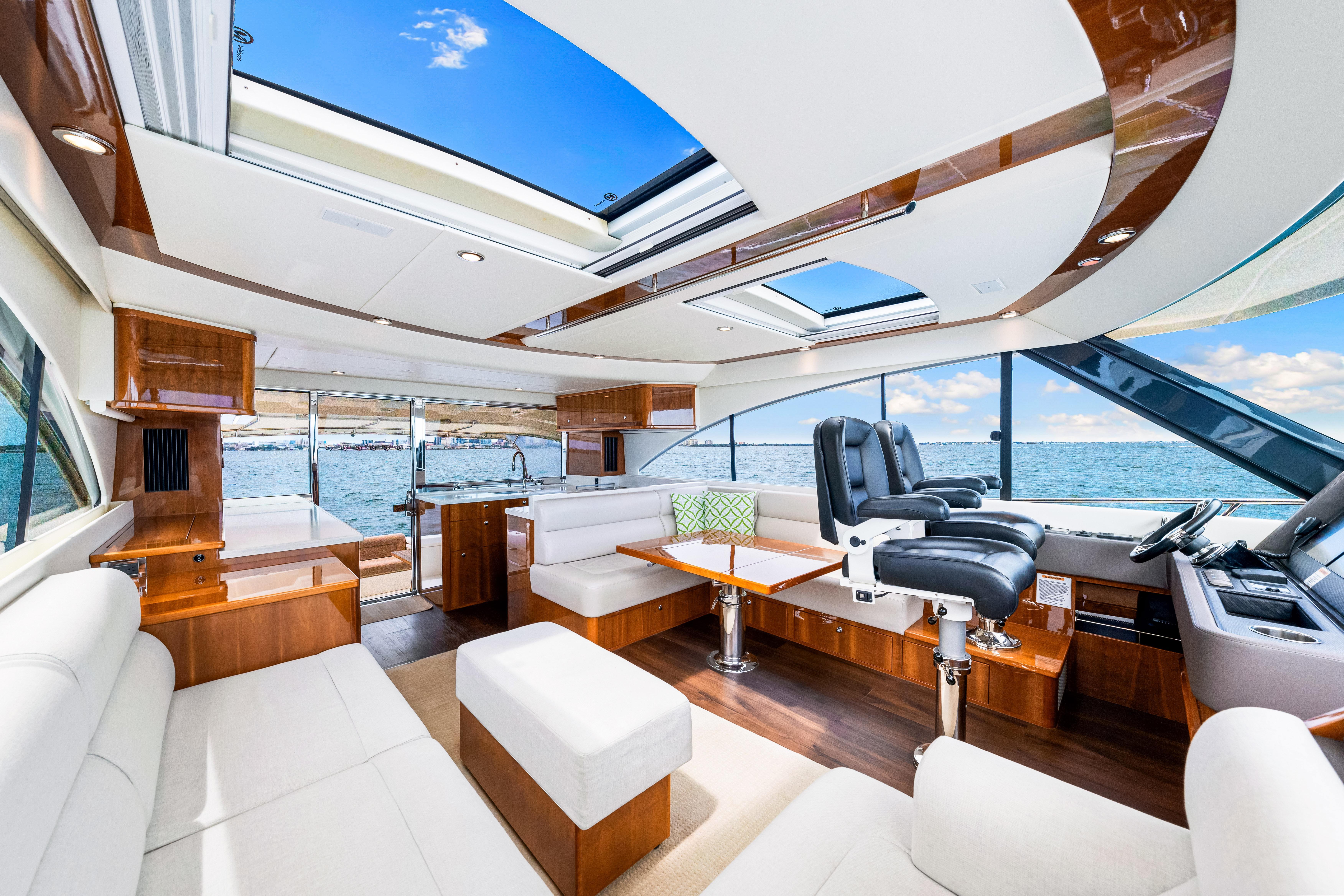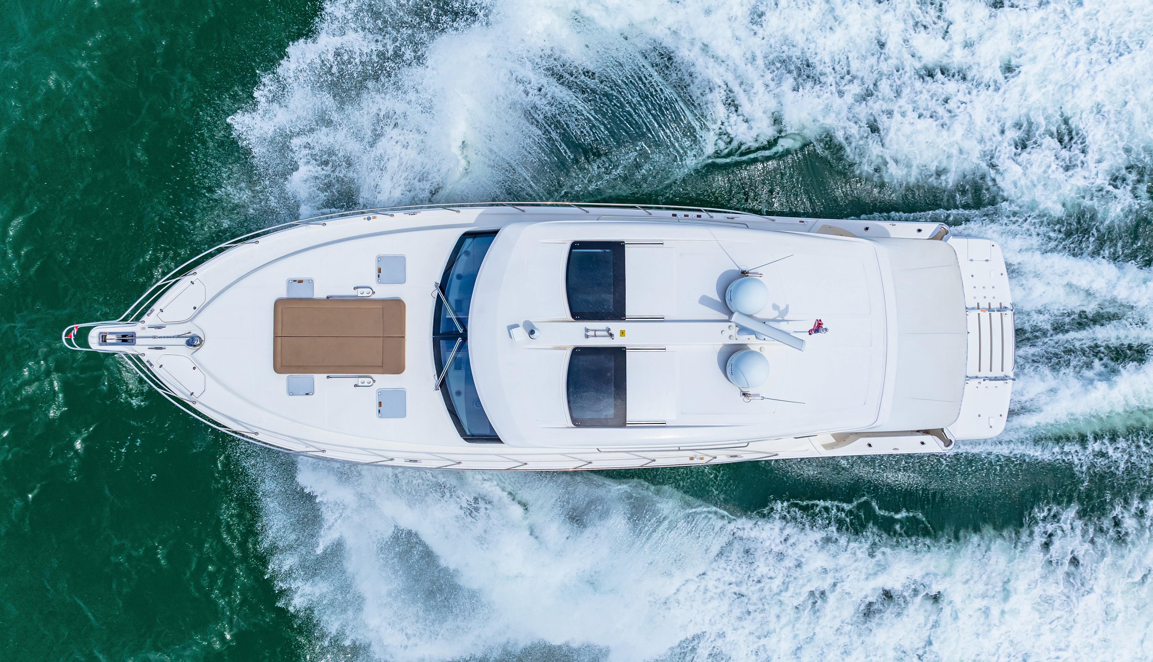 With her contemporary styling and impeccable blue-water pedigree, the robust Riviera 575 SUV exhibits powerful and noble lines with a muscular sheer forward and deep topside dimensions, giving her a freeboard akin to a much larger yacht altogether.