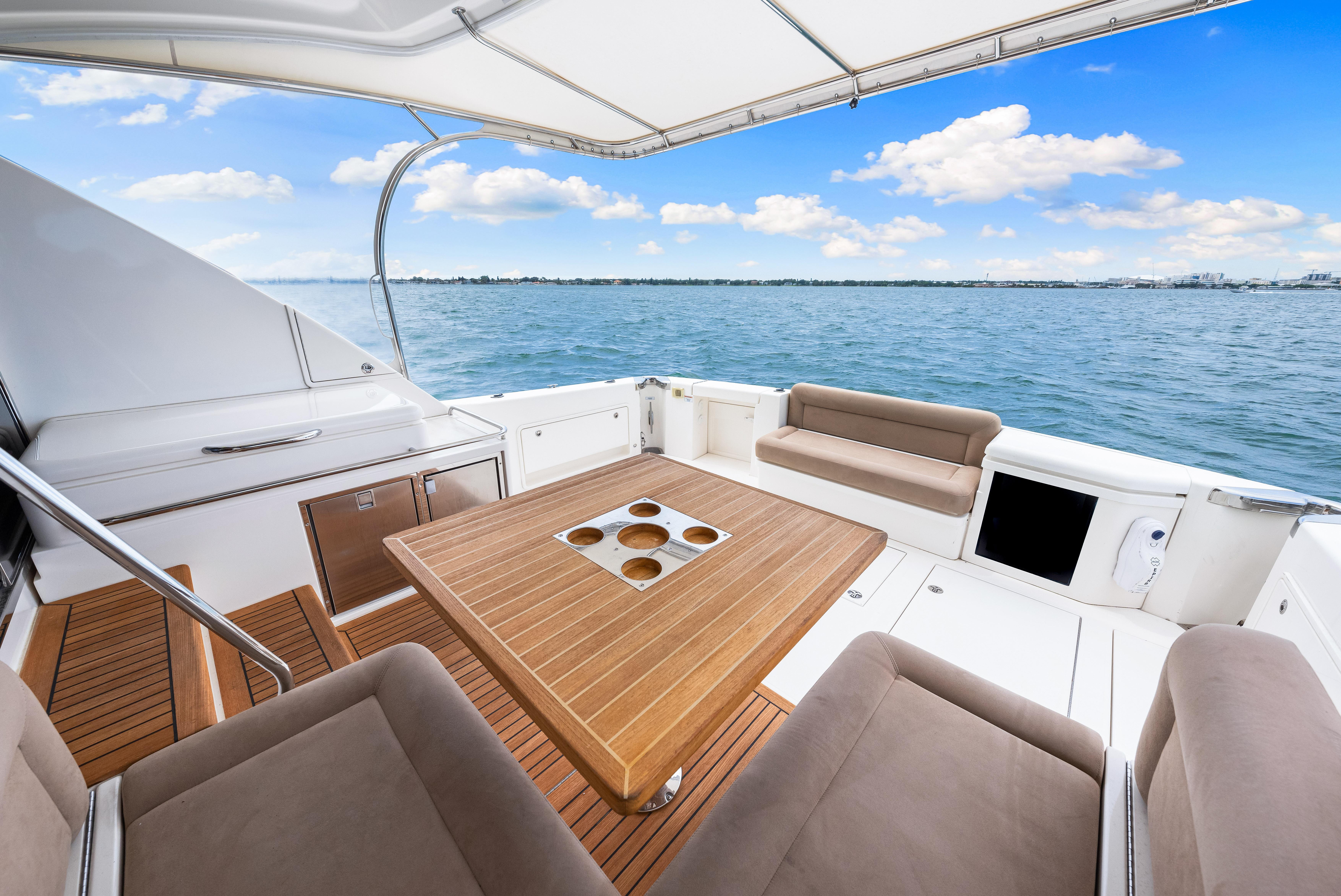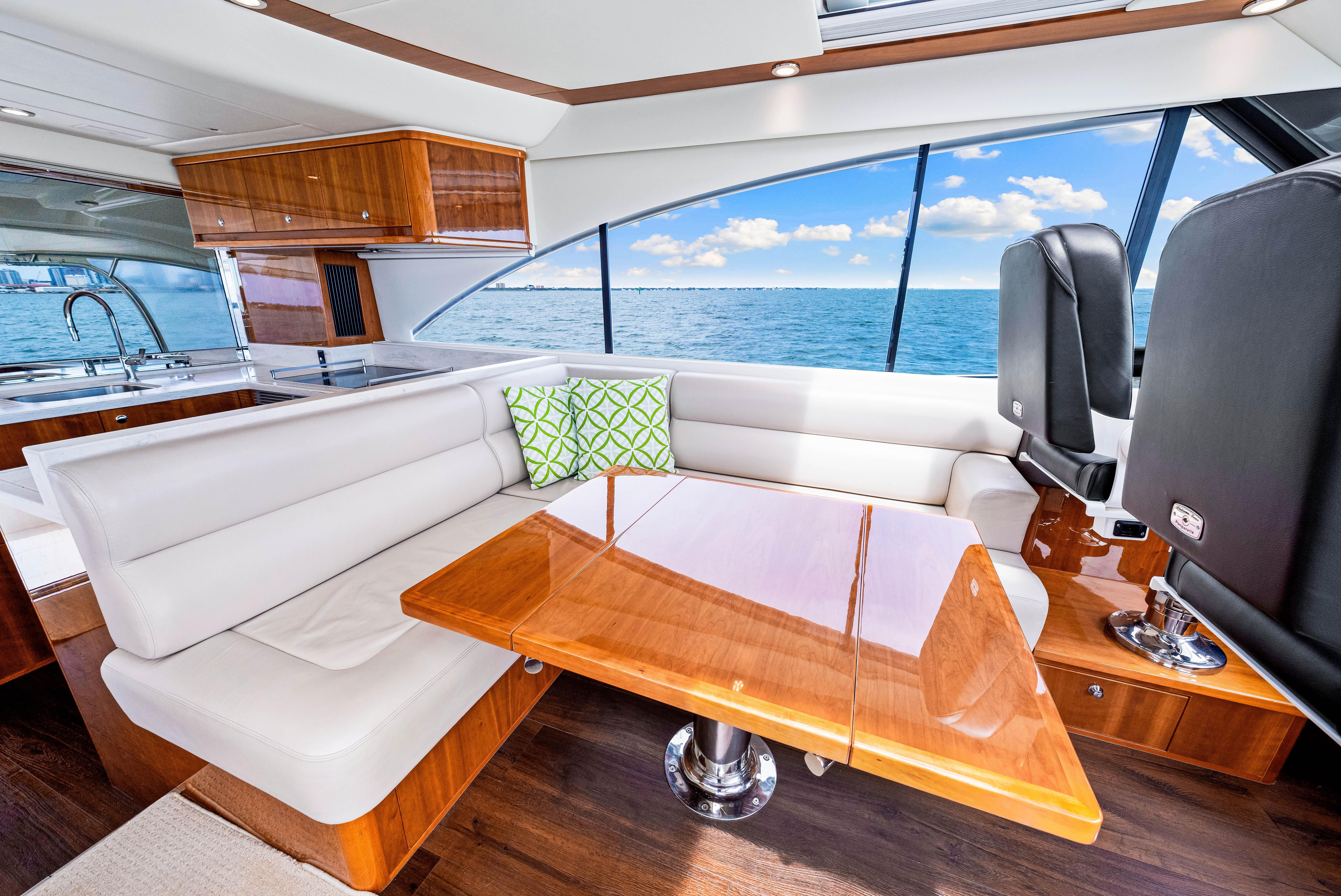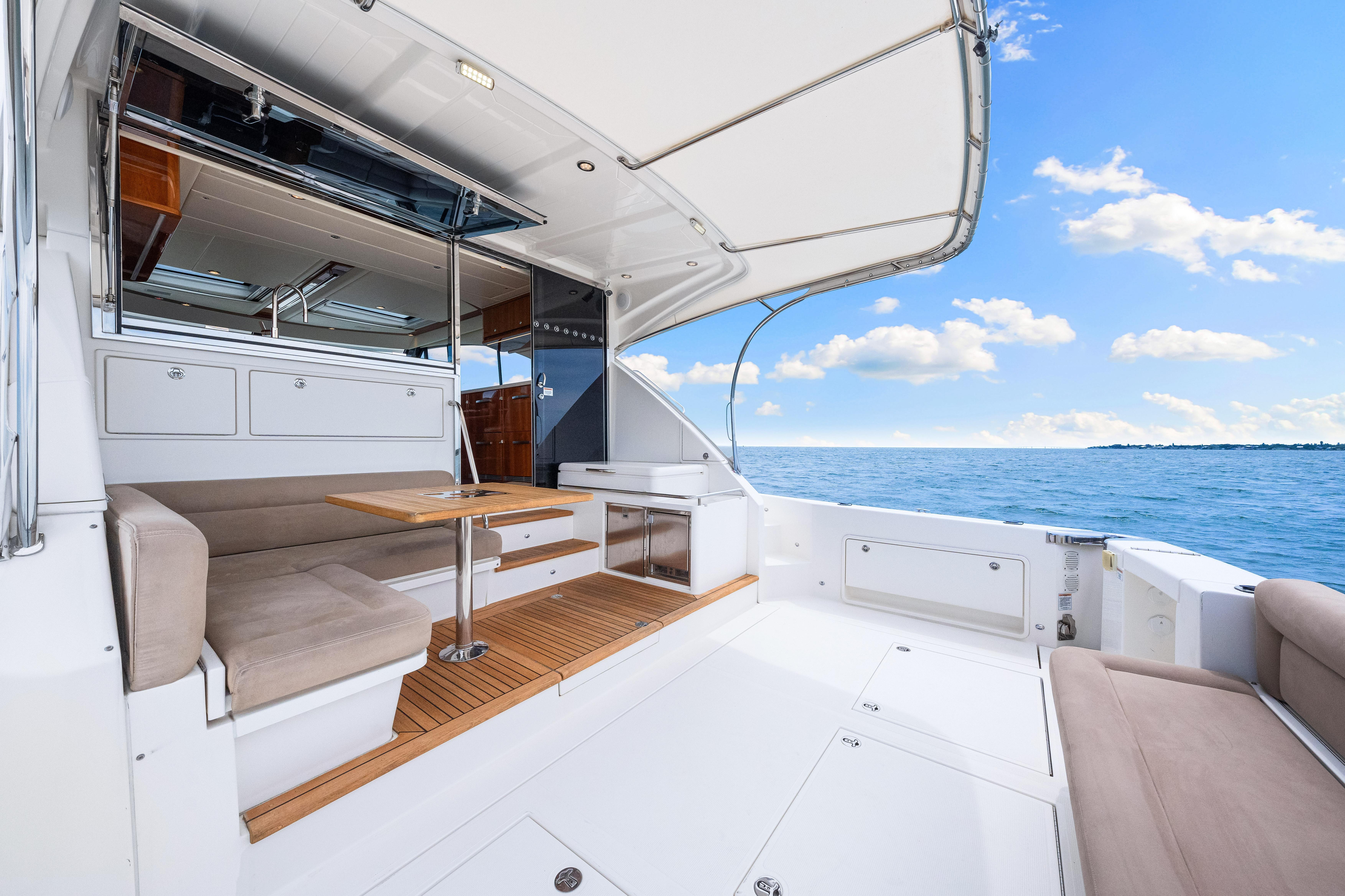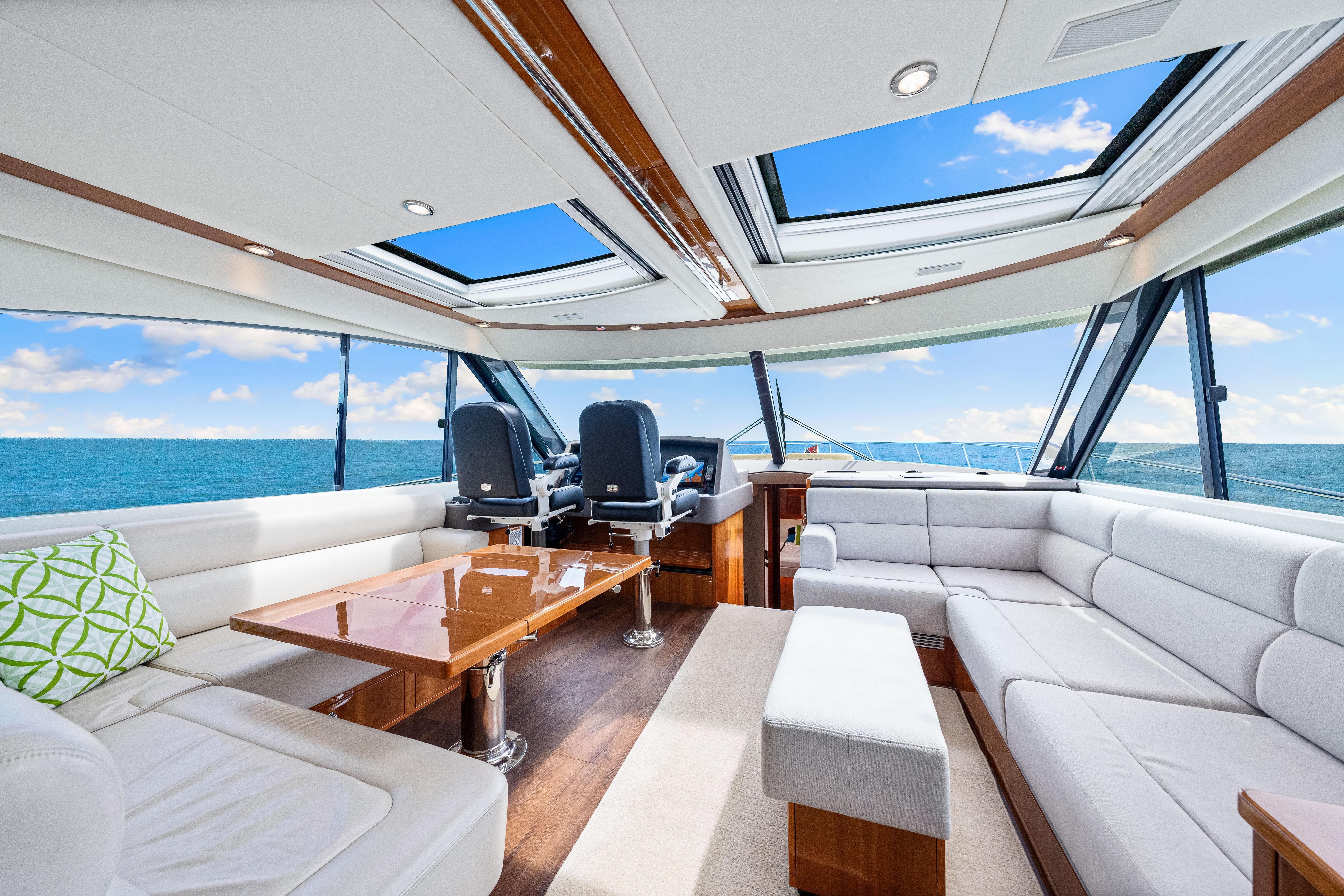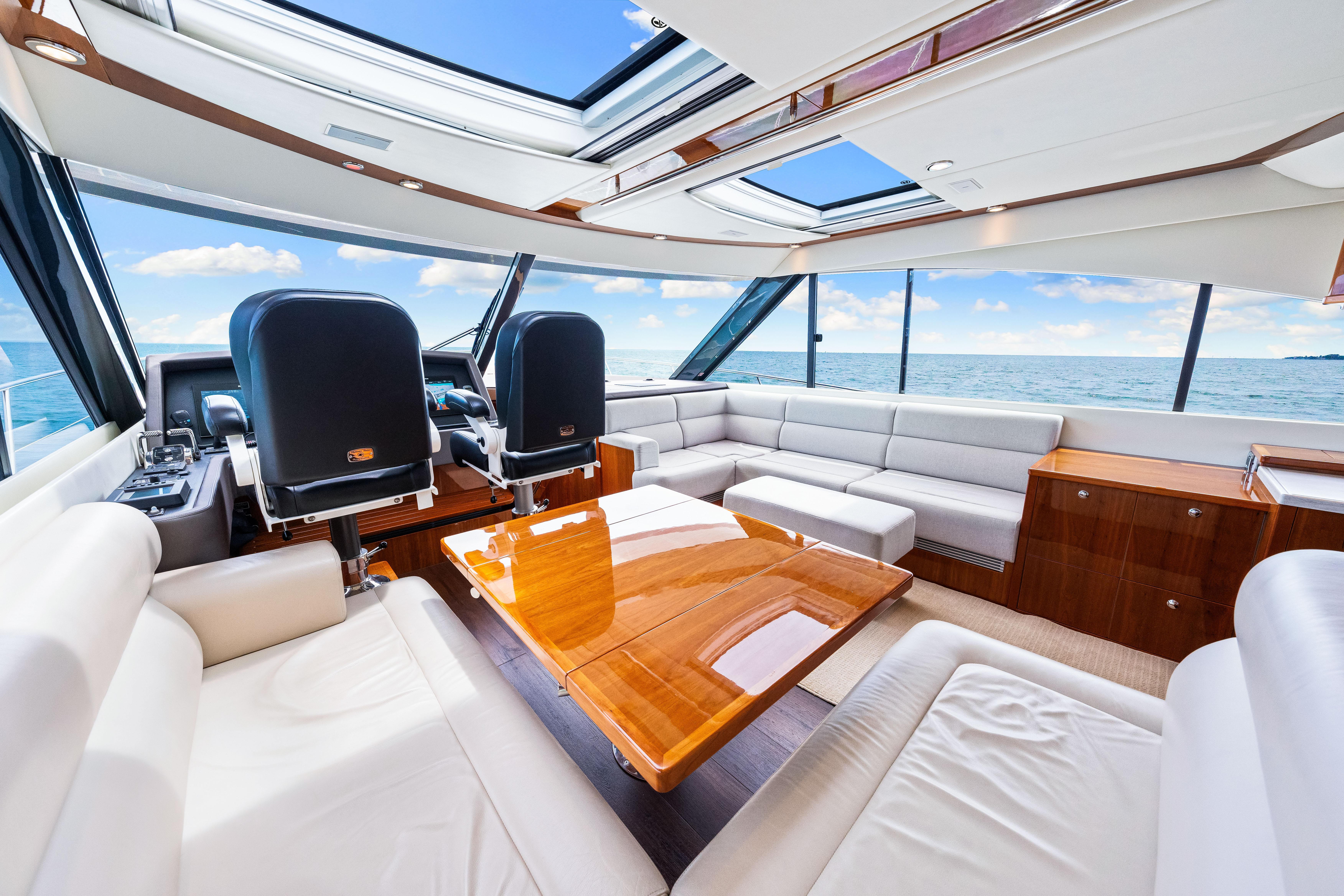 So there’s plenty of space for a table and numerous chairs. But it’s also large enough to allow a mezzanine level with L-shaped lounge, the ideal platform to take in the fishing action ... or the sunset. Or, when underway, just an eye-widening view of the awesome, rapidly vanishing contrail of a 57-foot Riviera, on song, at wide-open throttle.