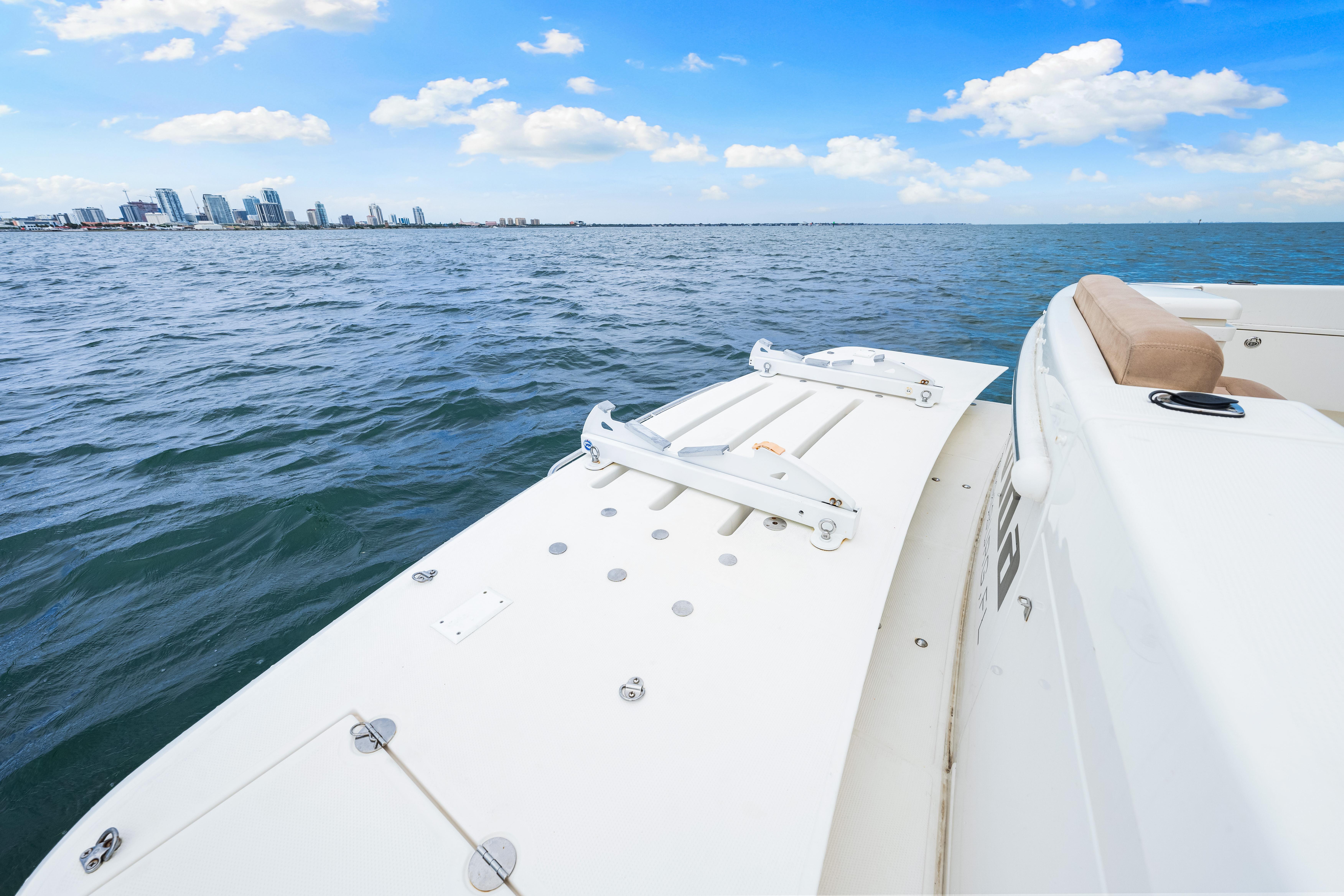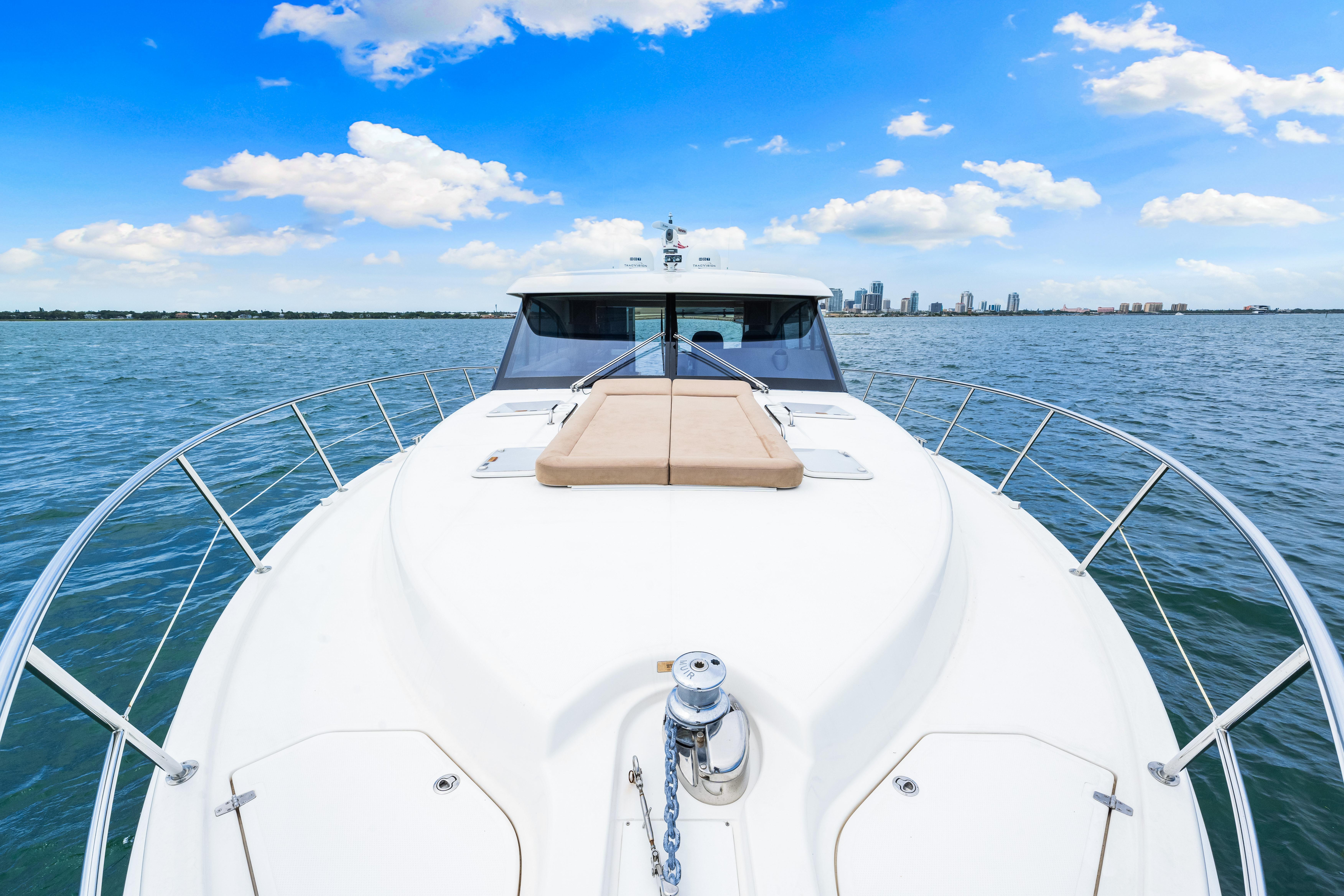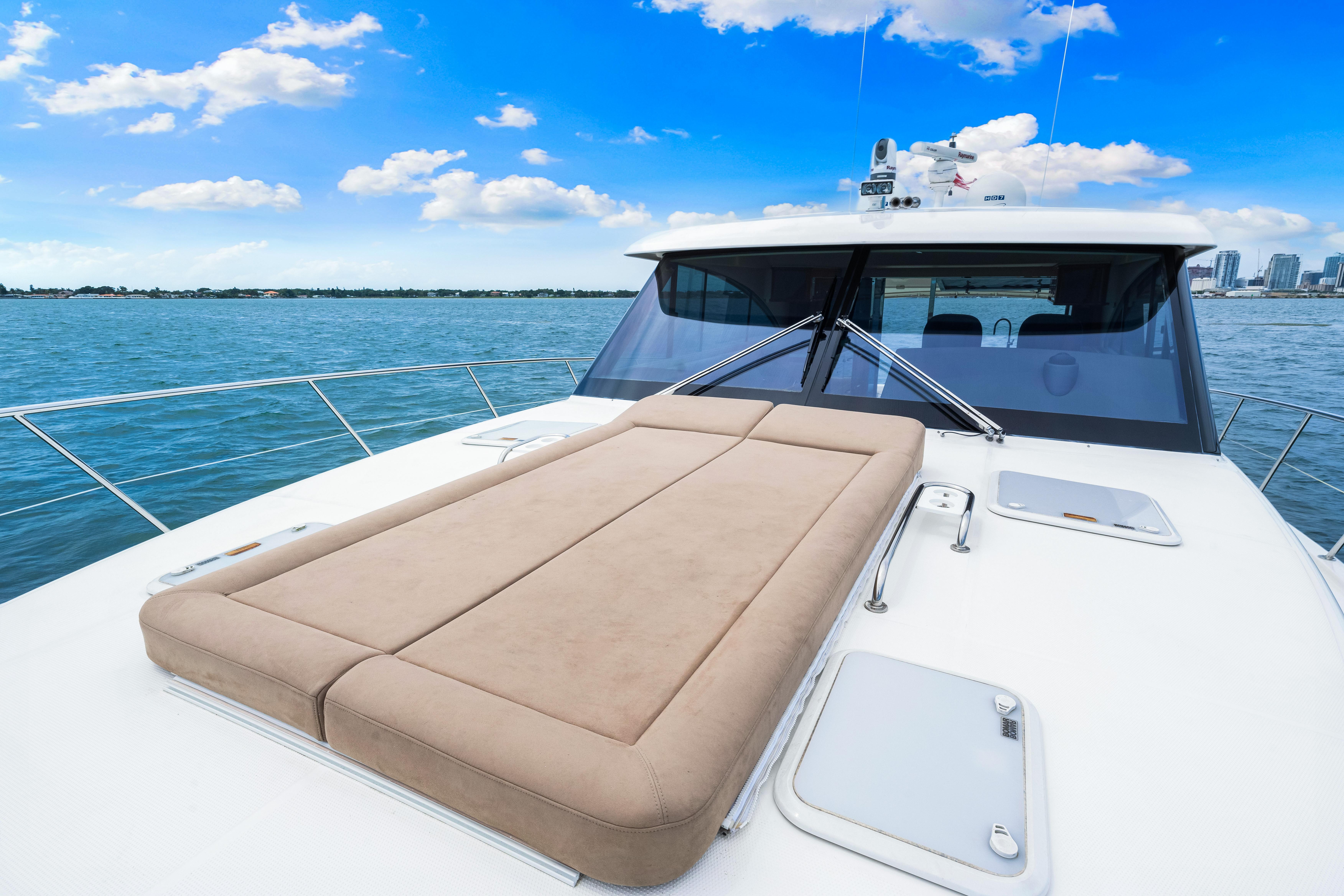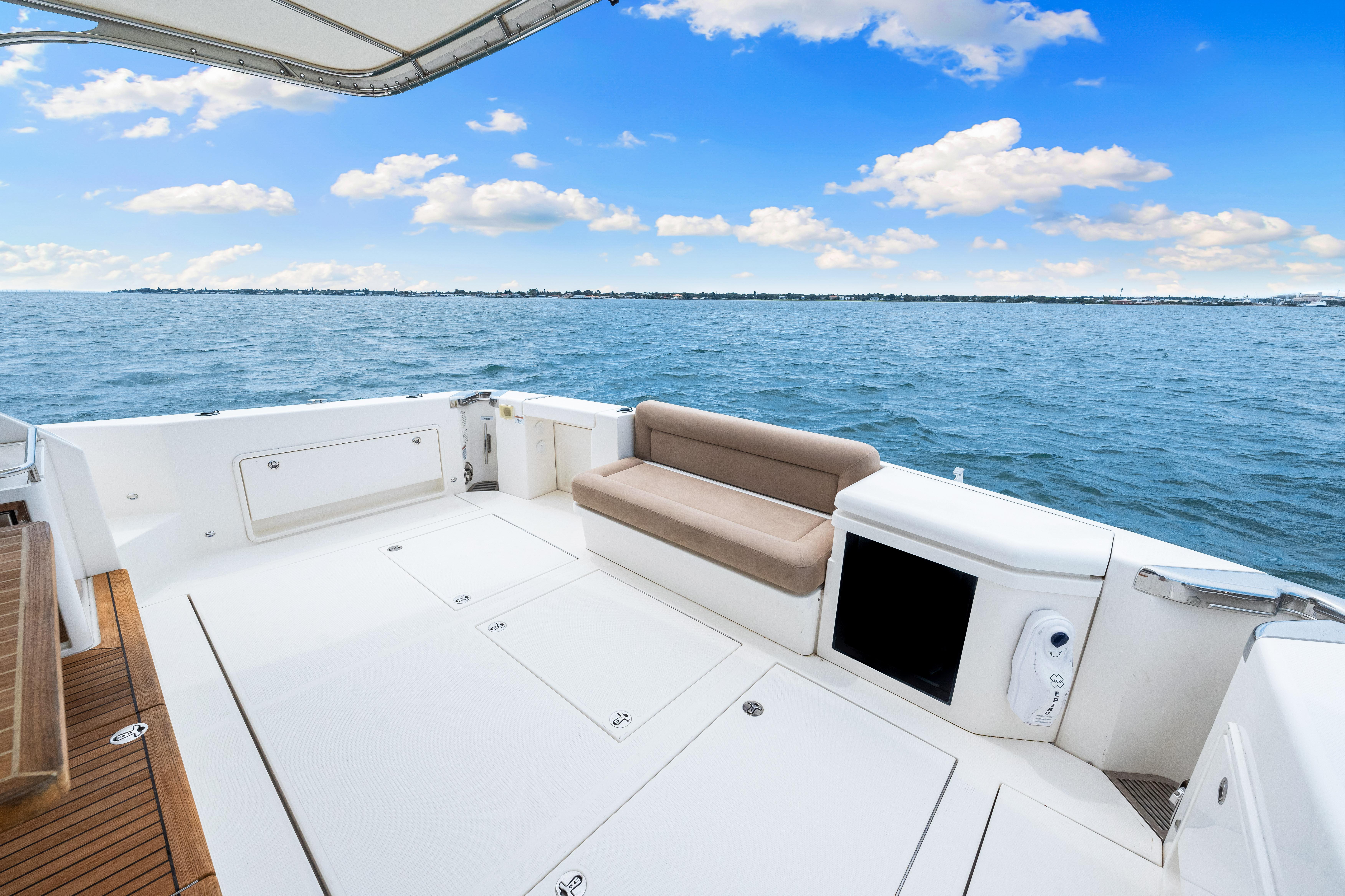 Wide walk-around side decks on the 575 SUV provide easy access to the foredeck, which has the option for a moisture-resistant closed-cell foam sun pad with stainless steel rails.