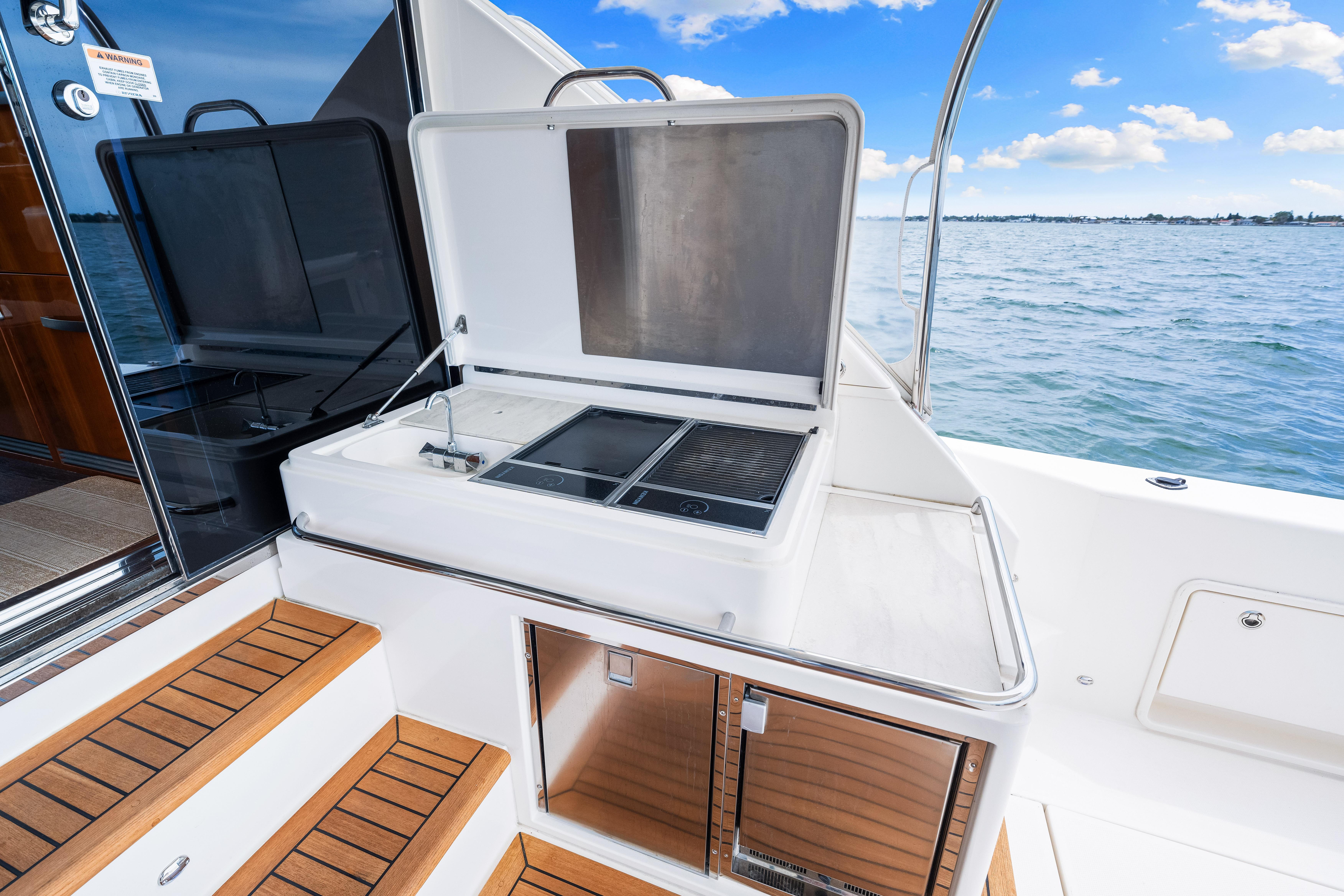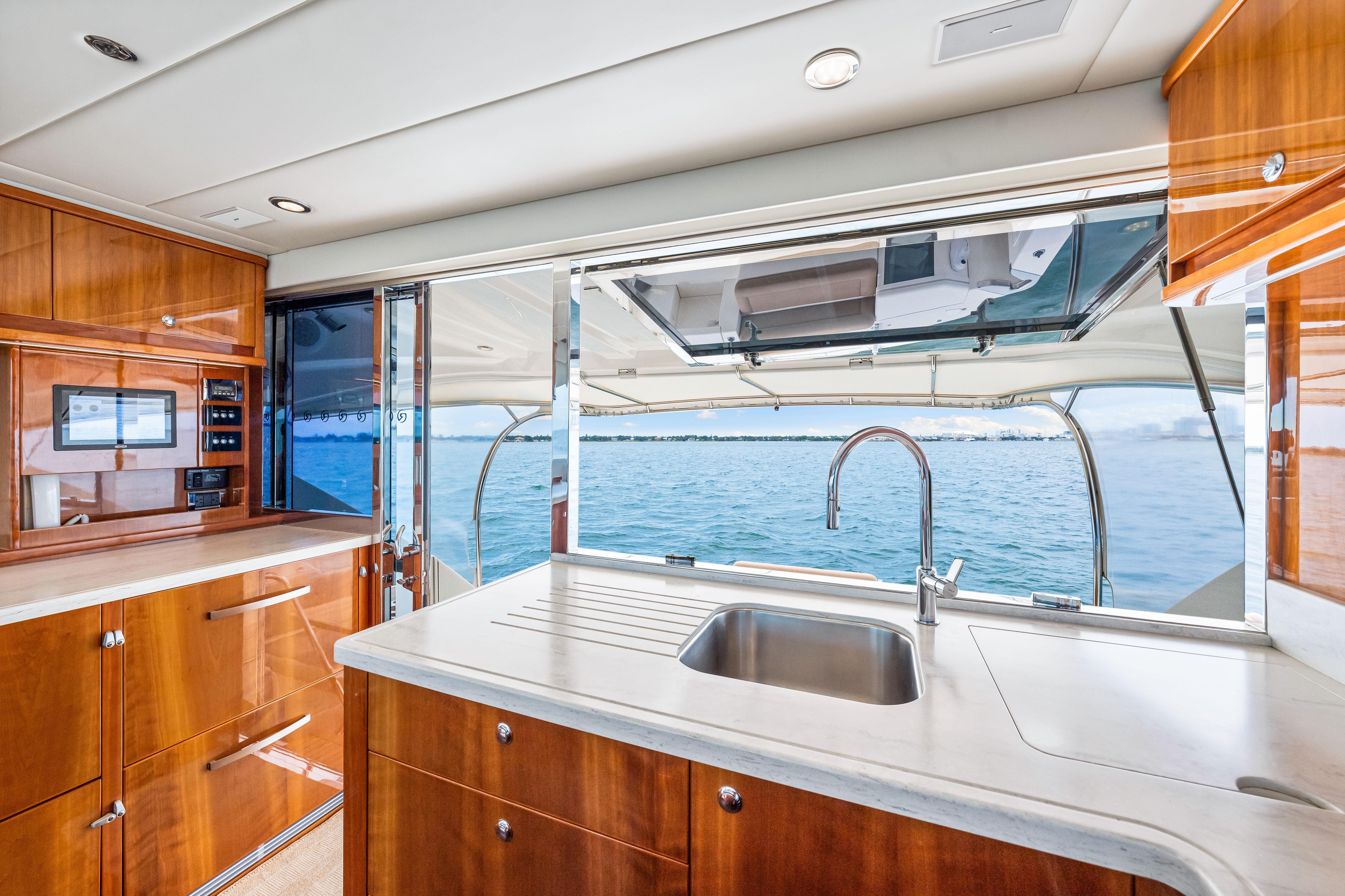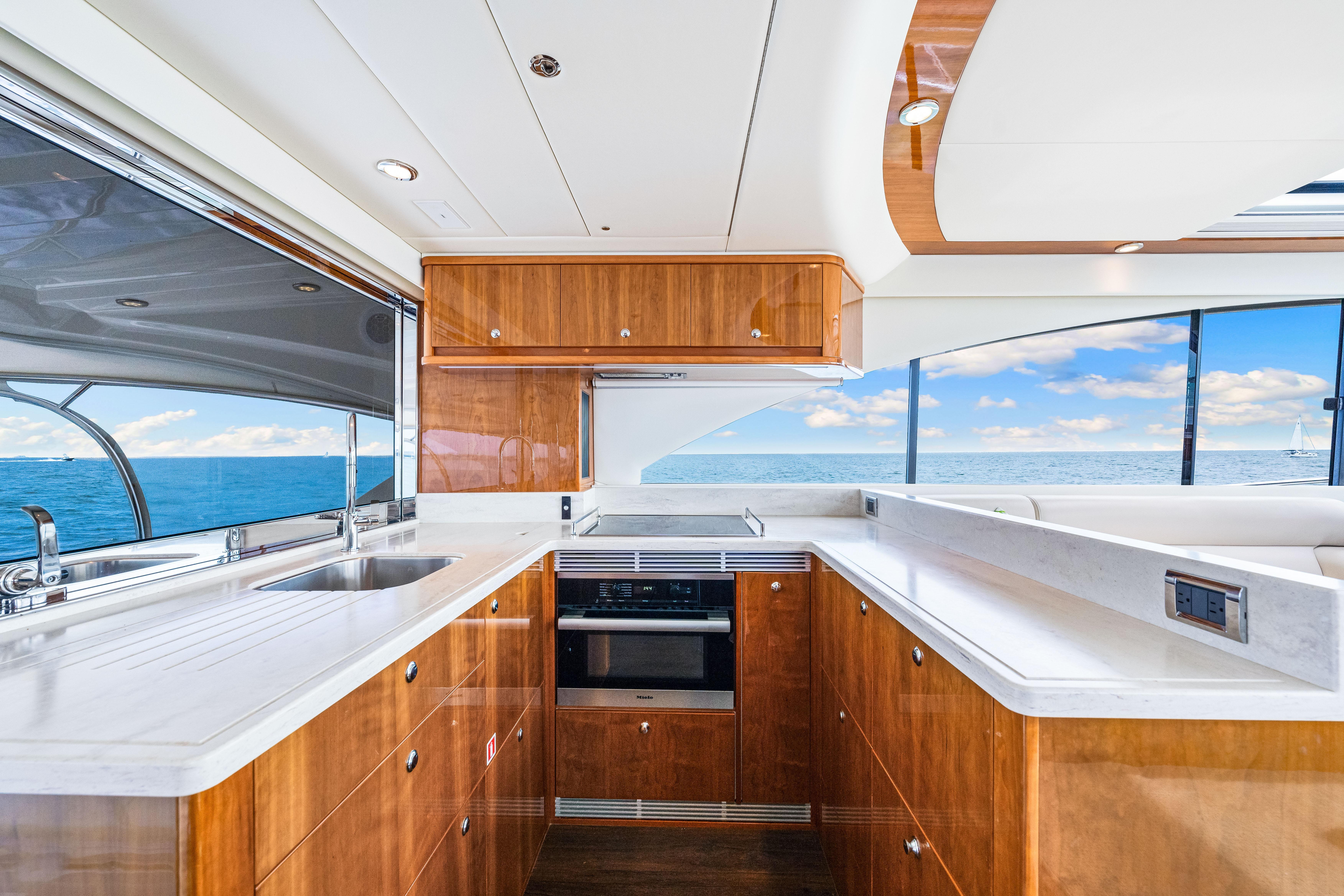 Immediately to port there’s the aft galley — a generous and efficient two-person U-space just off to one side of any fore and aft traffic. Here, a wide opening glass window brings the outdoors (and entertainment) inside.