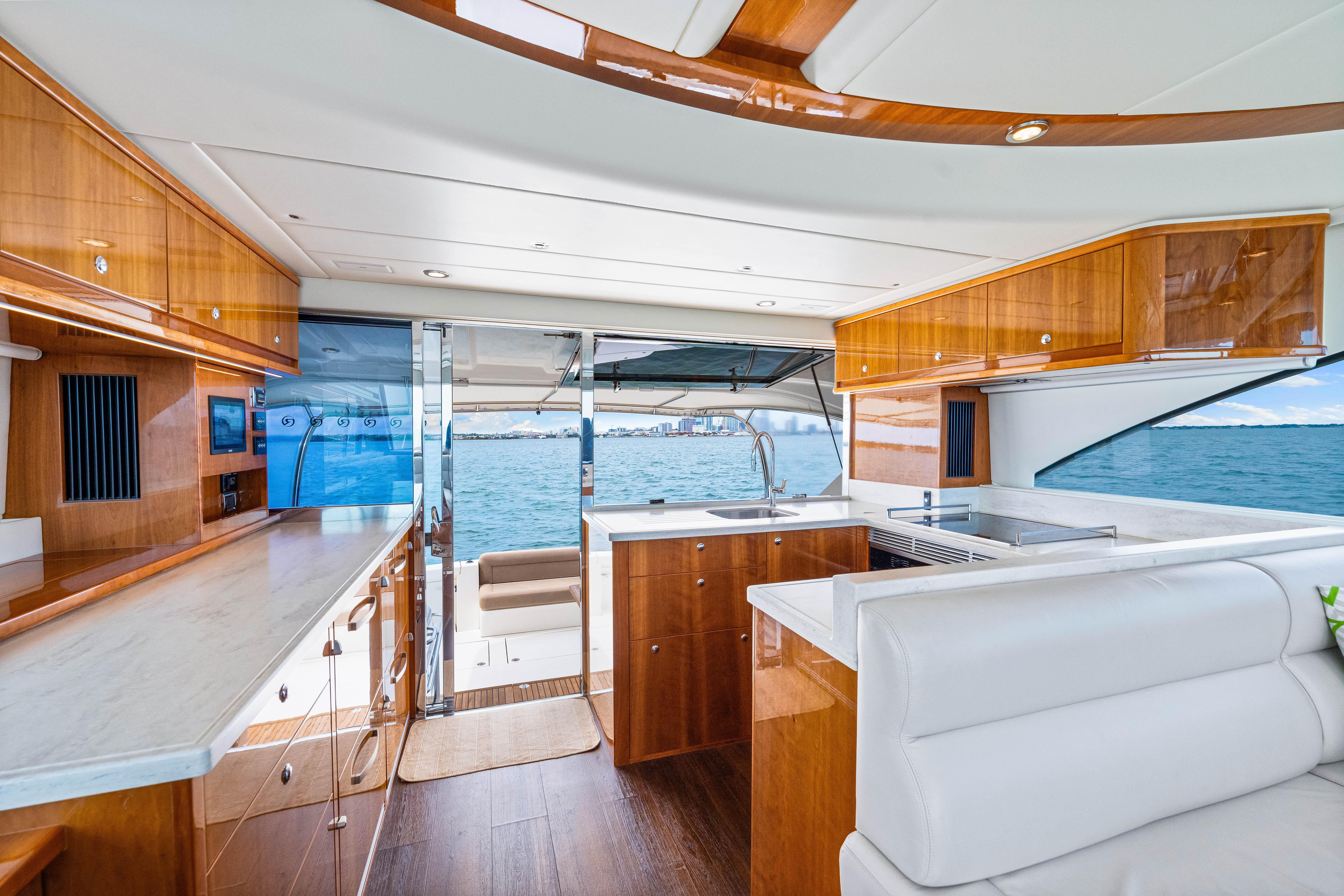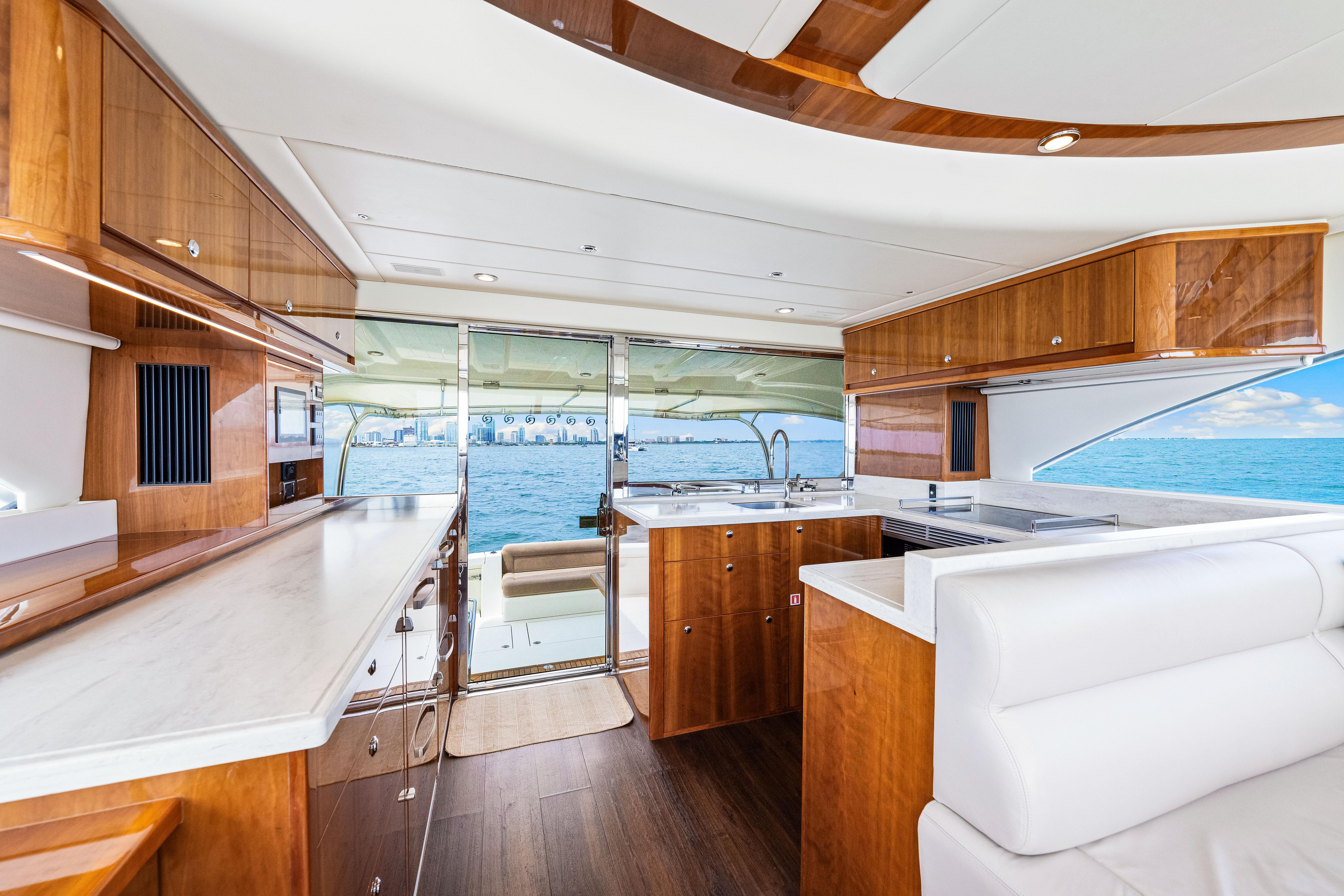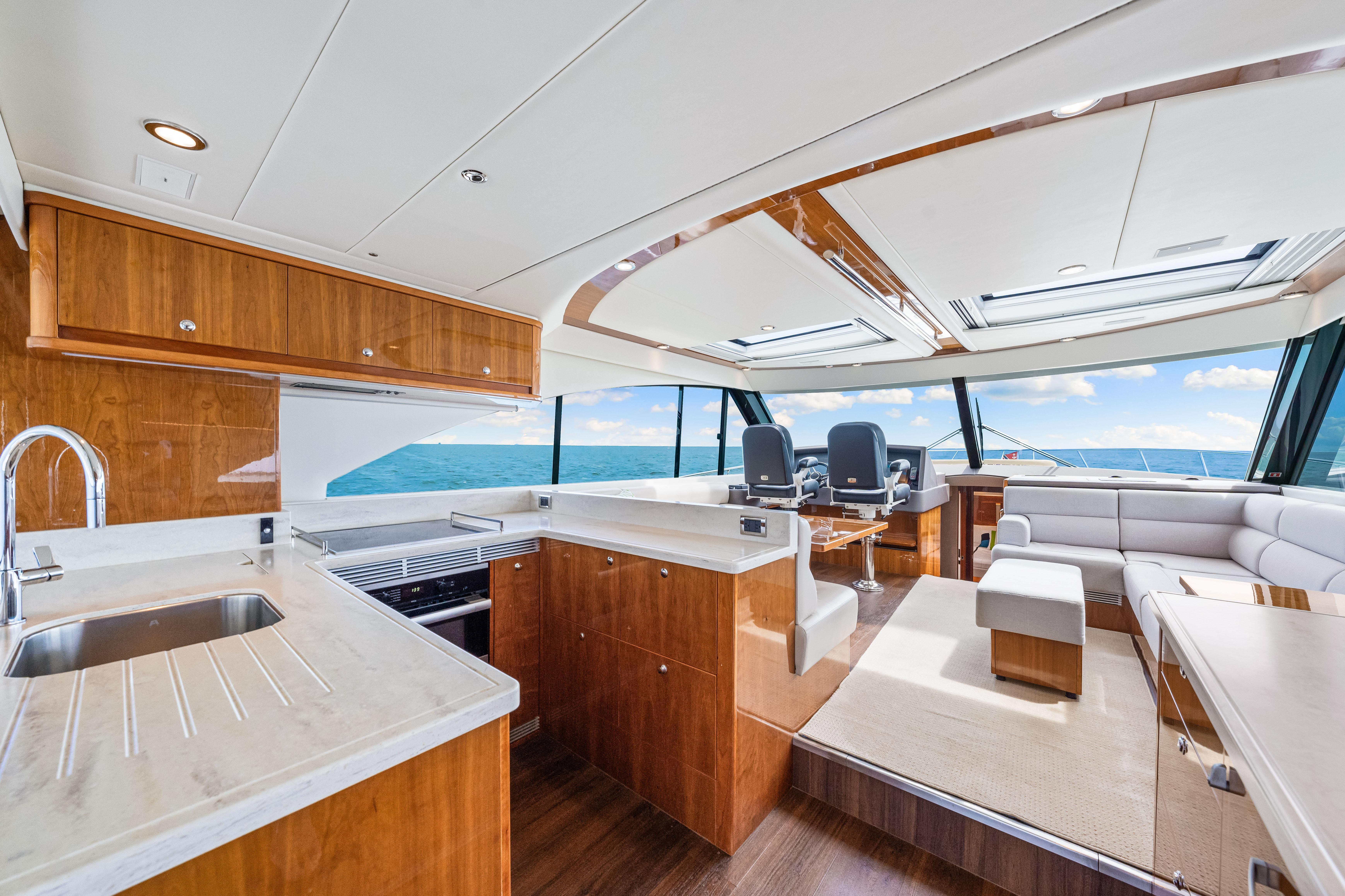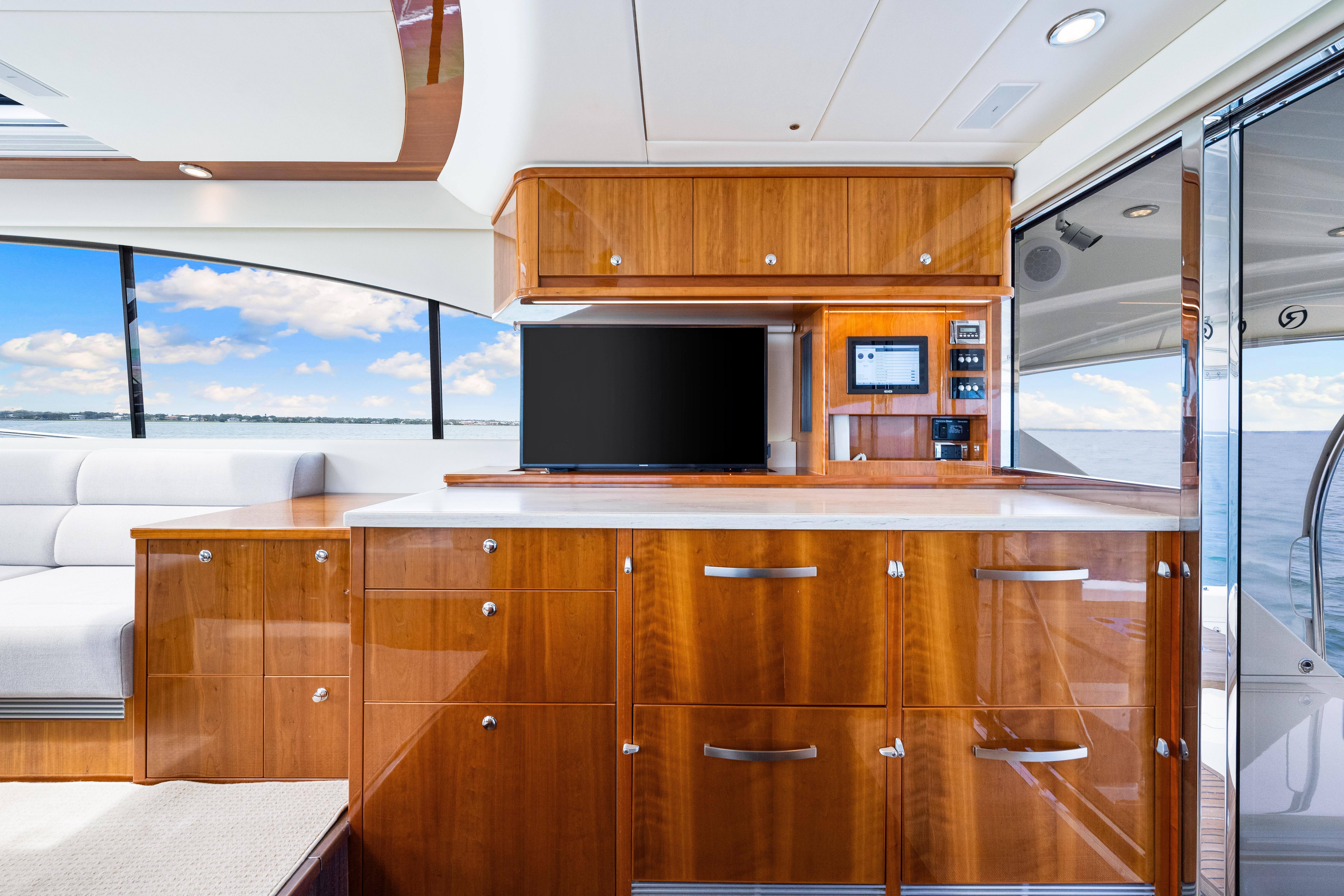 Immediately to port there’s the aft galley — a generous and efficient two-person U-space just off to one side of any fore and aft traffic. Here, a wide opening glass window brings the outdoors (and entertainment) inside.