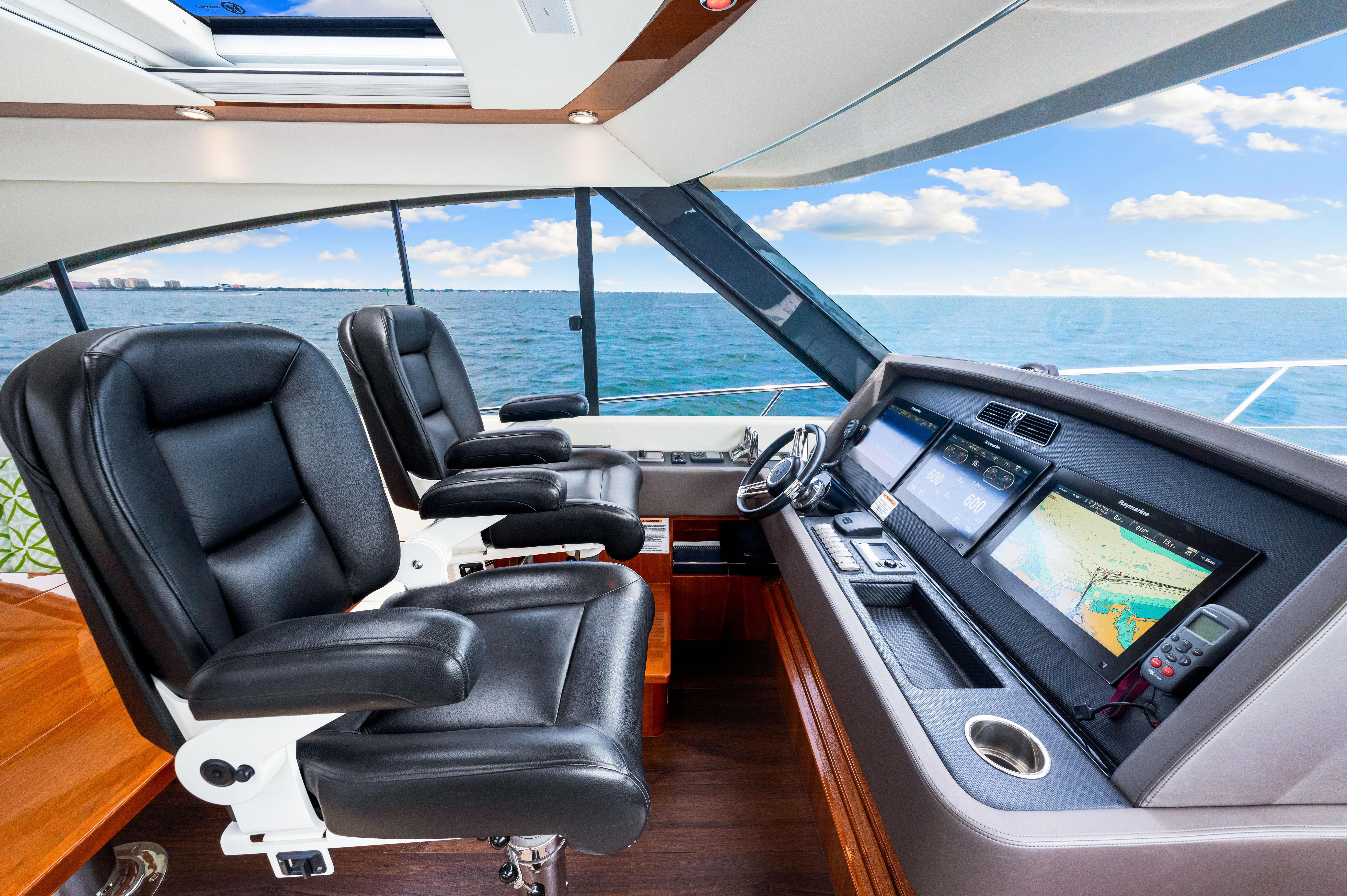 Looking out through the three massive clear, tempered glass windscreens, you’ll find excellent visibility of your beautiful yacht and surrounds. Then lower your eyes to the dash and console, which has enough room for three massive 19” multi- function display screens, as well as dedicated switches for the horn and pantographic wipers with intermittent settings, the overhead and navigation lights and also the intercom to the engine room.
