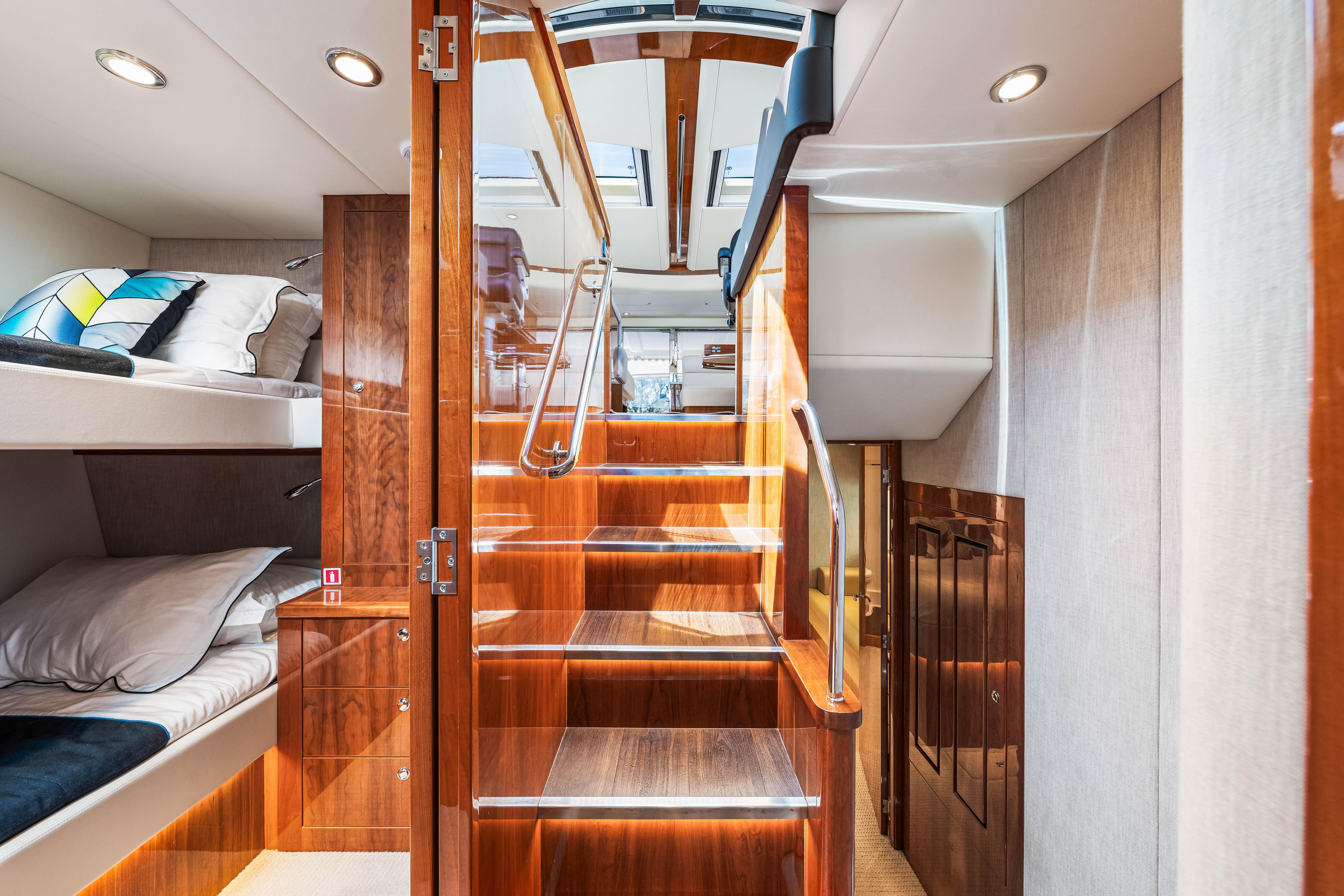 The fully integrated CZone digital switching system enhances the ease of monitoring and operation of the Riviera 575’s onboard systems including tanks, and extends centralized, touch- screen control to lighting, pumps, batteries, entertainment systems and appliances. CZone allows you to operate multiple circuits at a single touch, energizing all lighting and electrics depending on your requirements. It comes pre-programmed with three modes - entertaining”, “cruising” and “dock unattended” — and these modes can be customized to suit your individual needs. Other user-friendly features include interior light-dimming, timer controls, automated circuit control, wiper speed and wash functions. There’s also a “service” mode that shuts down all power and systems.