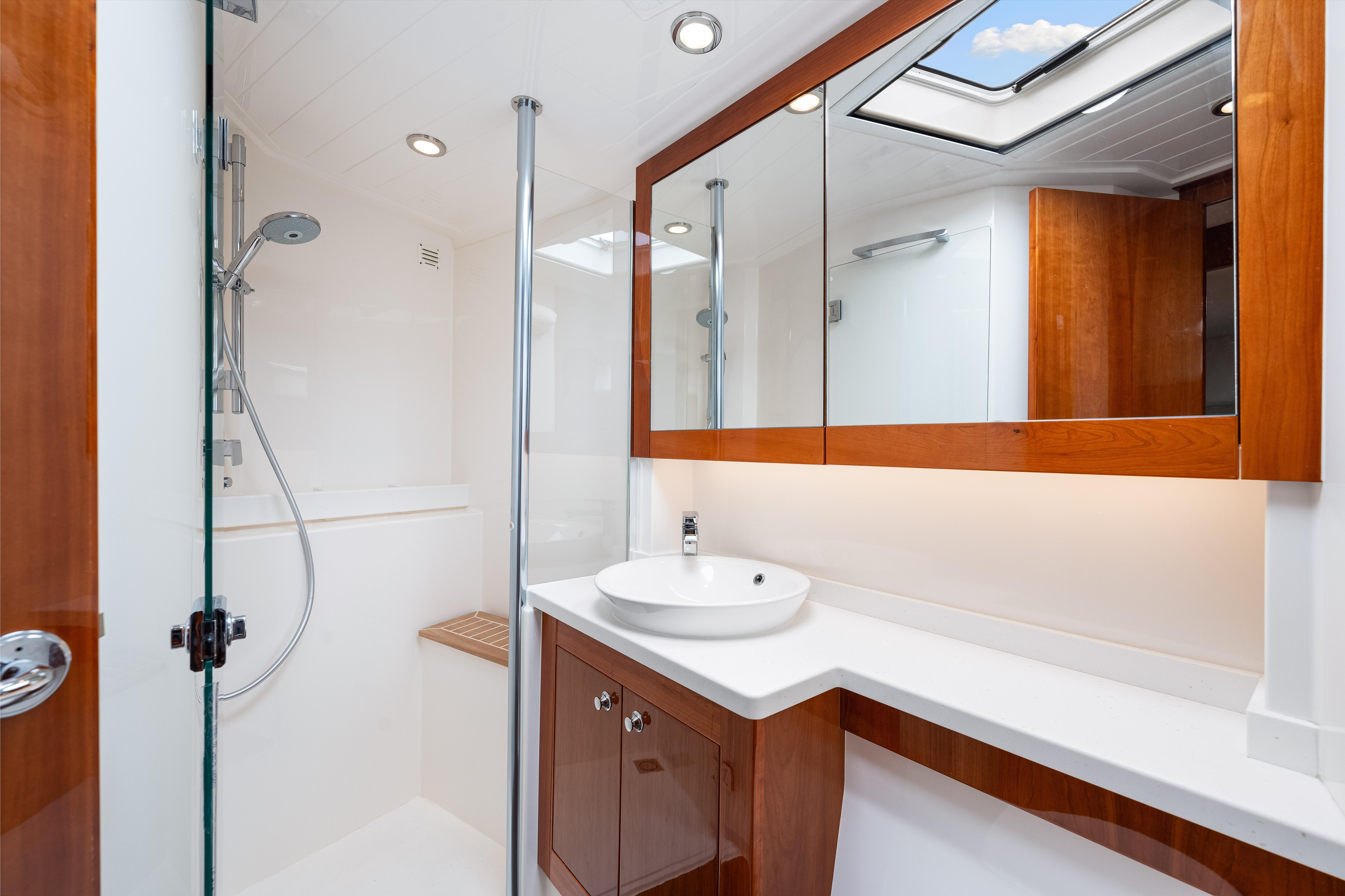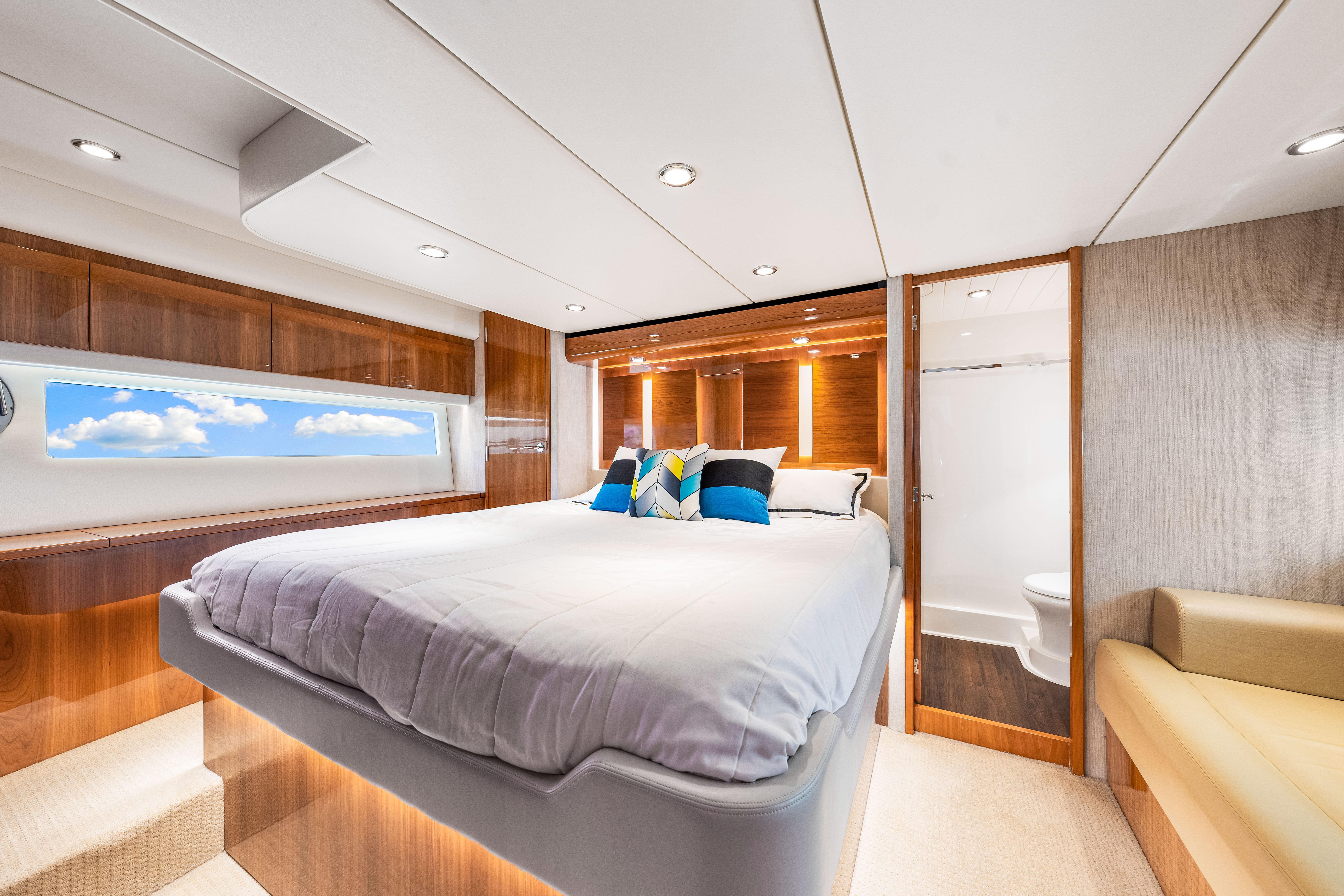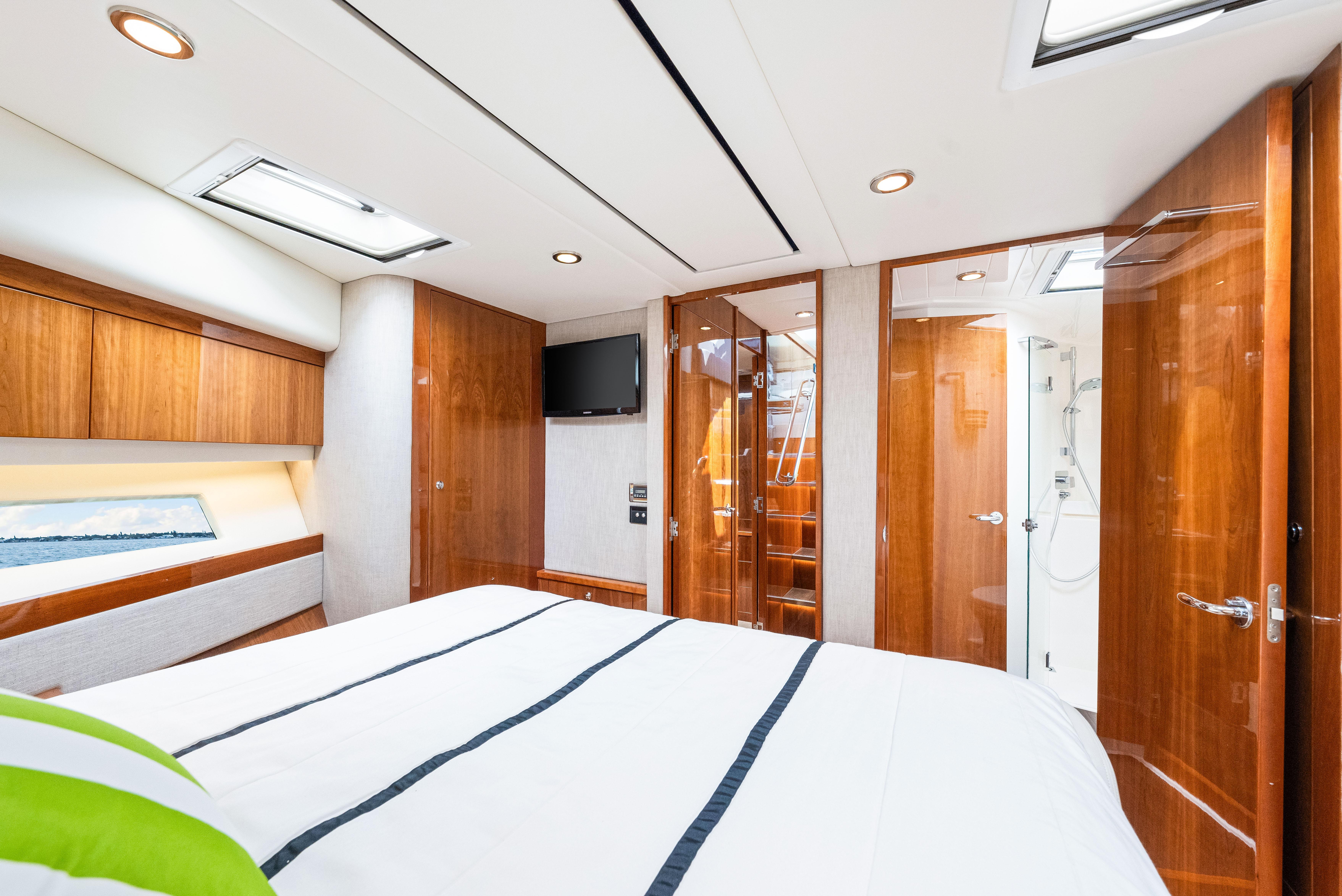 The master stateroom, defying convention for a vessel of this size, luxuriates right across the full beam. This sanctuary is accessed by its very own short, half-turn private staircase, continuing below the main companionway. The master’s king-size island bed with innerspring mattress and feature headboard detailing is set in the gentle ‘sweet spot’ right amidships, with real dancing room either side; even allowing storage cabinetry along both perimeters.