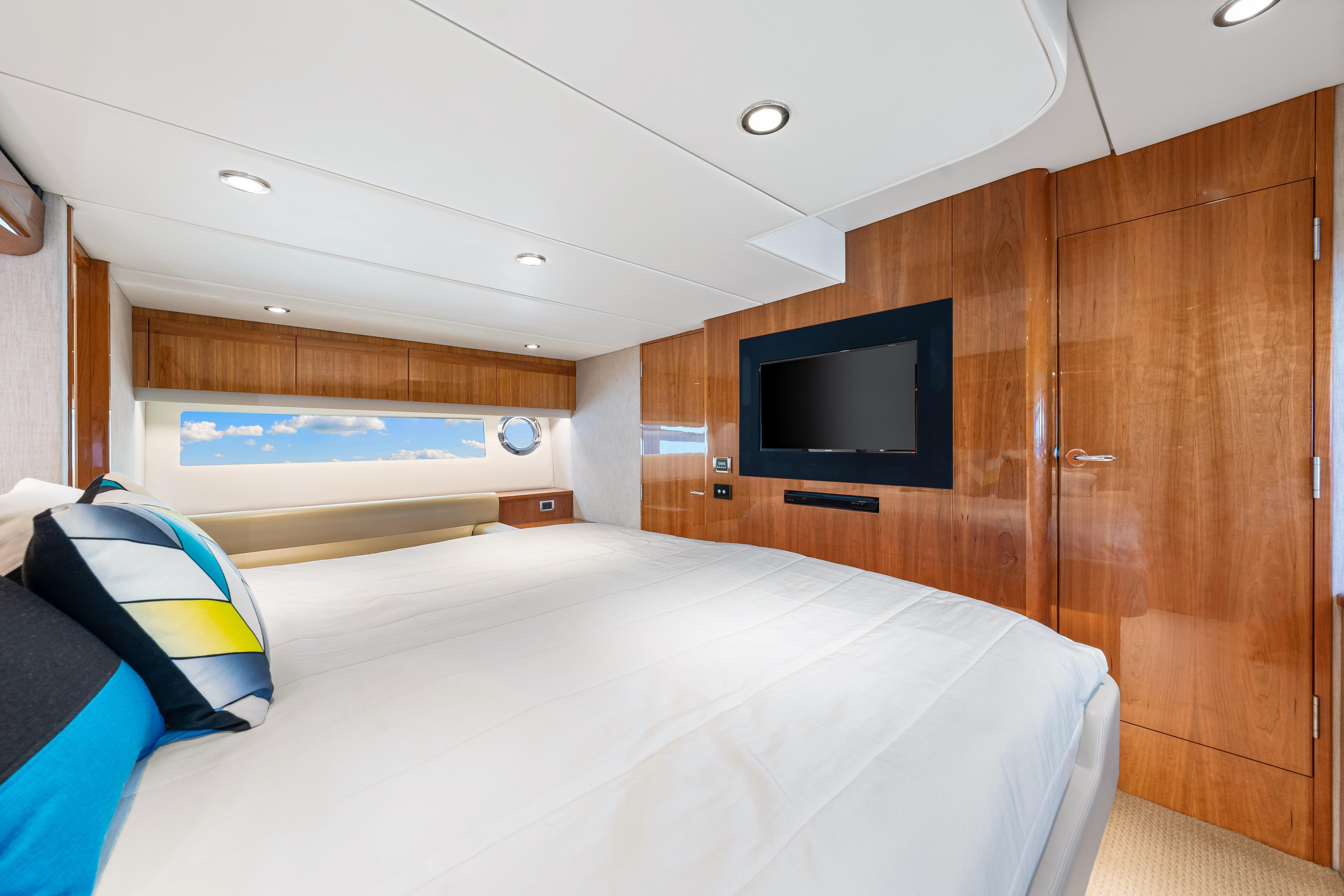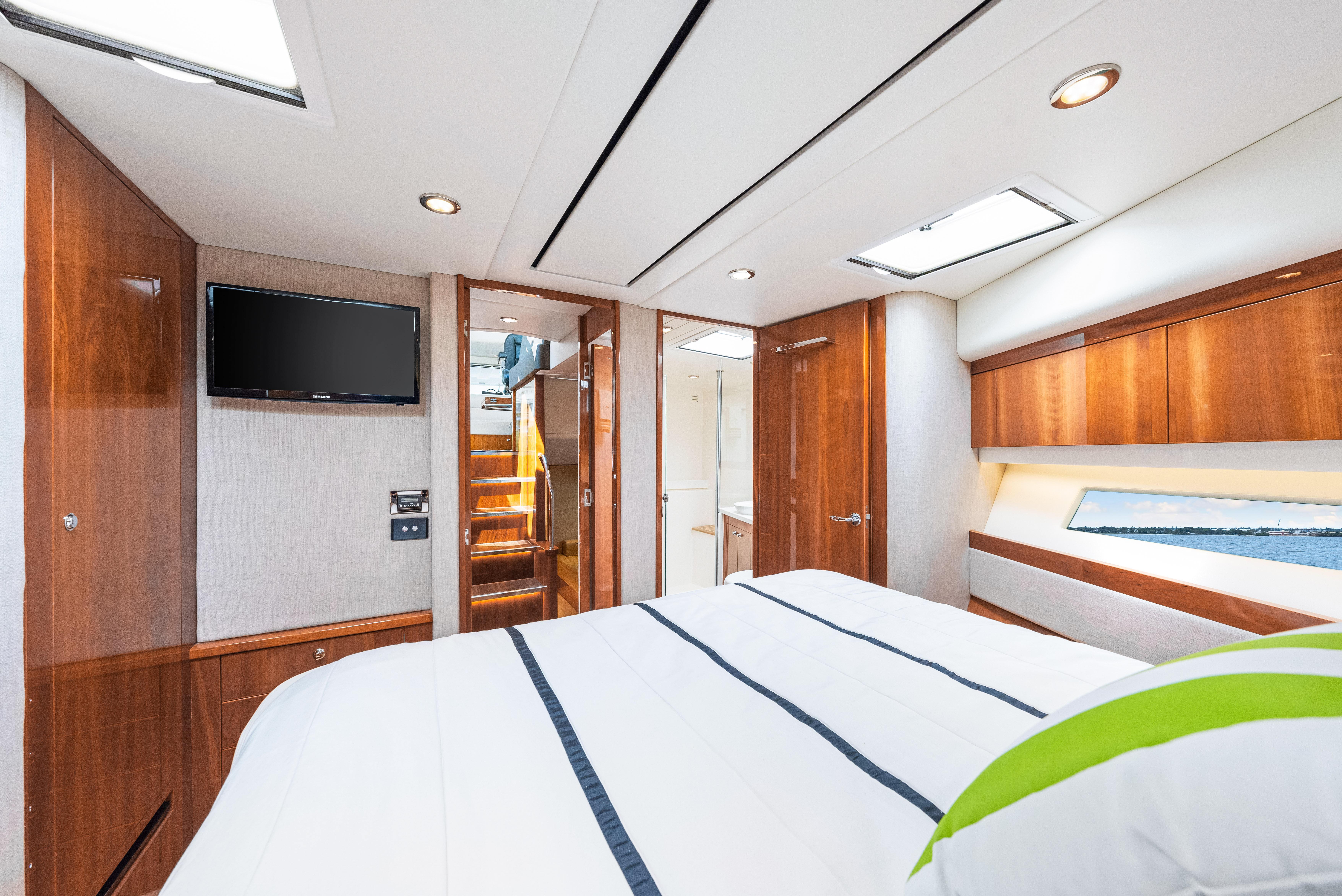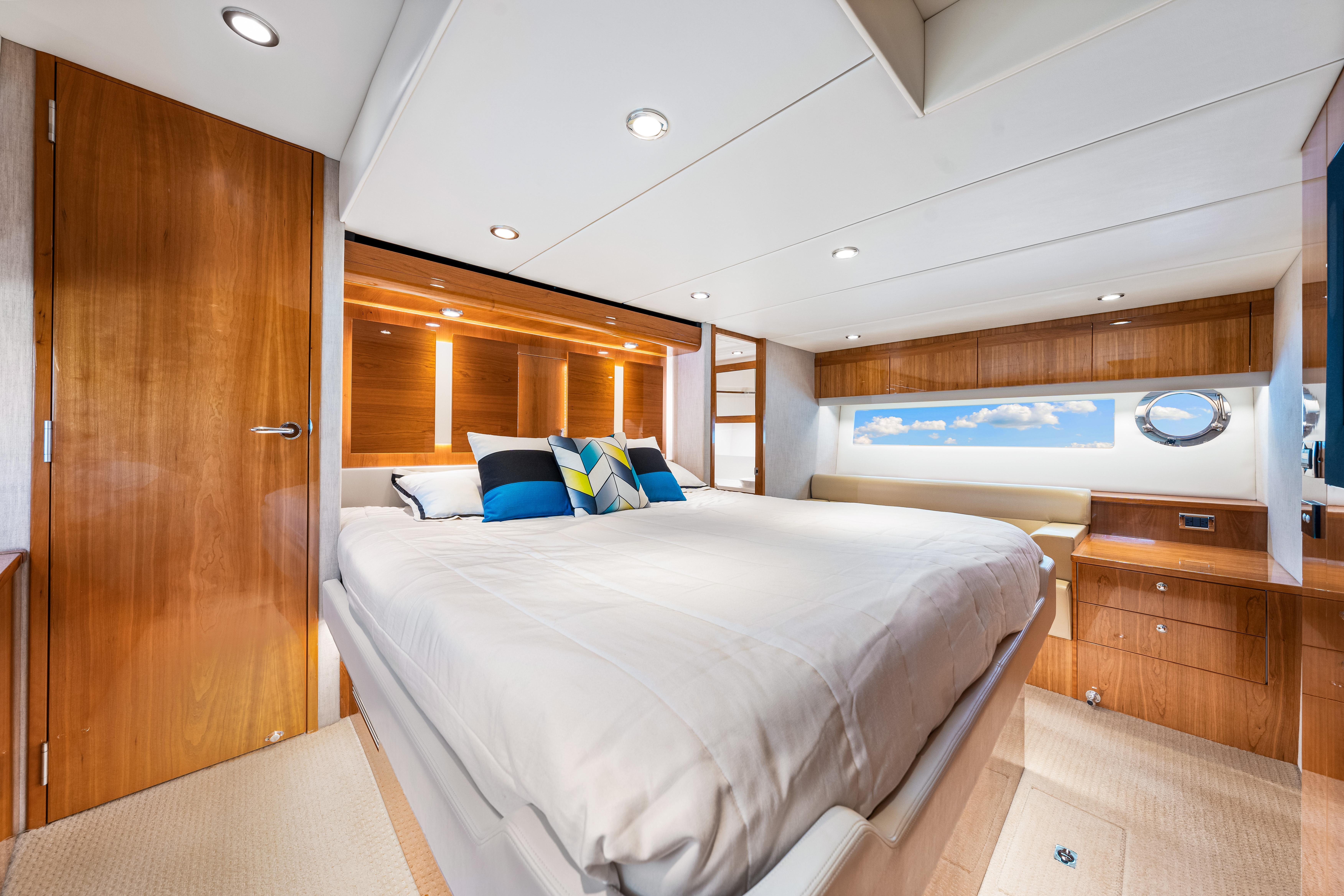 The master stateroom, defying convention for a vessel of this size, luxuriates right across the full beam. This sanctuary is accessed by its very own short, half-turn private staircase, continuing below the main companionway. The master’s king-size island bed with innerspring mattress and feature headboard detailing is set in the gentle ‘sweet spot’ right amidships, with real dancing room either side; even allowing storage cabinetry along both perimeters.